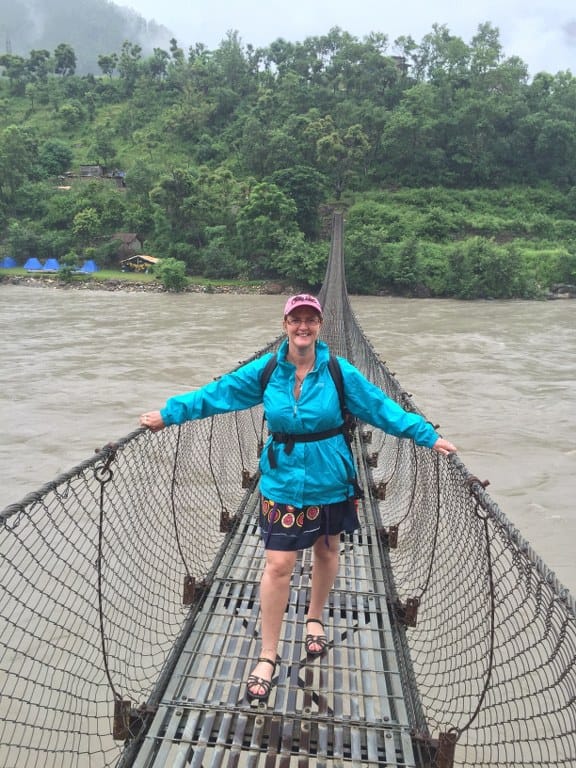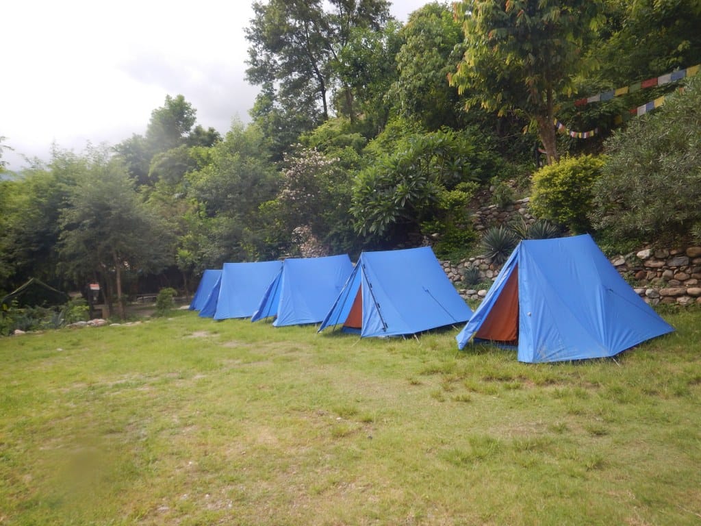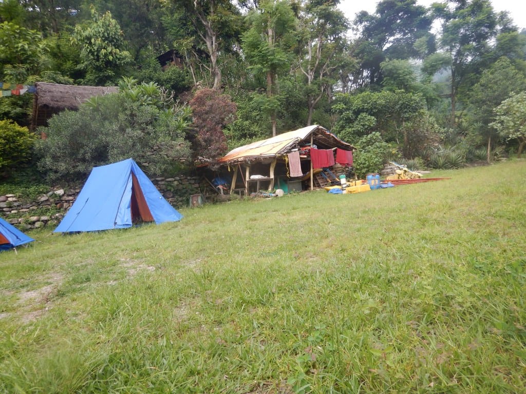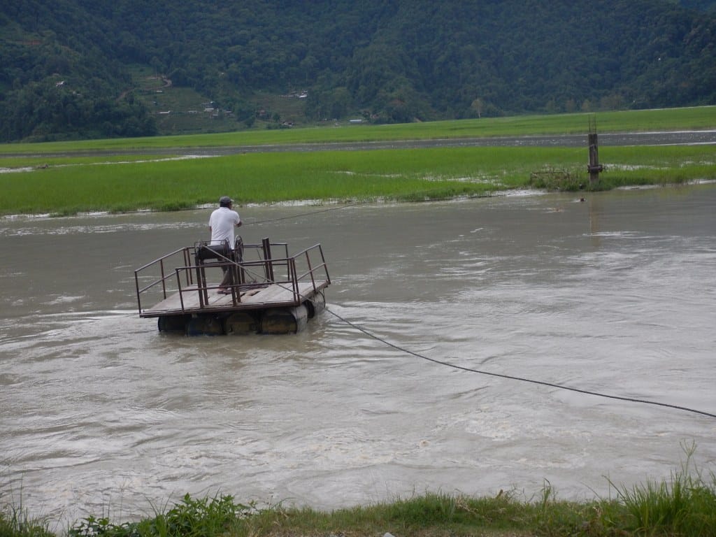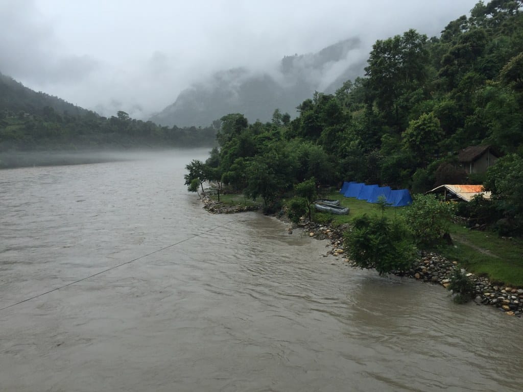 26 juli: Goedemorgen vanuit de oever van de Trisuli rivier, in de regen. Het heeft de gehele nacht, en nog, stevig geregend. Binod was bang dat de campsite weer met wateroverlast te maken zou krijgen maar dat was gelukkig niet het geval. We hebben ontbijt in de “cateringtent”. Porridge, pannekoeken, gebakken aardappelen en omelet gaan we met overvolle maag de auto weer in. Deze staat aan de overzijde geparkeerd, dus we moeten eerst te voet de Trisuli rivier weer over. Bye, bye campsite……..