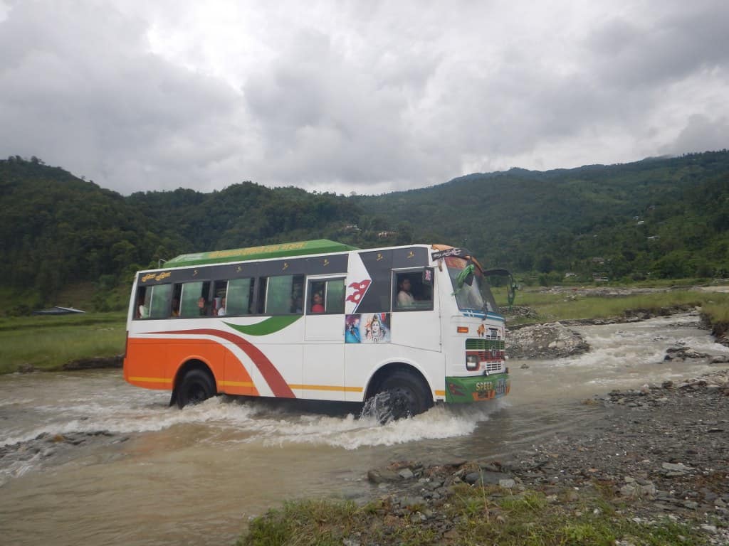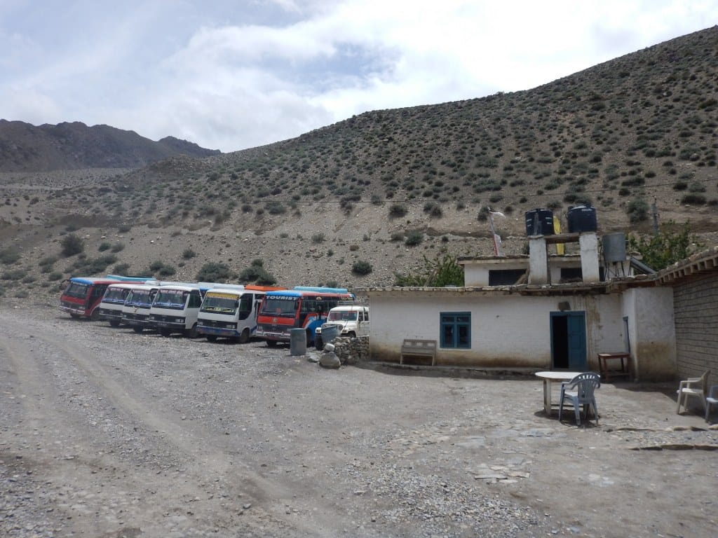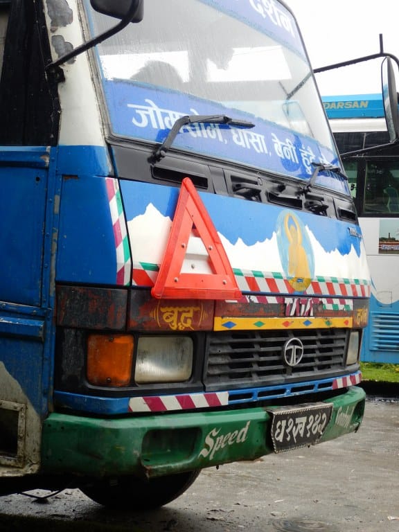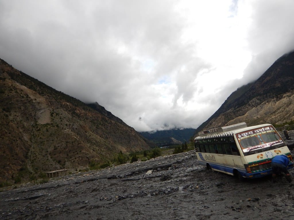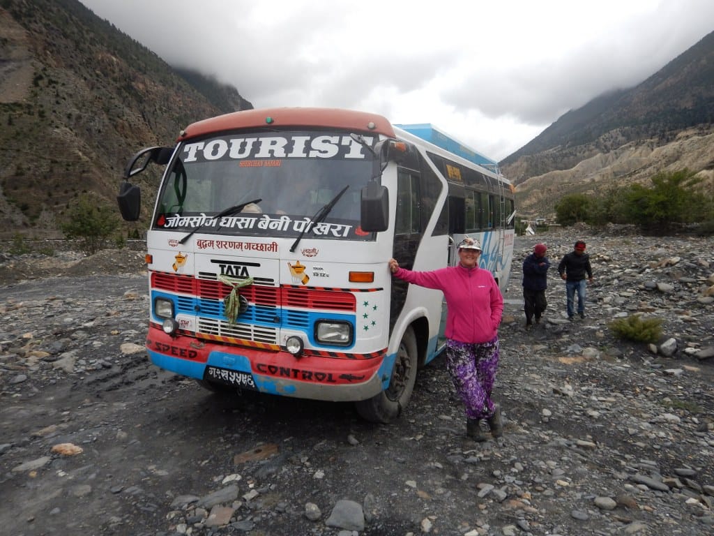 We mogen mee maar moeten er na 10 minuten alweer uit. Hier staan meer bussen en kunnen we koffie/thee krijgen (die overigens hetzelfde smaakt!). We zitten met een aantal Nepalezen gezellig in een hutje. Na een klein uurtje kunnen we met de bus naar Jomson, zoals het er nu naar uitziet een ritje van ongeveer twee uur zonder opstakels. Maar ja, niks is zeker hier en al helemaal niet met deze weersomstandigheden. Bij vertrek zaten we achterin maar we worden al snel naar voren gezet want achterin is echt niet te doen. Je vliegt in zo’n lokale bus met je hoofd tegen het plafond aan. Vooraan is het ietsje beter en kunnen we ook volgen dat we over wegen rijden die eigenlijk niet toegankelijk zijn. Wat een beleving in zo’n bus, soms ook best spannend en eng.