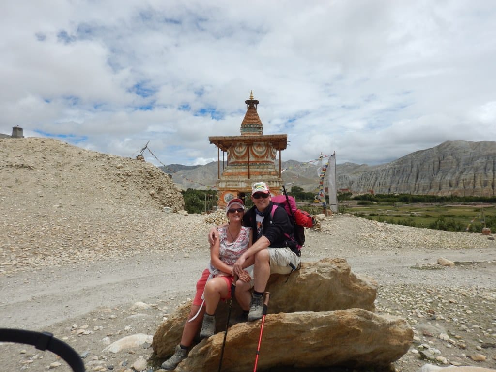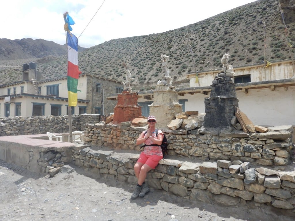 7 augustus: Goedemorgen Kagbeni. Alhoewel goedemorgen, Jolanda heeft vannacht flink moeten hoesten. Hoogte kwaaltjes zegt onze gids. We vertrekken vanuit Kagbeni op 2800 meter en we lopen tot aan Muktinath omhoog, met enkele pittige steile beklimmingen. We doen Cola met een Snicker bij Hotel Sweet Dream. Apple Pie staat steevast op de kaart maar is eigenlijk nergens verkrijgbaar, ook niet het seizoen nu en aangezien hier alles vers is. De cola houden we er wel dagelijks is, want dat is toch een goed medicijn tegen allerlei kwaaltjes. Chocolade schijnt ook goed te zijn op hoogte dus dat is dan ook geen straf.