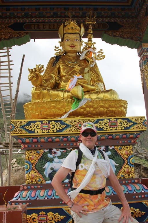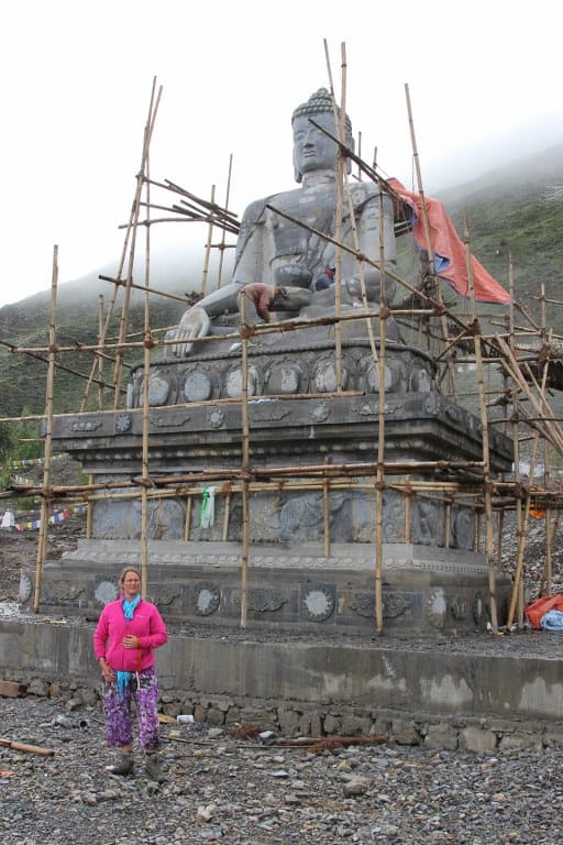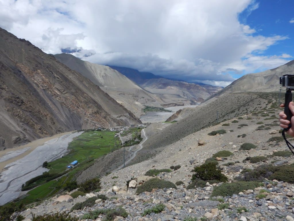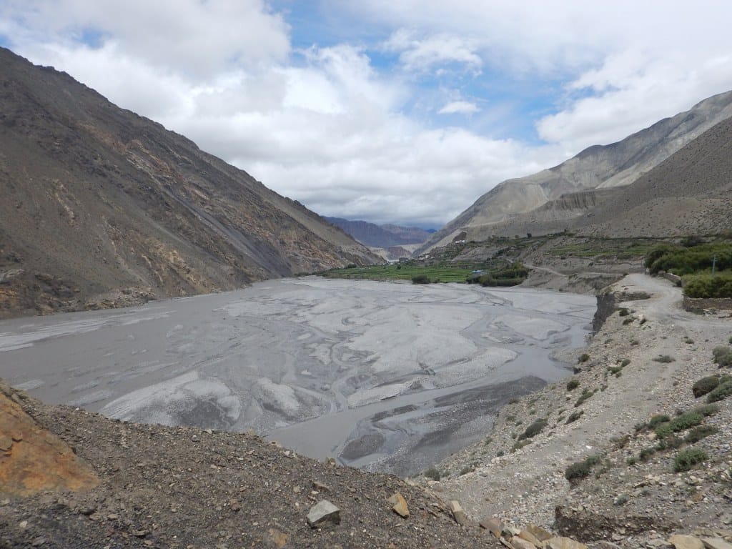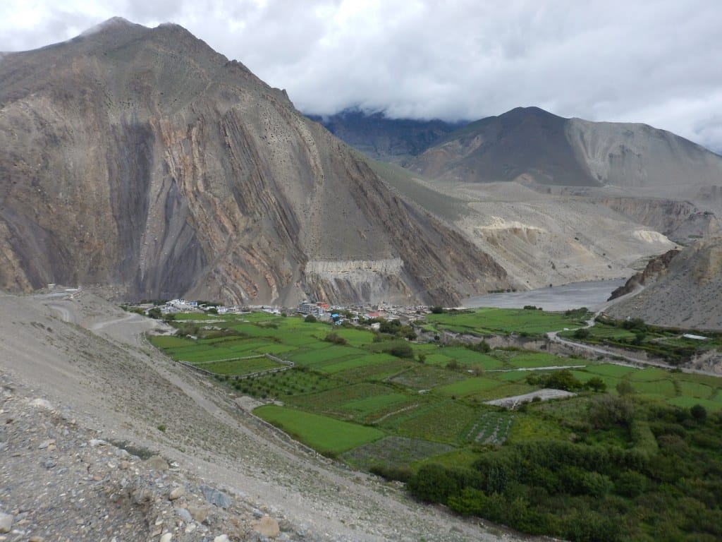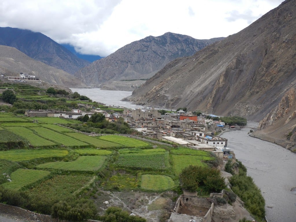 Na het bezoek aan de Muktinath Tempel gaan we ontbijten in ons hotel, kan ook wel want we hebben inmiddels honger gekregen. We waren immers om 05.45 uur alweer op. Na het ontbijt gaan we Muktinath verlaten maar niet voordat we het statuut van Guru padhma shamvhava, wat uitkijkt over Muktinath. Guru padhma shamvhava is de leraar van buddha. Aan dit statuut zijn ze al vier jaar aan het bouwen, het einde is in zicht. Het gros van de dag dalen we af, we lunchen in Kagbeni-8 en dik uur wandelen van het bergdorpje Kagbeni. Hier “kennen” we de weg, aan het begin van onze trekking, zijn we hier ook geweest. Na de lunch zouden we nog 1,5 uur wandelen tot aan Jomsom, dit werd dik 2 uur, want de rivier stond te hoog dus we moesten boven langs, nog eenmaal klimmen dus.