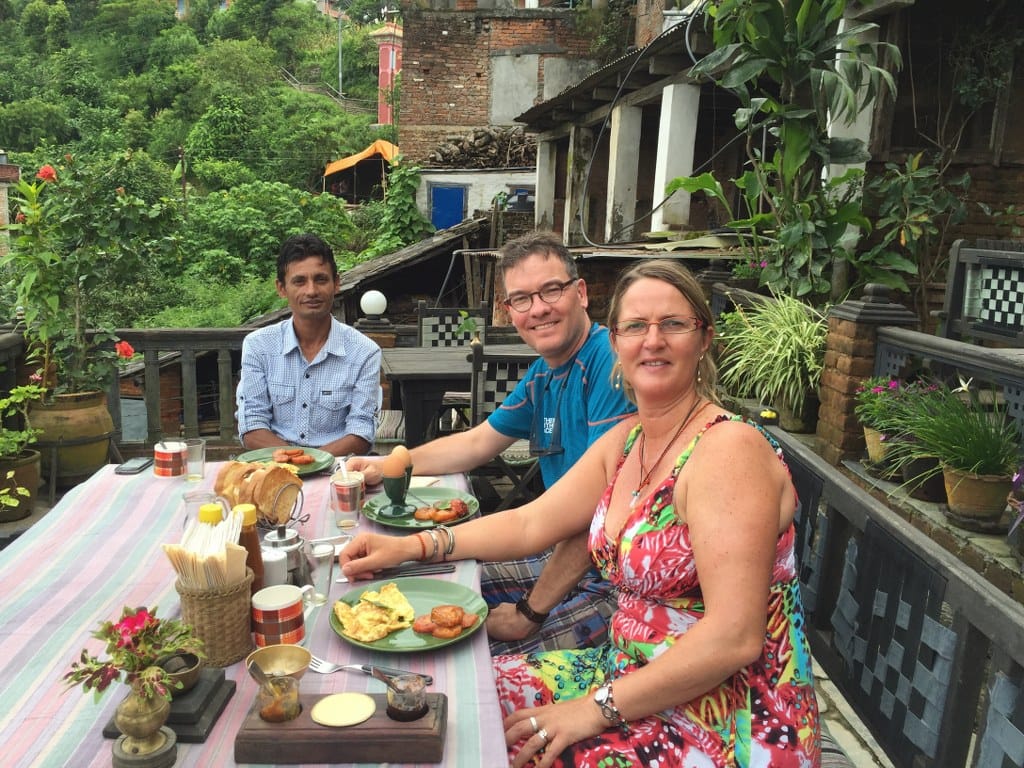We drinken een drankje en een hapje op het terras van het Old House Cafe, samen met Binod. Daarna een welverdiende douche en gaan we dineren op het terras van onze Guest house. We zitten heerlijk op het terras aan de achterzijde met een geweldige uitkijk over Bandipur. De mooiste plaats om te eten, zeker weten. Mooi om te zien vanuit deze kant dat als de elektriciteit uitvalt het gehele dorp donker wordt en nadien weer oplicht.