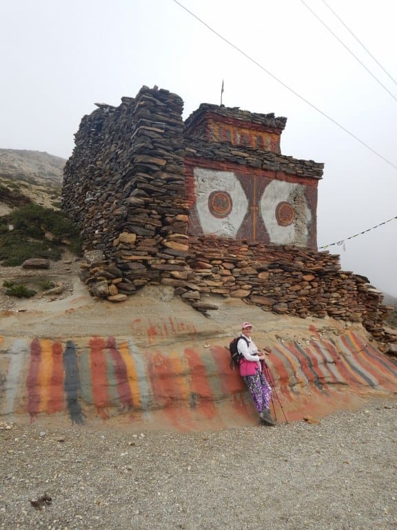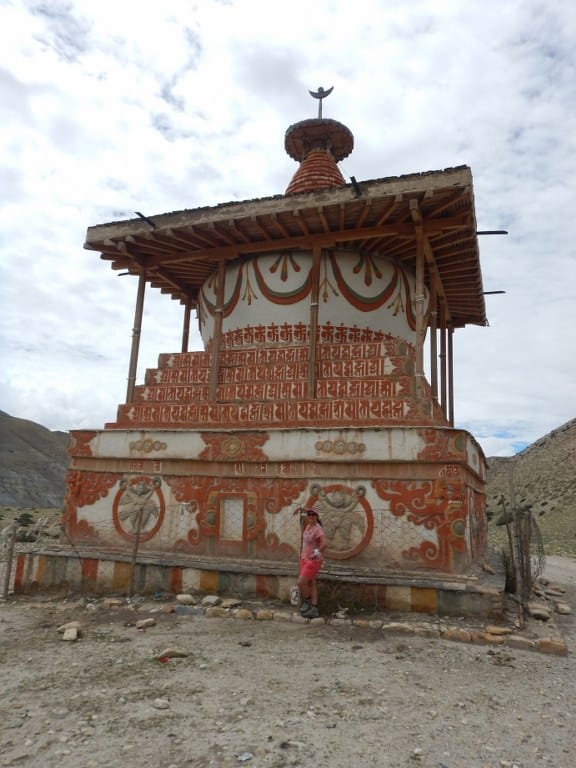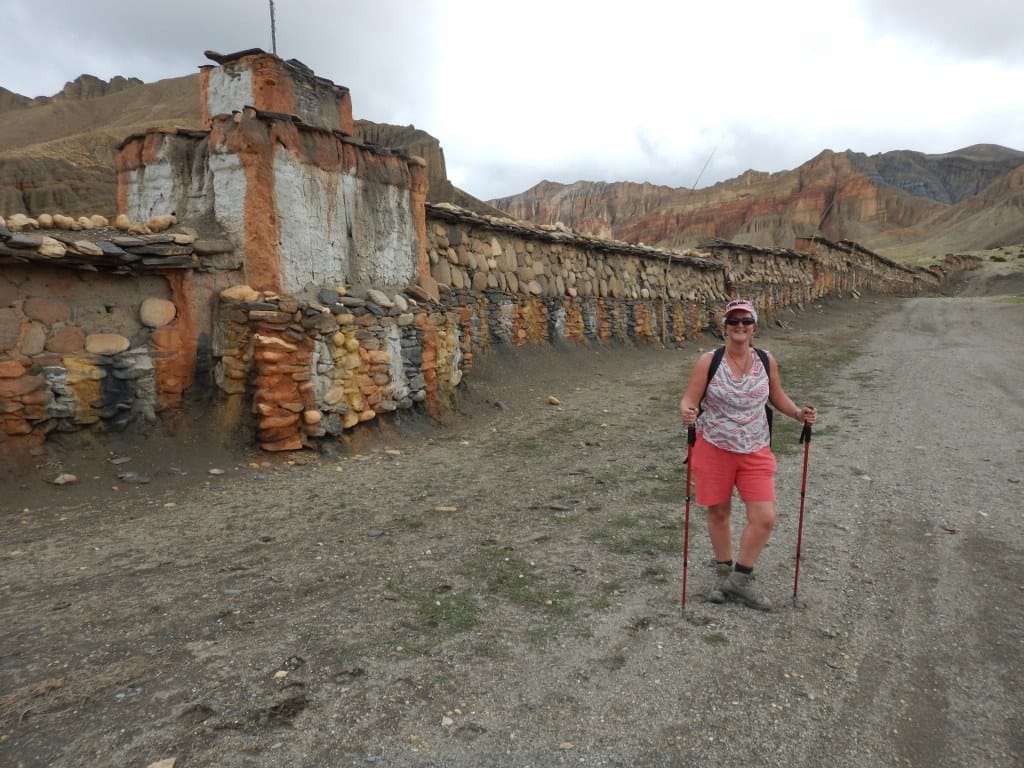 3 augustus: Goedemorgen Tsarang! Kuiten gesmeerd en weer op, stevige tocht voor de boeg naar Lo Manthang. Voornamelijk wandelen op hoogte, met net voor Lo Manthang nog een piek van bijna 4000 meter. Wederom door rivieren en prachtig berglandschap. Mustang is GEWELDIG! Halverwege Tsarang en Lo Manthang is een stupa gebouwd, we houden daar een pauze want onderweg komen we vandaag geen andere plaatsjes meer tegen. Bij elke Stupa zijn afbeeldingen van beesten, tekens en/of mensen terug te vinden. Meestal hebben deze een betekenis maar het is niet altijd geheel duidelijk waar dit precies voor staat. Dragon – Protection (in bijna alle gevallen aanwezig), Horse – Welcome to Nirvana, Elephant, Garuda (half animal half women) – Vehicle of Vshinu, Ying Yang. De evergreen, time-out en sultana komen inmiddels de neus uit maar we zijn erg blij dat we die voldoende meegenomen hebben. Dagelijkse behoefte tijdens deze pittige trekking, veel van dit soort dingen zijn hier echt niet te koop. Pringels wel overigens alleen die blijken nadien 2 jaar over datum te zijn. Tja……..Net voor Lo Manthang, ziet Jolanda nog een “regenboog”. Hoe kan dat nu met dit weer? Blijkt een Halo (lichteffect) te zijn, een bijzonder natuurverschijnsel wat niet overal waarneembaar is.