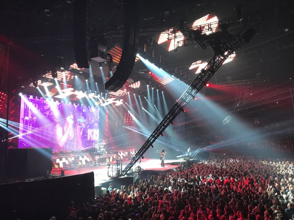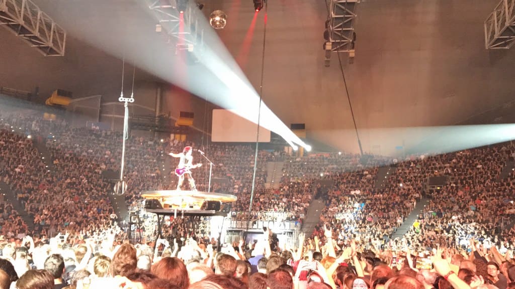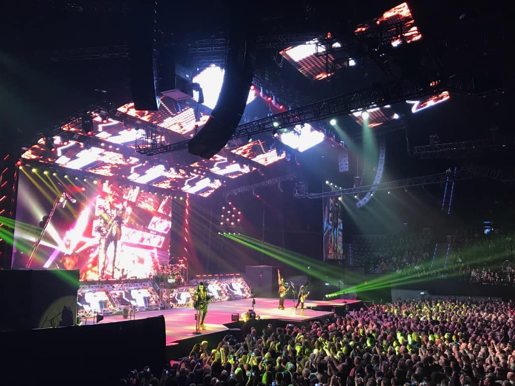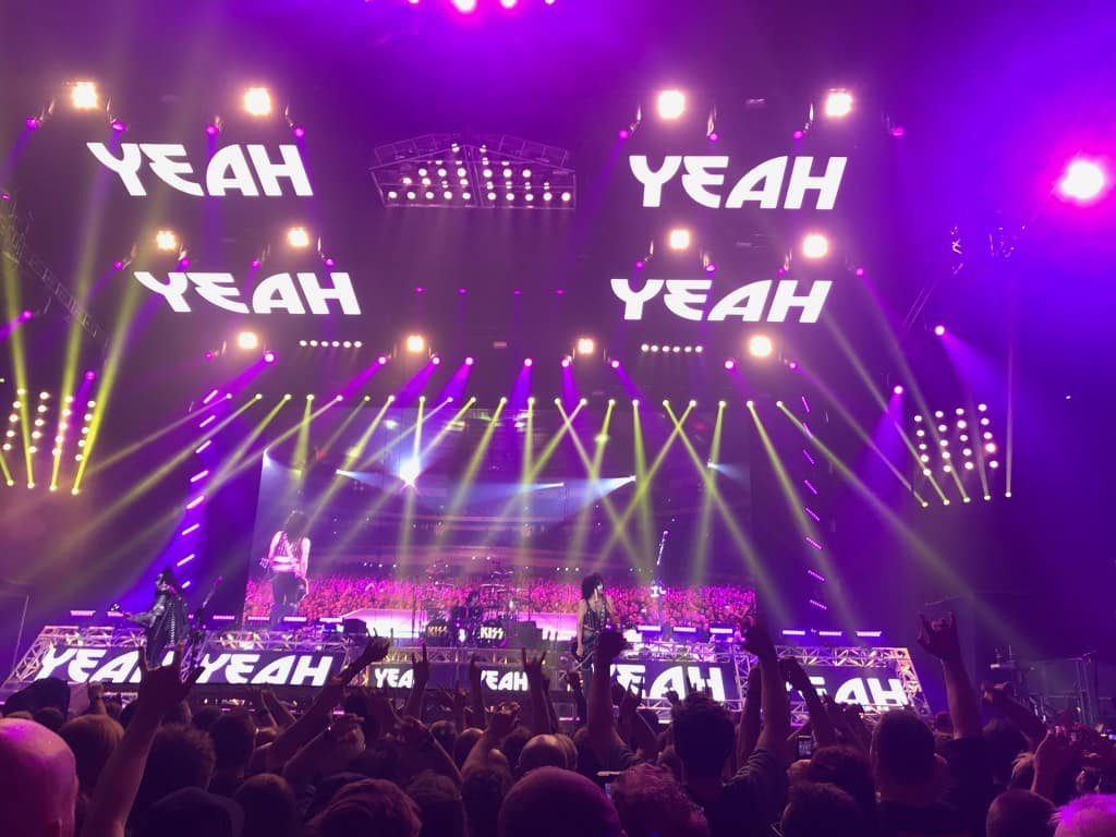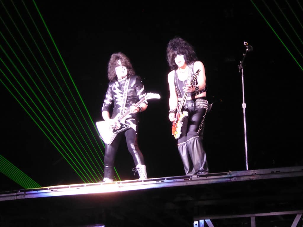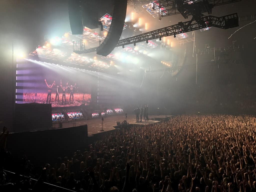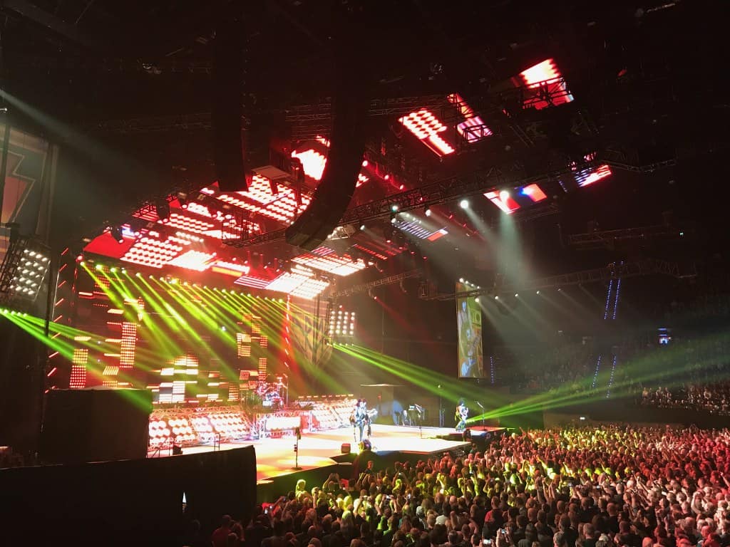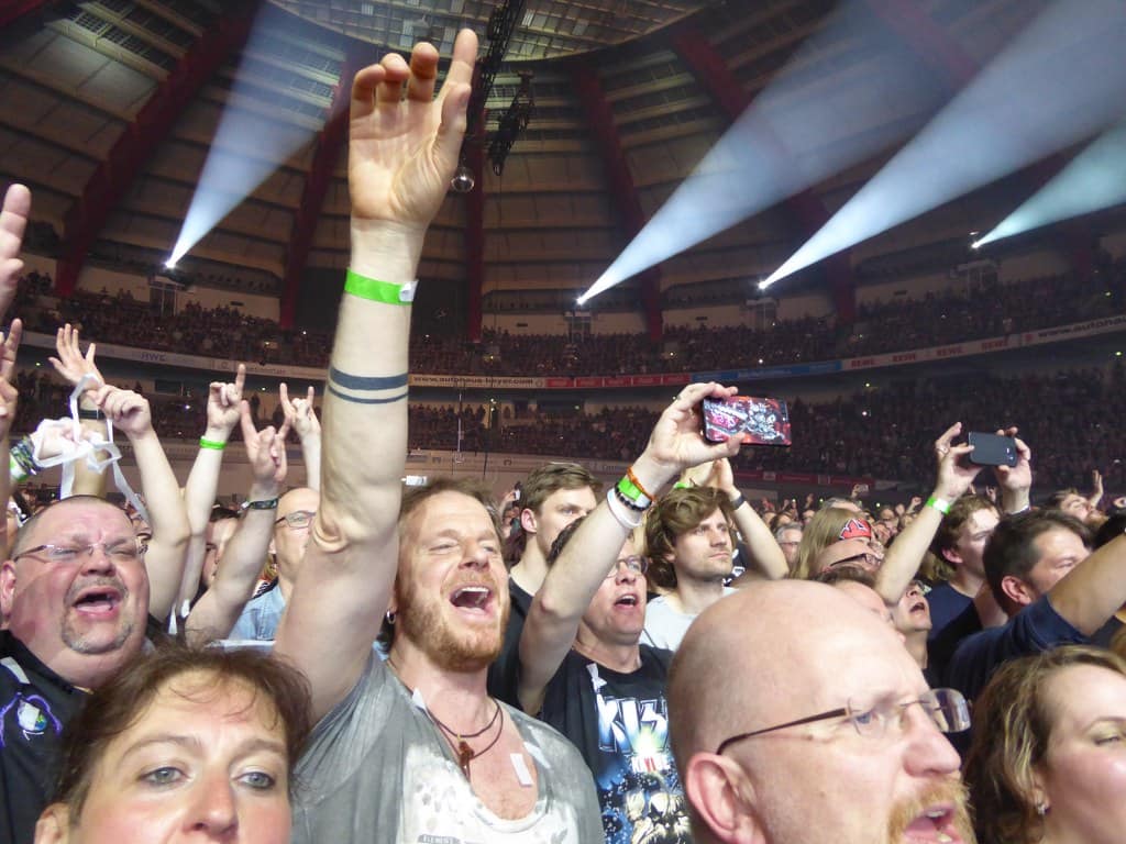 Geen armen waarin Gene en Tommy de zaal in draaien, waarschijnlijk kan dat hier niet vanwege de dakconstructie? Tijdens Lick it up dus ook geen rizers in het middens waarop Paul en Tommy omhoog gaan. Deze rizers staan nu links en rechts. Gaaf maar niet zo gaaf als die armen die de zaak in draaien! Kijk HIER voor de setlist van deze avond. Nog ff hello zeggen tegen Raveneye, we zien er bekend uit. Yep, dat klopt! We waren er gisteren ook, nog ff en we worden echte bekenden. Tot in München jongens!