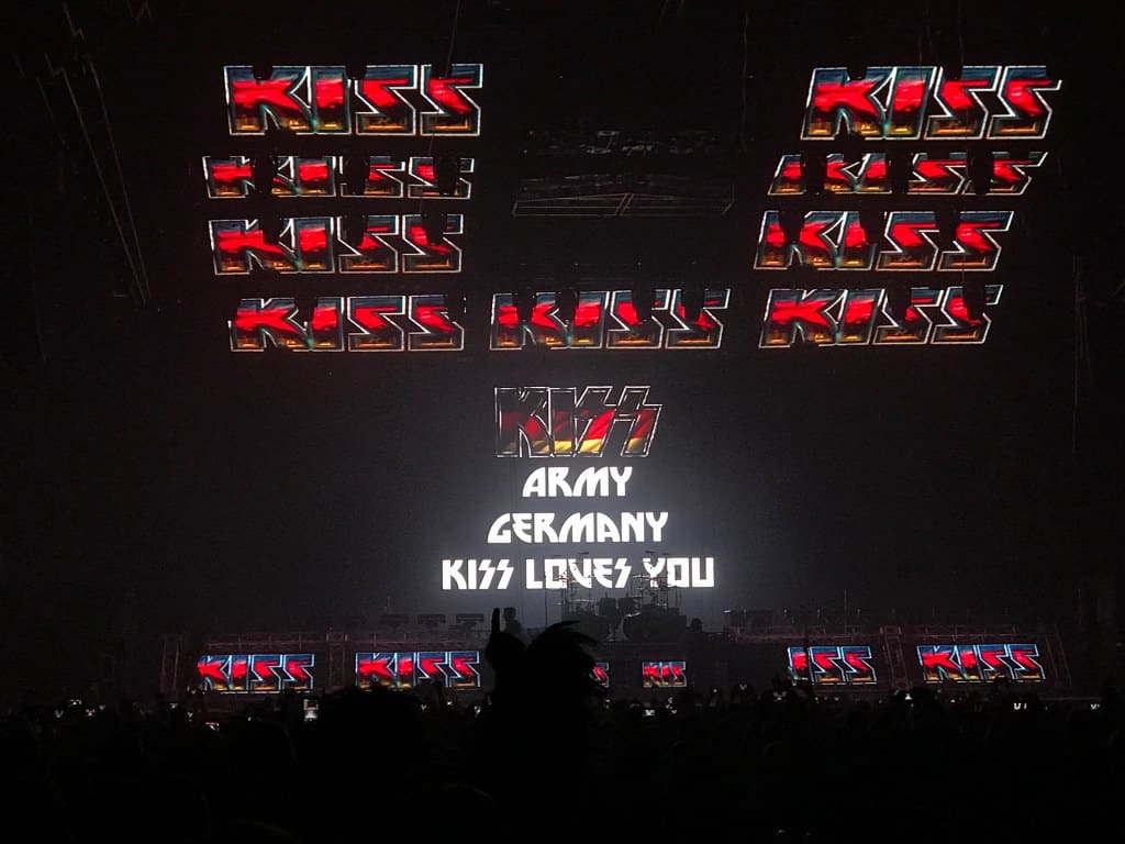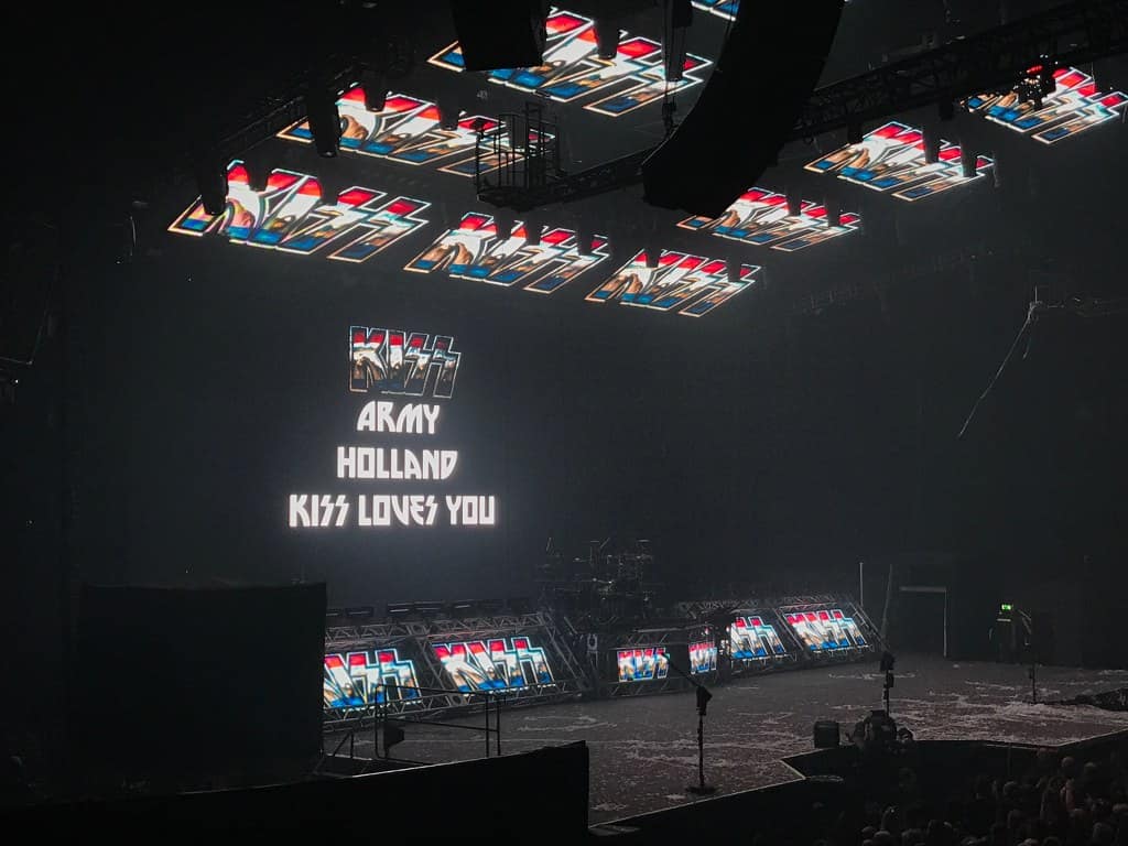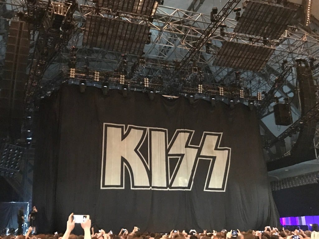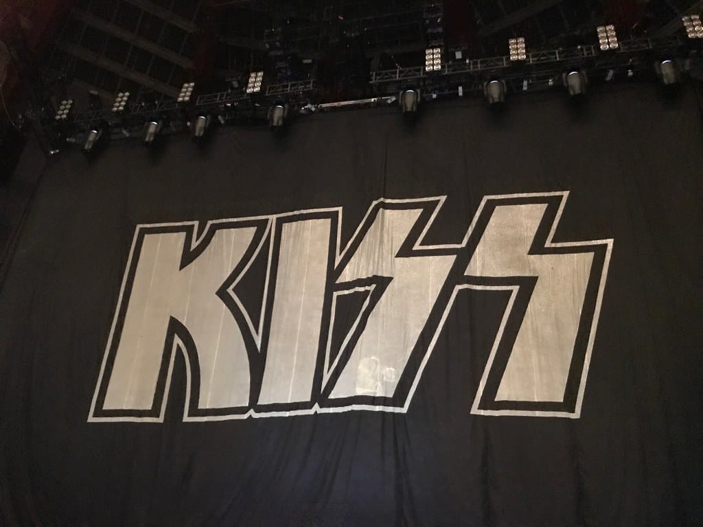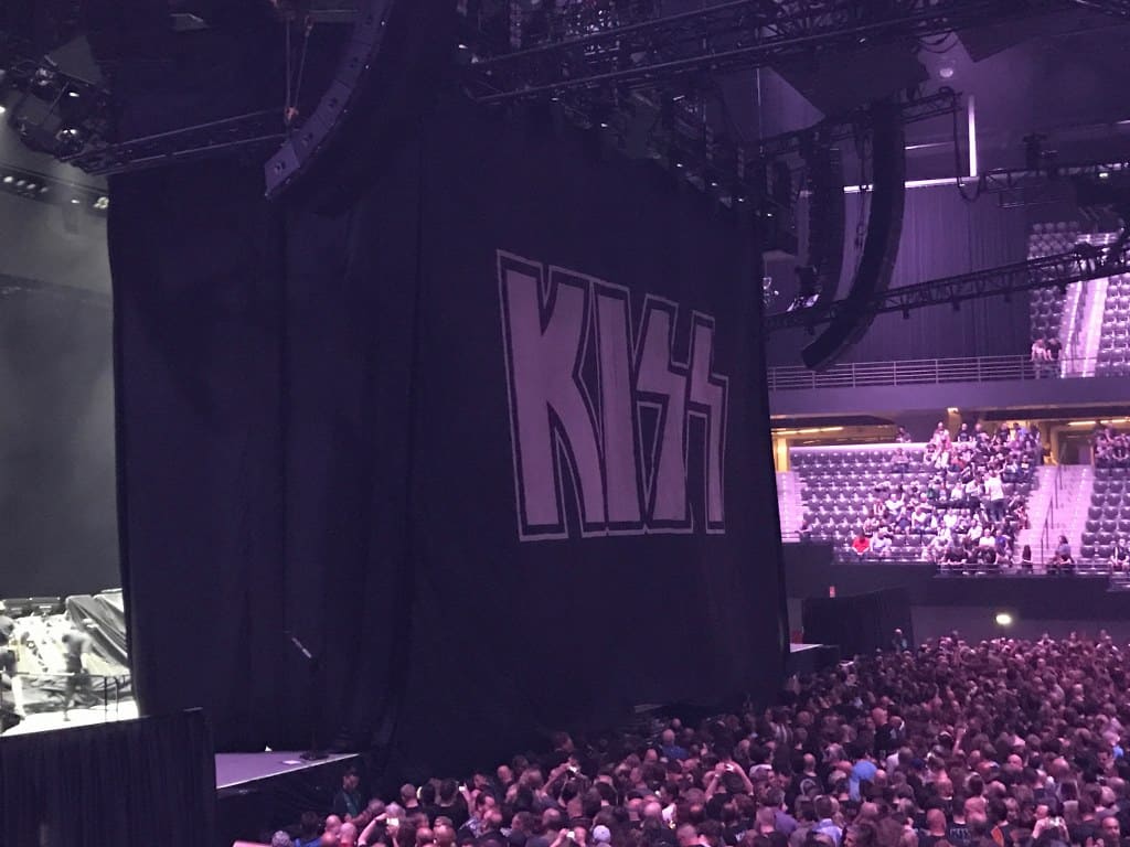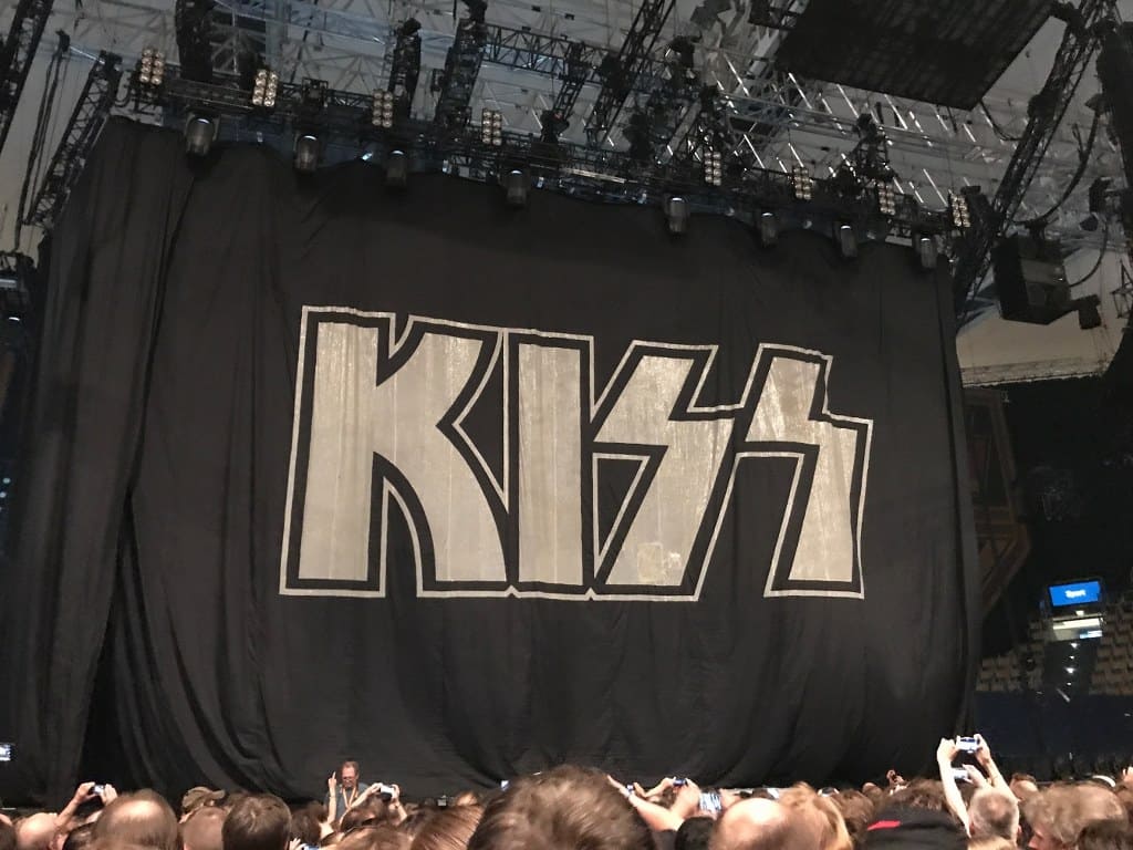 Dit doek hebben we vaker gezien…… Tis weer wachten tot het doek naar beneden zakt. 21.15 uur is het weer zover, knallen! We staan echt perfect, het geluid is op deze plaats echt een stuk beter als geheel voorin. Wat tevens opvalt is dat Gene alweer een stuk beter klinkt en fitter oogt dan gisteren in Dortmund. Paul’s stem is vandaag ook op orde, beter dan gisteren. Op naar een TOP avond dus1