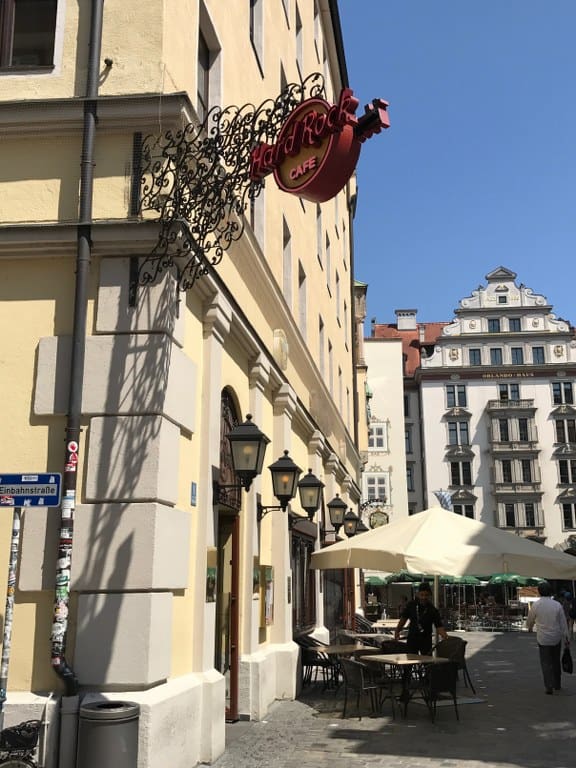 Ook de maag begint weer wat te knorren en aangezien de Hard Rock cafe nabij is, lijkt me dat een prima lunchlocatie! En natuurlijk is d’n Gene ook weer aanwezig…….. En omdat het weer KISS dag is, mag ik een biertje hebben bij de lunch. Ik ben niet de enige maar dan ook in Duitsland! Souveniertje voor mezelf, ach ja, je moet jezelf ook af en toe eens kietelen……..