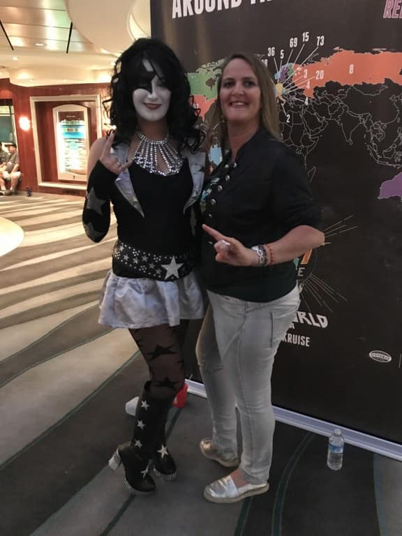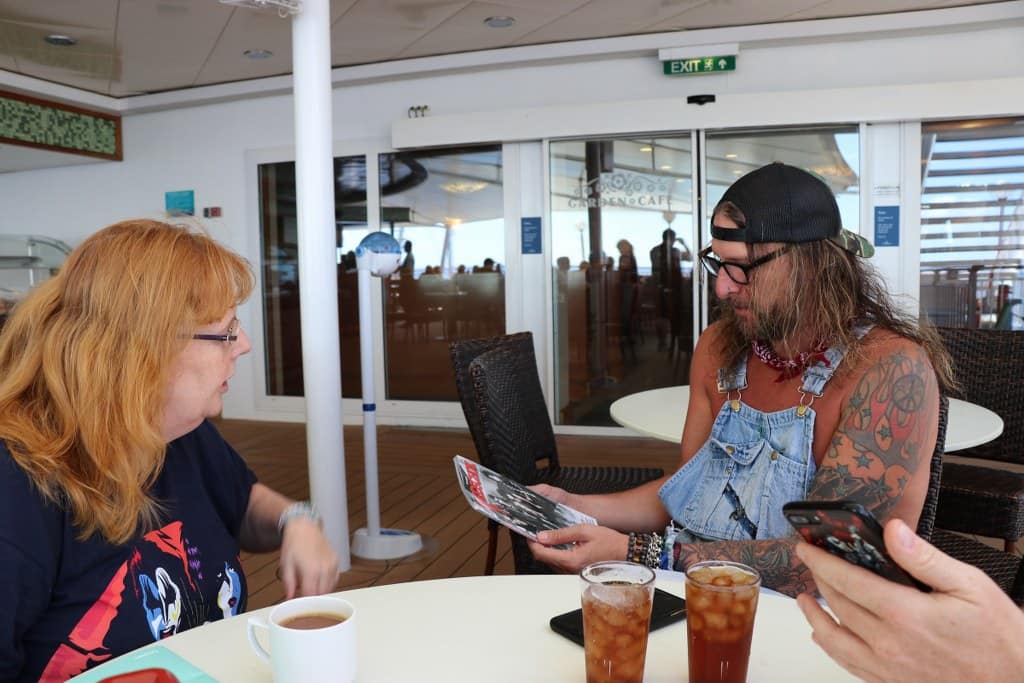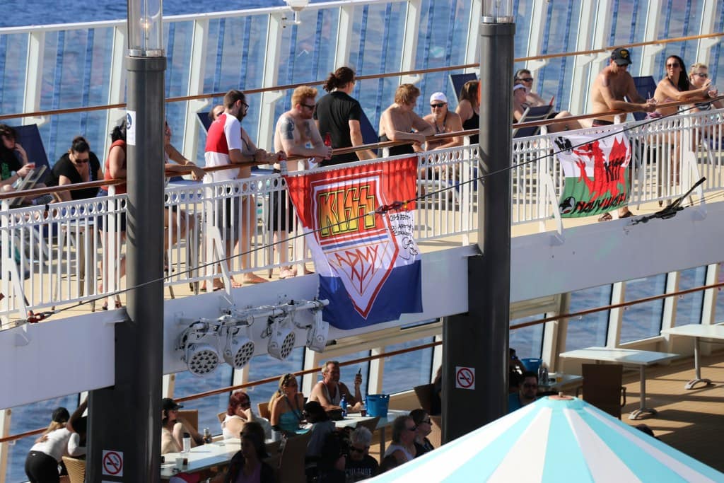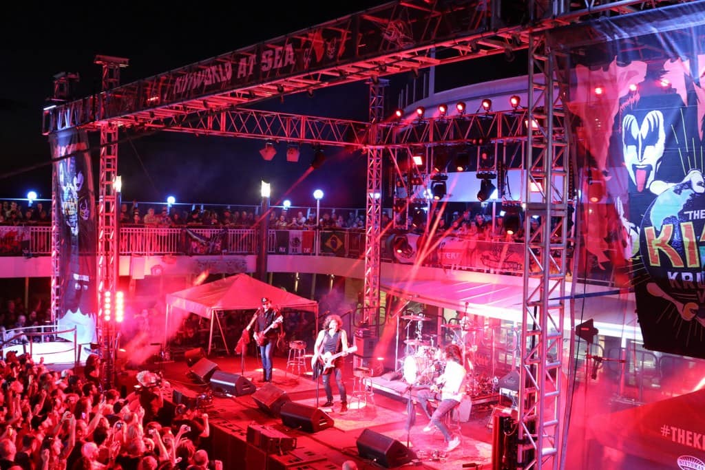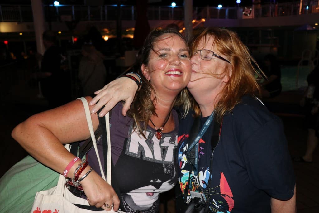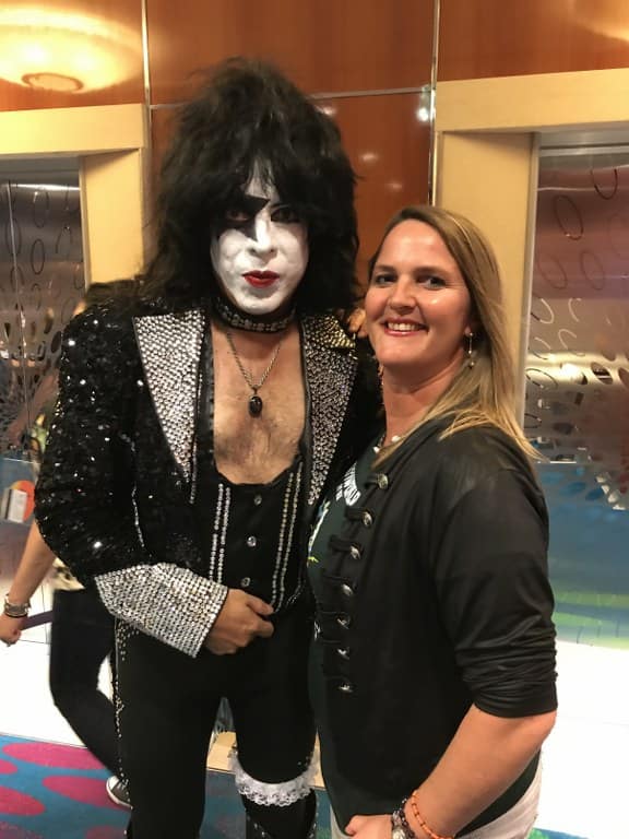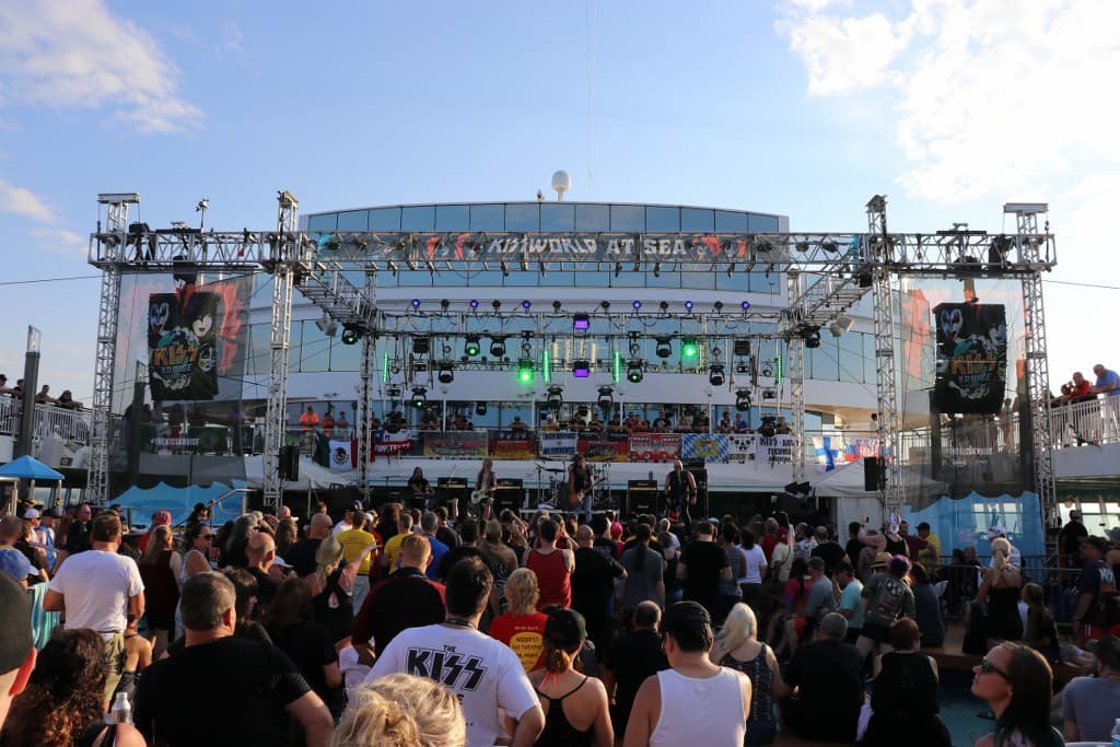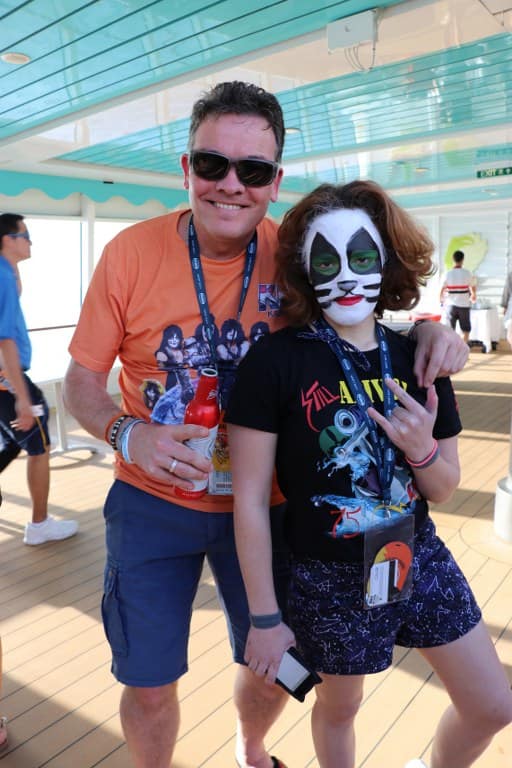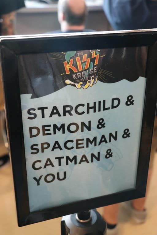 Aansluitend hebben we nog de Q&A op het pooldeck. KISS heeft er zin in want het is echt lachen geblazen. Die komiek George Lopez zat er ook bij maar die verziekte alles, naderhand las ik dat Doc hem heeft laten verwijderen van het podium. En terecht! Ook dit jaar horen we weer leuke anekdotes en serieuze opmerkingen van de heren. Eric’s foto’s van Gene op zijn schmink case! Leuke momenten uit verleden. In Italie hebben ze het beste eten. Enz enz.