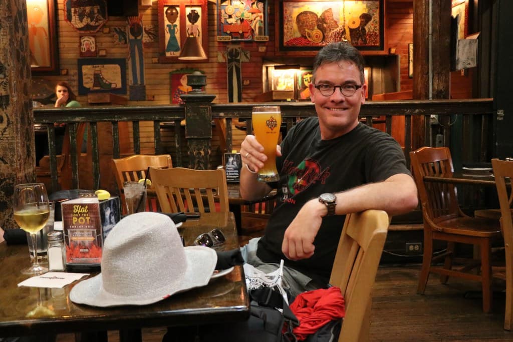 We fietsen echt door prachtige straatjes en rijden terug via het Garden District! Hier staan de wat luxere huizen! Biertje op het terras in Garden District, bij Tracey’s. Dik verdient, PROOST! Rond 18.00 uur leveren we onze fietsen weer in. Conclusie: fietsen is New Orleans is super gaaf en zeker een aanrader! Het was een super warme en vochtige dag dus moe terug naar ons hotel. Opfrissen want we gaan vanavond eten in the House of Blues. Volgens Silvy een must dingetje want die is al vaker in New Orleans geweest. We gaan het beleven. We gaan het dus niet beleven, want er is een private party deze avond, dus morgen ff lunchen daar. We schieten tegenover binnen bij Attiki Bar and Grill. Heerlijk gegeten! Daarna schieten we nog ff bij Bourbon Street Drinkery naar binnen voor een laatste drankje. Wat een drukte rond 21.30 uur in deze straat! Gezelligheid kent geen tijd, voor ons gelukkig wel.