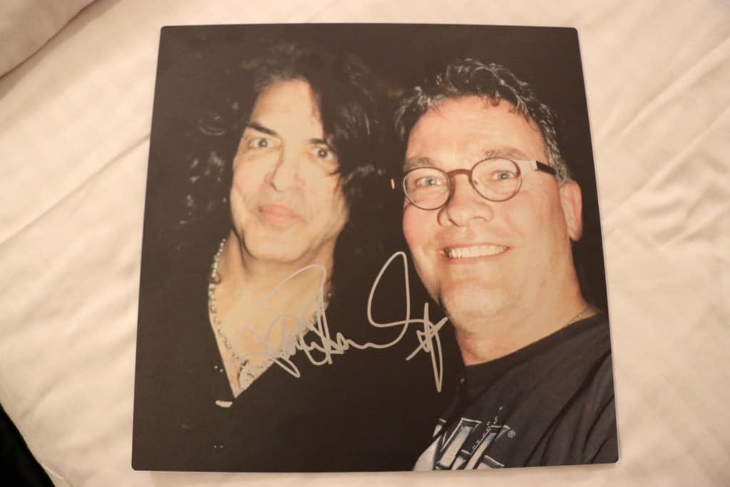 Als het is afgelopen razen wij, met vele anderen, naar voren. Yes, Paul pakt mijn foto als eerste, en zegt wauw! Ik heb de foto van mei 2017, London (The Water Rats show van the Dives, waar Paul ook was) af laten drukken op aluminium. Dat ziet er gaaf uit en nu dus nog gaver! Ook Silvy krijgt haar Paul Stanley memories plaat gesigneerd. Twee blije honden verlaten de zaal!