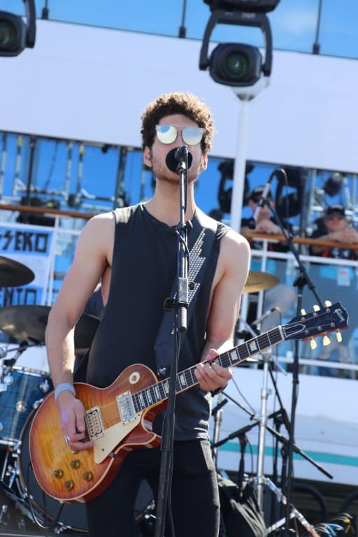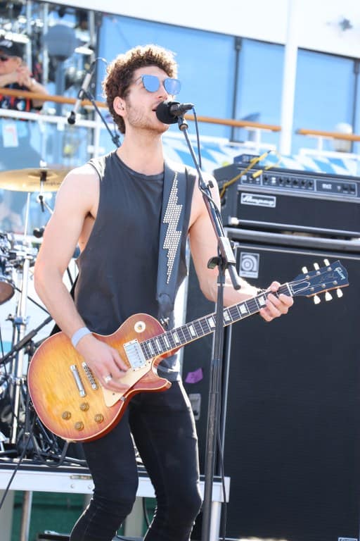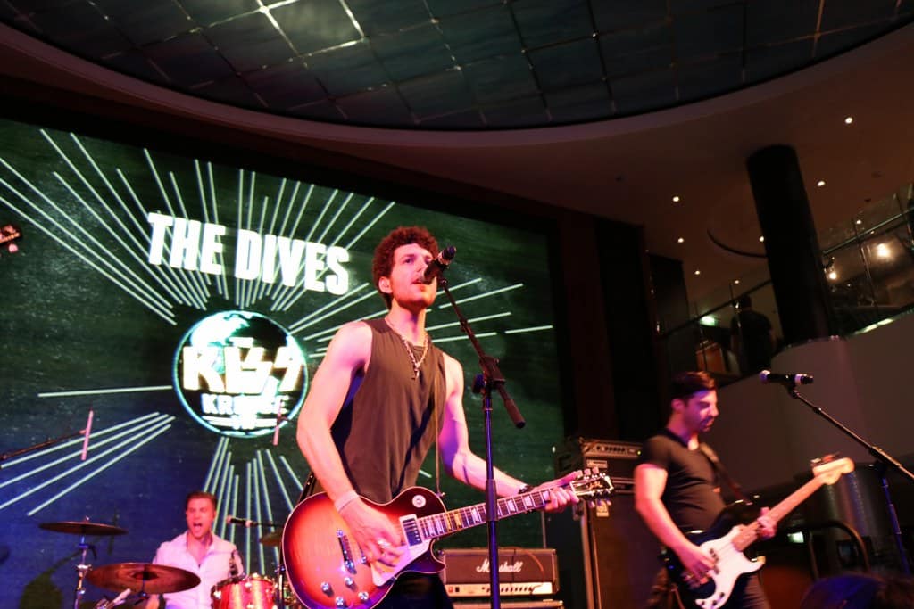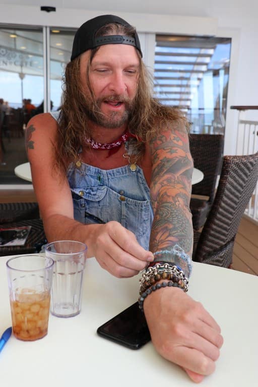 Maar goed, niet getreurd, we gaan ons er doorheen slaan. De zon schijnt en The Dives spelen een vette set op het pooldeck. Wij zouden om 11.30 uur een interview mogen doen met The Dives in the Great Outdoors, vanwege de schema wijziging wordt dit verplaatst. Nog ff afwachten dus maar we hebben goed contact met Lynn Lendway dus we houden hoop. Ook dit The Dives optreden kunnen we helaas niet geheel afkijken want om 12.30 uur staat er een interview gepland met Ryan Spencer Cook van The Big Rock Show en uiteraard the Gene Simmons Band. Daar “onze” Aardschok een artikel over de KISS KRUISE VII gaat plaatsen (januari 2018), hebben we een interview met Ryan Spencer Cook (TBRS en GSB). Echt een super cool en relaxed interview. Echt super gave input van hem gekregen. Zo werd Ryan gevraagd door Gene om een band te formeren, voor aanvankelijk twee optredens. Ryan zette zich in, van twee was al snel geen sprake meer, want ze zijn al in Japan en Zuid Amerika geweest. In 2018 volgen meer Gene Simmons Band optredens. Repeteren: Echt niet, Gene stuurde zijn setlist op en wij moesten dit zelf instuderen. Aanvankelijk stond daar geen enkel KISS nummer bij, uiteindelijk heeft Ryan er voor gezorgd dat er KISS nummers in de set zijn gekomen. Reizen en overnachten met Gene is een genot, top verhalen!! De rest bewaren we voor de Aardschok. Na het uitkomen van de Aardschok zal ik hier de audiofile van het complete interview nog plaatsen. Wordt vervolgd. Hoe was het om samen met Ace en Gene het podium te delen? Dit was echt een grandioze ervaring! Dit armbandje is gemaakt van de snaar van Ace zijn gitaar waarop hij die avond speelde. Yep, Ryan is ook KISS fan!