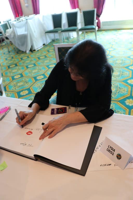 The Dives moeten we helaas missen omdat we toch even naar de signeer sessie gaan van het Konfidential Panel. Daar is het druk. LydiaCriss doen we als eerste, Lydia is de vrouw van Peter Criss en heeft een prachtig boek geschreven: Sealed with a KISS. Dit boek laat ik even signeren, erg leuk hoe Lydia tegen ons doet en de tijd neemt om er een leuk verhaaltje in te schrijven! Daarna aansluiten in de rij van Bruce! Na een kleine 45 minuten zijn we aan de beurt, wat meteen opvalt is dat Bruce de tijd neemt. Als eerste bedankt ik Bruce voor de geweldige set die hij neer heeft gezet de avond ervoor, samen met broer Bob. Dit was echt ongelooflijk vet. Uit betrouwbare bronnen vernam ik wel dan Bruce en Bob goedkeuring hadden moeten vragen aan Gene en Paul over hetgeen ze ten gehore wilde brengen. Tja………..