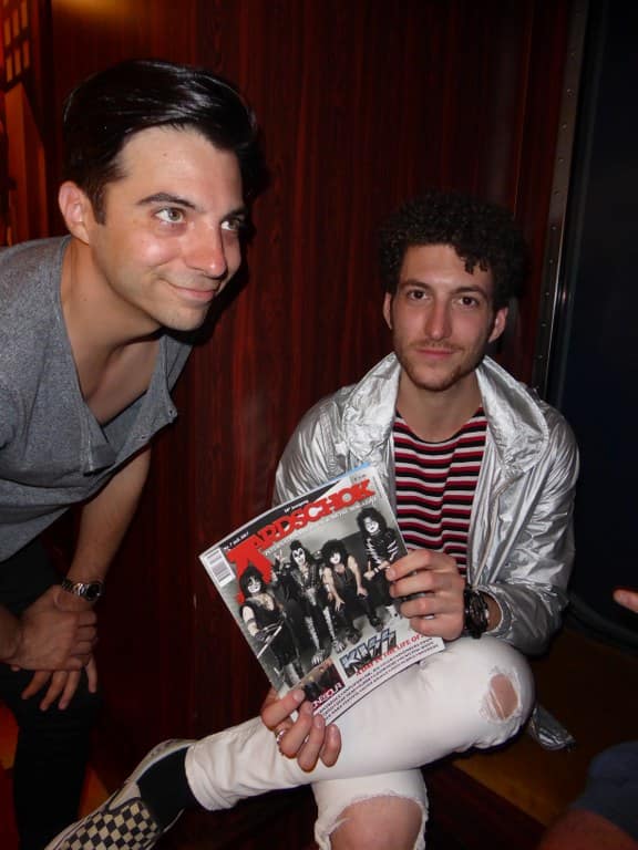 Wat een dag: In het Atrium kijken we nog ff naar een aardig optreden van Sophie Simmons, die enkele covers in een eigen jasje ten gehore brengt. Zeker een aardig optreden. Leuk is dat Gene, Shanon en Eric Singer iets voor ons ook staan te kijken. Ik krijg naderhand nog drie (!!??) fistbumps van d’n Gene! Gene rules! Yeah, eindelijk kunnen we ons interview met The Dives doen, we doen dit met Evan en Sergio. Beide kijken erg vreemd op van onze chocoladeletters gift, what’s that man. Na wat uitleg vinden de heren het geweldig! Evan geeft antwoord op vragen ao vragen: Hoe is het als zoon van Paul Stanley? Waar liggen jullie muzikale invloeden? Leuke kruise ervaringen? e.d. Ook hier gaan we in de Aardschok iets over schrijven dus nog ff geduld op al deze antwoorden.