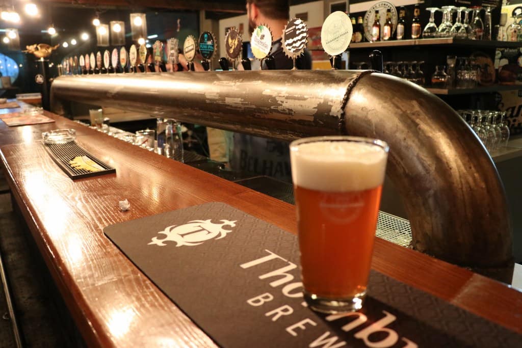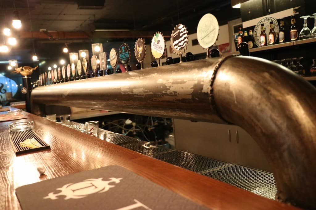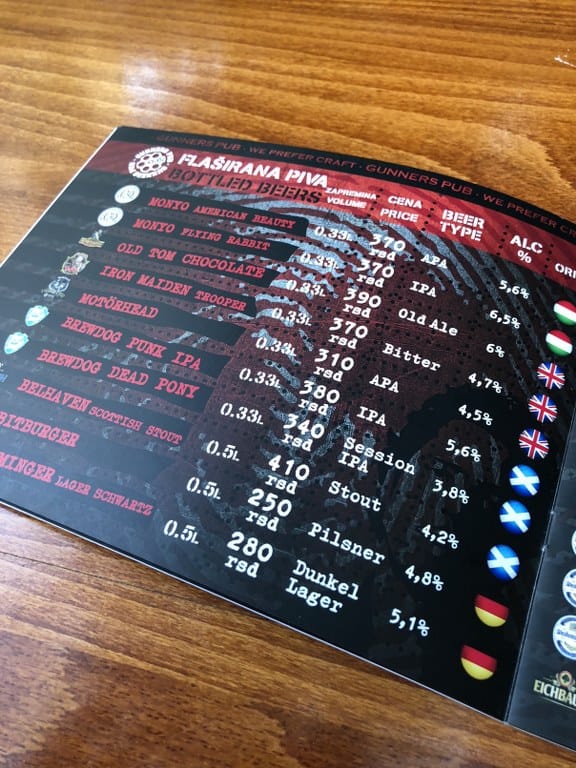 Rond 16.30 uur terug in het hotel. Opfrissen en daarna op zoek naar een dik verdiend biertje! Mijn t-shirt kon je uitwringen van het zweten van het fietsen en wandelen. Tweede douche van de dag dik verdiend dus! Op zoek naar een biertje, in eerste instantie vind ik een “Irish Pub” nabij het hotel. Geen weissners, dat kan, maar niet eens Guinness, dus snel wegwezen. Uiteindelijk beland ik aan bij de Gunners Pub, echt een gave tent. Hier hebben ze 14 soorten bier van de tap, de eerste wordt een Paulaner en de tweede Hoptopod IPA uit Servie. De laatste onbekend maar beide zeer goed te drinken. Hier staat zelfs Iron Maiden en Motorhead bier op de kaart! GAAF! Deze tekst kan ik wel waarderen: in hops we believe…..