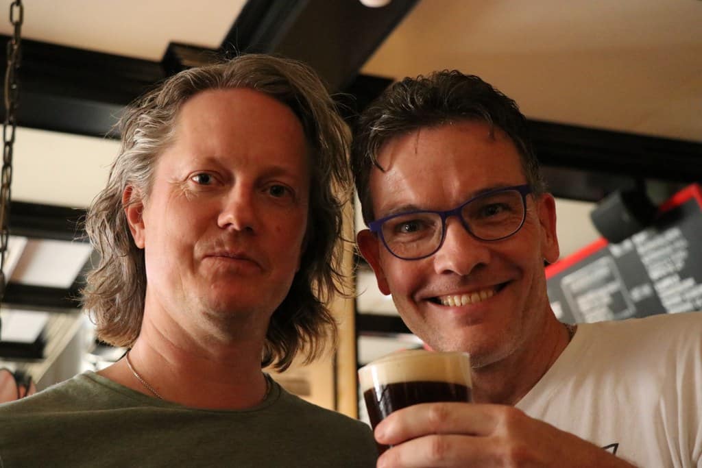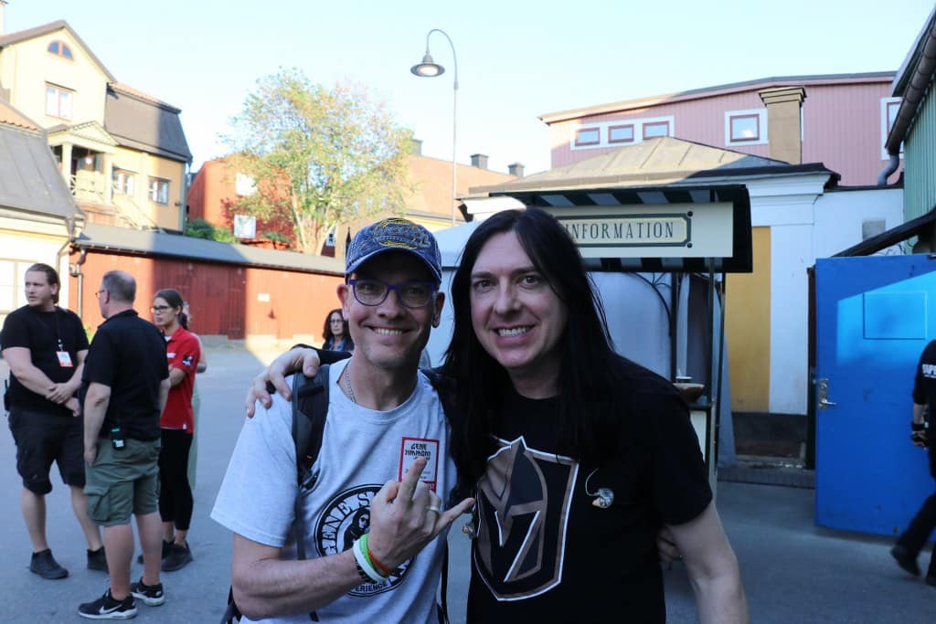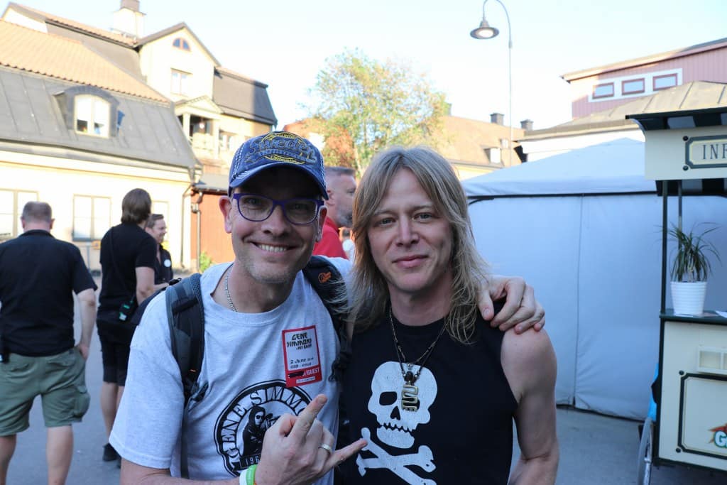 Onze guestlist stickers! YEAH! Is en blijft toch weer spannend als je weet dat we zo weer oog in oog komen te staan met Uncle Gene! Uiteindelijk komt er iemand vertellen dat de mensen van de guestlist rond 19.30 uur pas binnen mogen dus hier wachten heeft weinig nut. Uurtje extra rustig ademen, wc en een biertje! Rond 18.30 uur is het zover, wachten op Uncle Gene. Geen grote hoeveelheden aan mensen, slechts dit groepje! Intiem in Zweden……. Zelfs de uitgenodigde fotograaf, die we allemaal ons e-mailadres moesten geven, wist totaal niet wat er ging gebeuren. Gaaf en spannend! Terwijl we wachten duiken Gene Simmons Band drummer Brent Fitz en gitarist Jeremy Asbrock op. Natuurlijk ff een fotomomentje! Jeremy geeft nog even een plectrum aan Remco, de enige die hij hier weggeeft!