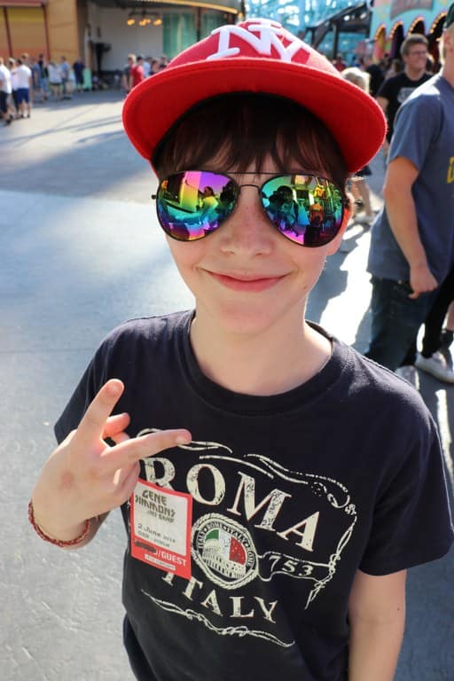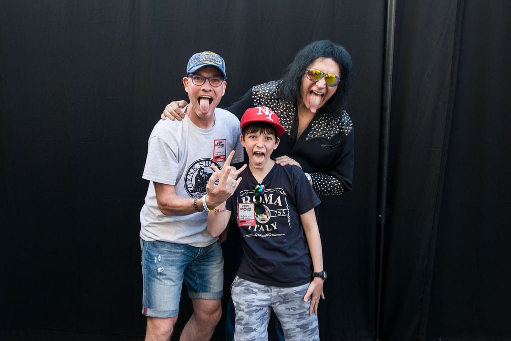 En dan mag je plotseling, samen met je zoon (wauw), oog in oog naar Gene lopen. GEWELDIG!! Gene is relaxed, ik niet trouwens, en heeft tijd voor een kort praatje met the next generation (Remco). Ik vraag aan Gene of we op de foto kunnen met de tongen er uit en Gene werkt graag mee, mega vet/cool! Na de foto met Gene, Remco en NL KISS fan Ruudje, zeg ik tegen Gene dat we opnieuw ontmoeten op 22 juli in Amsterdam, tijdens the Vault Experience. Waarop Gene antwoord: “Holland, godverdomme” met een Amerikaans accent. Yep, Gene blijft echt een van mijn echte heroes! What is a world without heroes, you can’t look up to anyone without heroes………. Wat een geweldig moment weer!