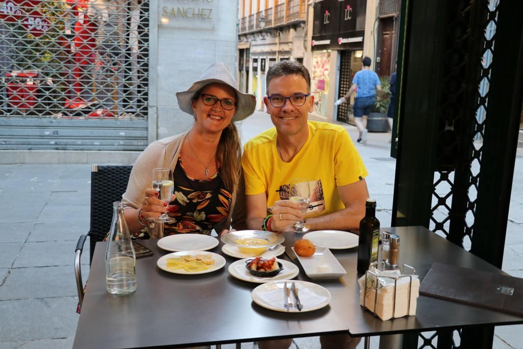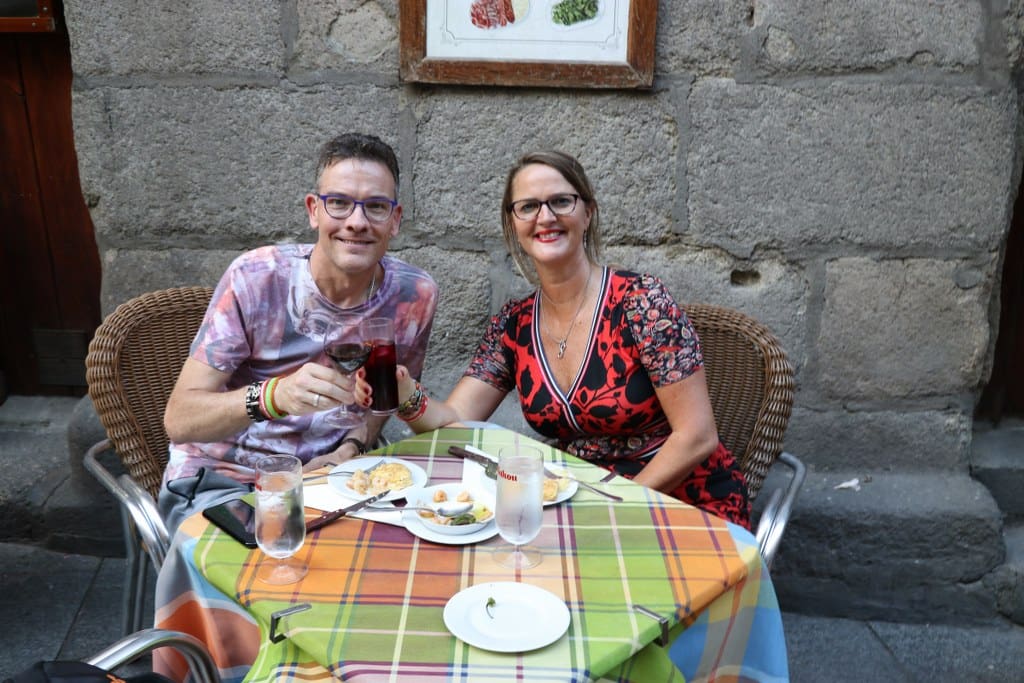Rond 16.30 uur zijn we terug bij onze Parador, tijd voor relaxing/zwemmen. Dat zwembad hebben we immers niet voor niets. We gaan, op advies van de receptioniste, eten bij Bar Mingalario, 10 minuutjes wandelen. Wederom een avondje genieten in Spanje! We zitten relaxed en gezellig, op straat, maar zo gaat dat hier. Samen met de ober, die enkele woorden Engels spreekt, en de Spaanse menukaart (in Engels is die er geen), komen we wel tot onze keuze. Richting het einde van ons diner komen er twee stelletjes aangewandeld, goed aangeschoten, die twee gasten zijn zo ontzetten zat maar wel erg gezellig en leuk. Hun schuiven meteen onze tafel aan die van hun want wij horen bij hun. Dit wordt vast nog heel erg gezellig! Drank op tafel en laat de party maar beginnen. “De tandarts” (gelukkig hoeft ik daar morgen niet heen), heeft ooit gestudeerd met een Nederlander en begint een liedje te zingen wat later alle eendjes in het water blijkt te zijn.Dit gaat nergens over maar is zo ontzettend leuk!