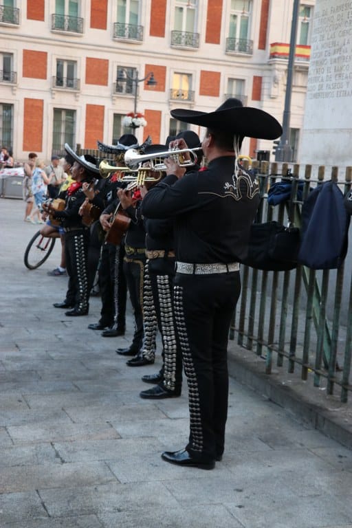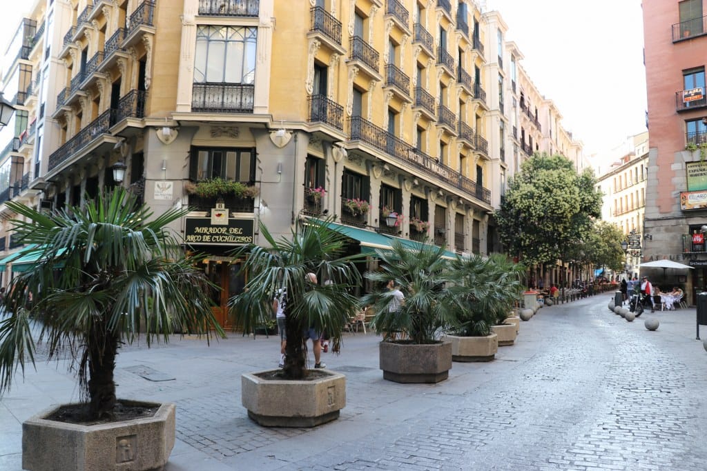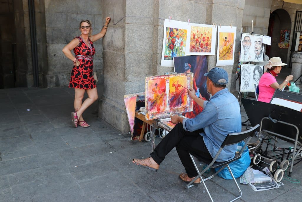 9 juli: GOEDEMORGEN Madrid, “uitgeslapen” tot 09.00 uur, YEAH! Eerste “day off” van deze trip, genieten van Madrid! Na ons ontbijt eerst ff de fitness van ons hotel opzoeken, ja ook op reis is sporten van belang. Lekker zweten, waar overigens met deze hitte geen gebrek aan is. Douche en vroeg in middag pas de straten van Madrid in. Sightseeing Madrid! Eerst naar de grootste Desiqual winkel op de wereld, zeven etages vol met kleuren. Aangezien dit behoort tot de meest favorieten winkels/merken van Jolanda, gaan we deze natuurlijk bezoeken. Yes, missie geslaagd: veel geld bespaard vanwege de opruiming……. Na dik 1,5 uur staan we alweer buiten, jippie! Wandelen door Madrid doe je ALTIJD aan de schaduwkant van de straat, zeker in juli! Hot, vandaar! Plaza Mayor is in renovatie.