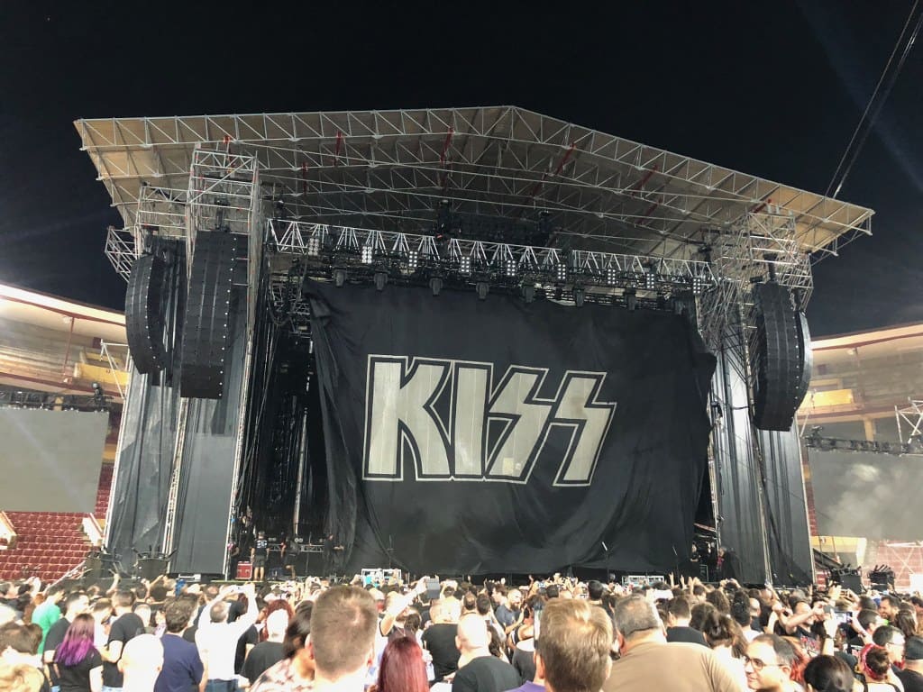 Daarna is het tijd dat het beroemde KISS doek weer zakt! Het aftellen kan weer beginnen! KISS in Spanje, nummer 54 gaat bijan van start! Een geweldige zaal dat Wizink Center, niet geheel uitverkocht maar zeker zeer goed gevuld. Zo kom je nog eens ergens……. Hoppa showtime! KISS start wederom met Deuce, wat een geweldige sound! Echt een stuk beter dan op Barcelona Rock Fest, yep indoorshows zijn ALTIJD gaver!