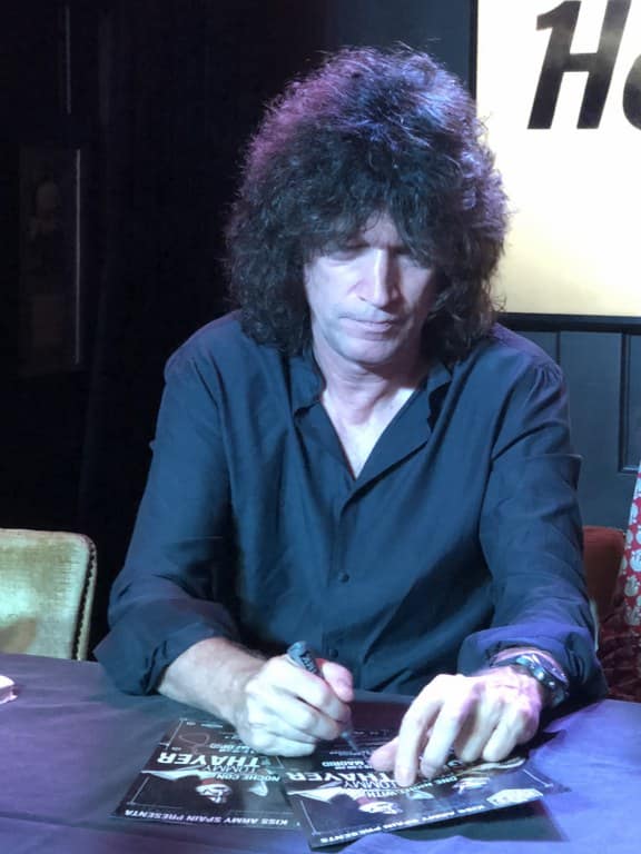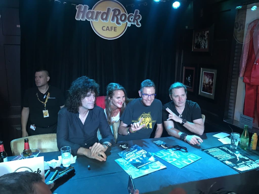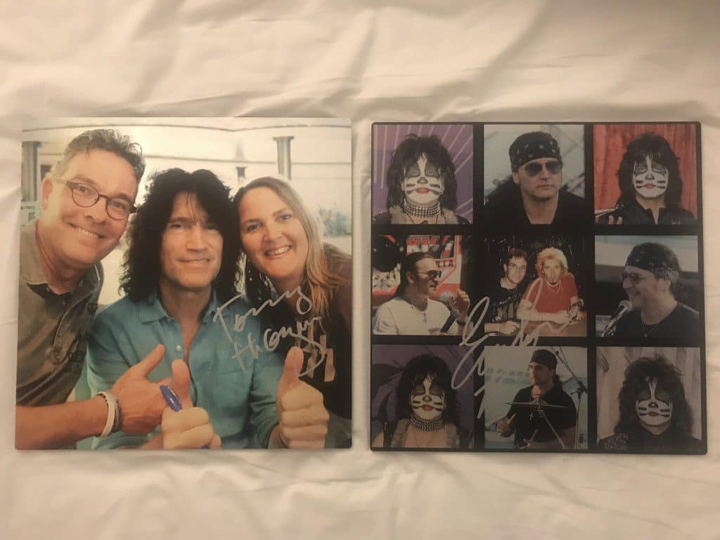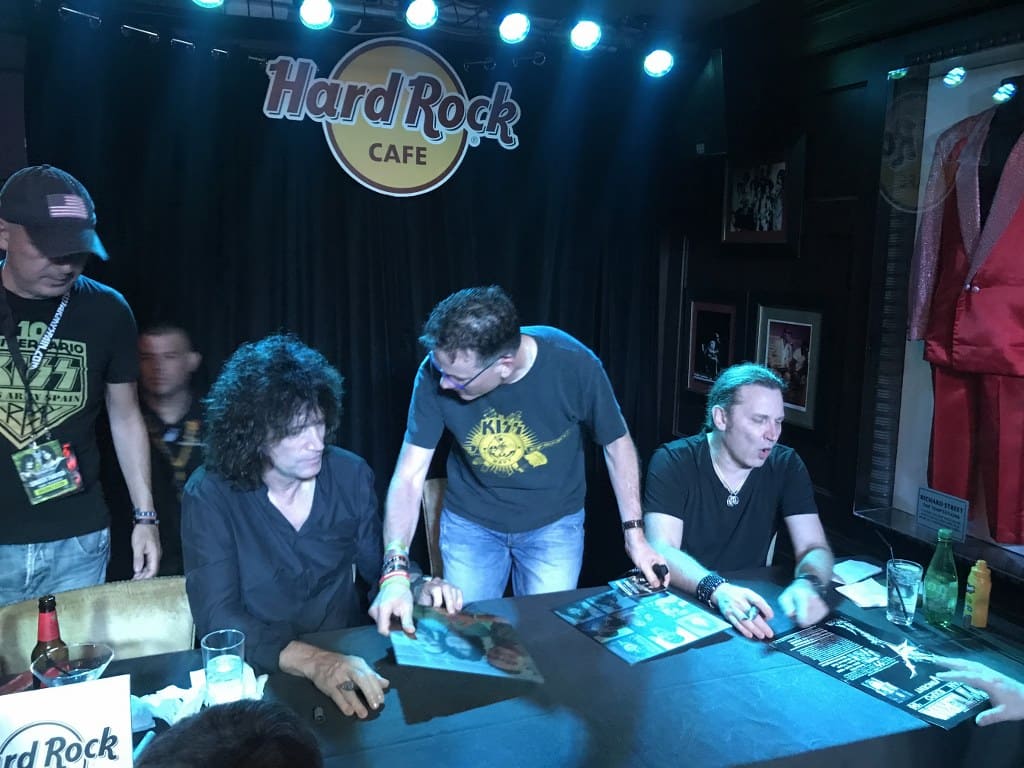 Niet gek, zitten wellicht beide nog met een jetlag en hebben ook te dealen met de Spaanse hitte. Rollen net van het podium af en nu weer hier en ook hun hebben vandaag tussen Barcelona en Madrid moeten reizen. TOP gasten, want ze zijn er wel en blijven ALTIJD vriendelijk! binnenkomst heeft iedereen een pasje gekregen met naam en nummer er op, op nummer volgorde kan/mag je naar Tommy en Eric toe. Tommy vind onze foto van de laatste KISS Kruise erg gaaf, op aluminium afgedrukt. En vertel hem nogmaals dat Tommy geliefd wordt door deze Dutch Guy! Ook Eric vind de plaat die we hebben gemaakt, met een compilatie aan “Eric foto’s” erg gaaf en vraag wanneer alle foto’s zijn gemaakt. Nog ff een discussie over 1998 maar ik leg het graag uit aan Eric. Hij vraagt wel netjes waar hij mag tekenen, volgens mij vond hij het sonde om zijn handtekening er over heen te zetten!? Ik vertel Eric dat vanavond mijn 54ste KISS concert, met een dikke lach “is that all”! Hij vraagt of ik ooit shows in Amerika heb gezien maar die zijn NOG beperkt tot alleen de KISS Kruises maar ik geef aan dat ik tijdens “the end of the road tour” zeker nog overkom naar de States, Eric lacht daarom maar zegt verstandig genoeg niks over dit gevoelige onderwerp! Echt maximaal genoten van deze meet and greet!