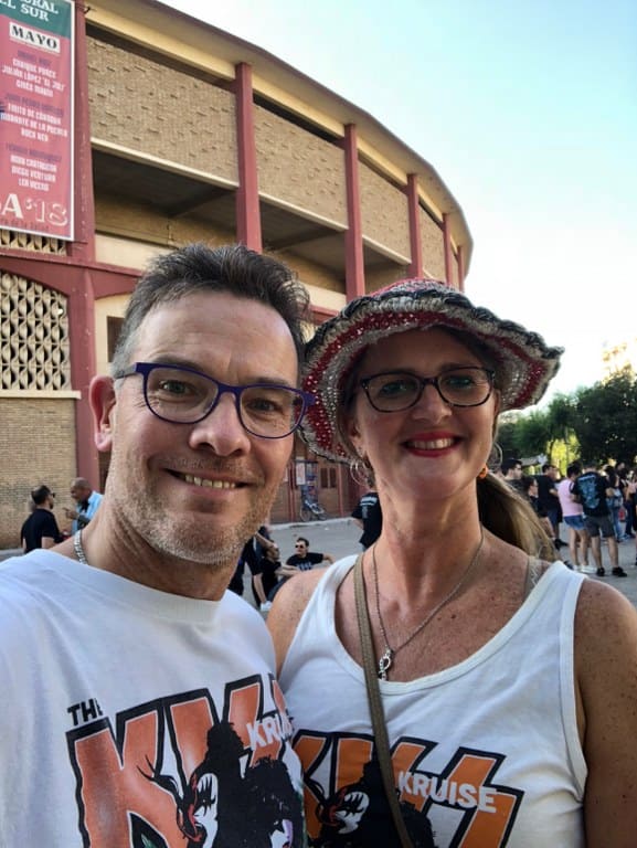 Voor de Arena, waar ook stieren gevechten plaatsvinden, zien we al snel dat het hier om een bijzondere locatie gaat! Opnieuw ontmoeten we Mauricio, hij organiseerde de M&G met Tommy en Eric in Madrid en is oprichter van the KISS Army Spain! Altijd leuk om friends around the World, weer ff de hand te schudden en te ontmoeten. Wat zijn hun KISS stories………