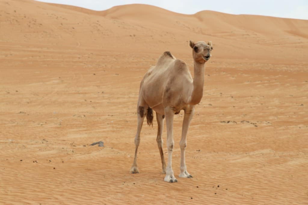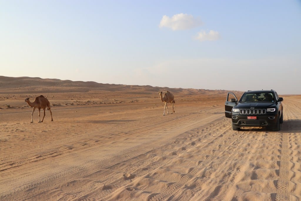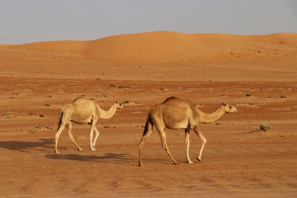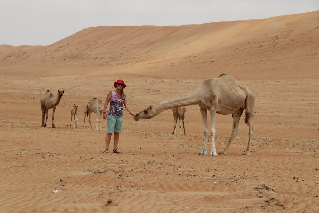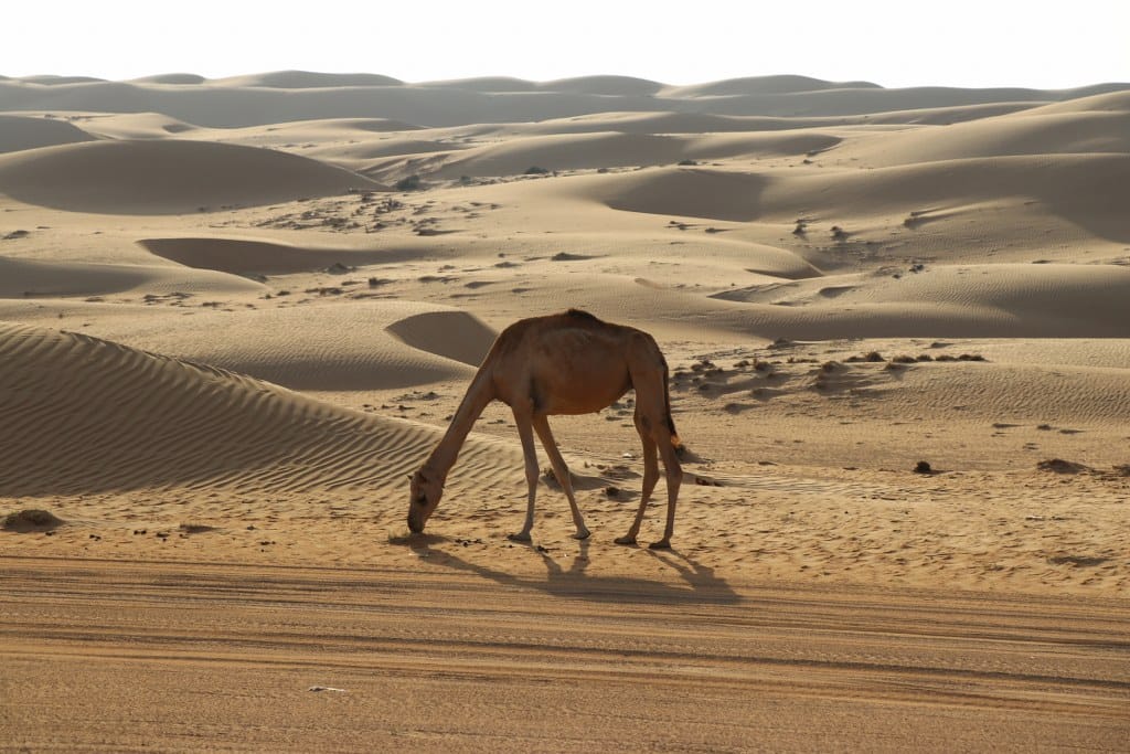 Rond 15.15 uur zijn we bij het aangegeven Shell tankstation, hier moeten we onze banden qua druk laten zakken om betere grip te herkrijgen in het losse zand van de woestijn. Komen we hier de eerste Omaanse laaienlichter tegen? Hij geeft zich uit als medewerker van 1000 nights camp, waar wij moeten zijn. Voor 25 Riaal kan hij ons begeleiden door de steile stukken in de woestijn. Hij verzekerd ons dat het moeilijk rijden is en te gevaarlijk om alleen te doen. Oke, we twijfelen aan zijn verhaal maar we doen het. Veiligheid immers boven alles, van 25 maken we nog wel 20. Onderweg schieten we wat foto’s en tijdens het maken daarvan probeert hij ons nog een sunset trip aan te bieden. We houden de boot af, dit klopt niet! 10 km voor het bereiken van het kamp draait hij om, “de rest is eenvoudig te berijden, dus kunnen jullie zelf doen”, zegt hij. Hij zijn centjes en wij met veilig gevoel de woestijn ingereden, redelijke deal en prima voor ons. Eerlijk is eerlijk, een kameel in de woestijn geeft toch echt wel het gaafste beeld. Kamelen kunnen de leeftijd van 70 jaar bereiken, daarbij kunnen deze beesten ruim een maand zonder water.