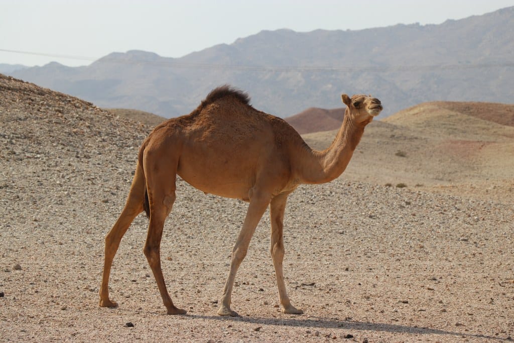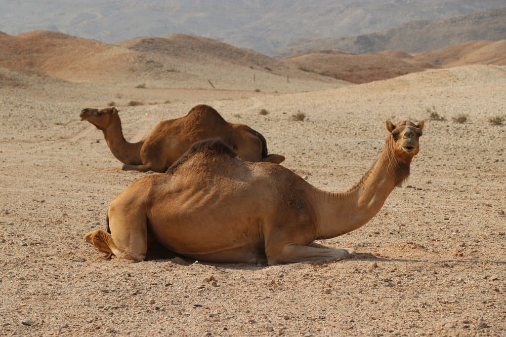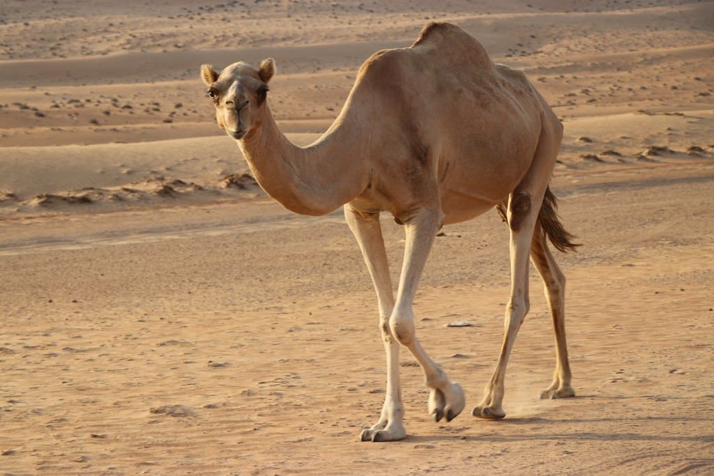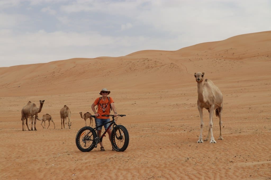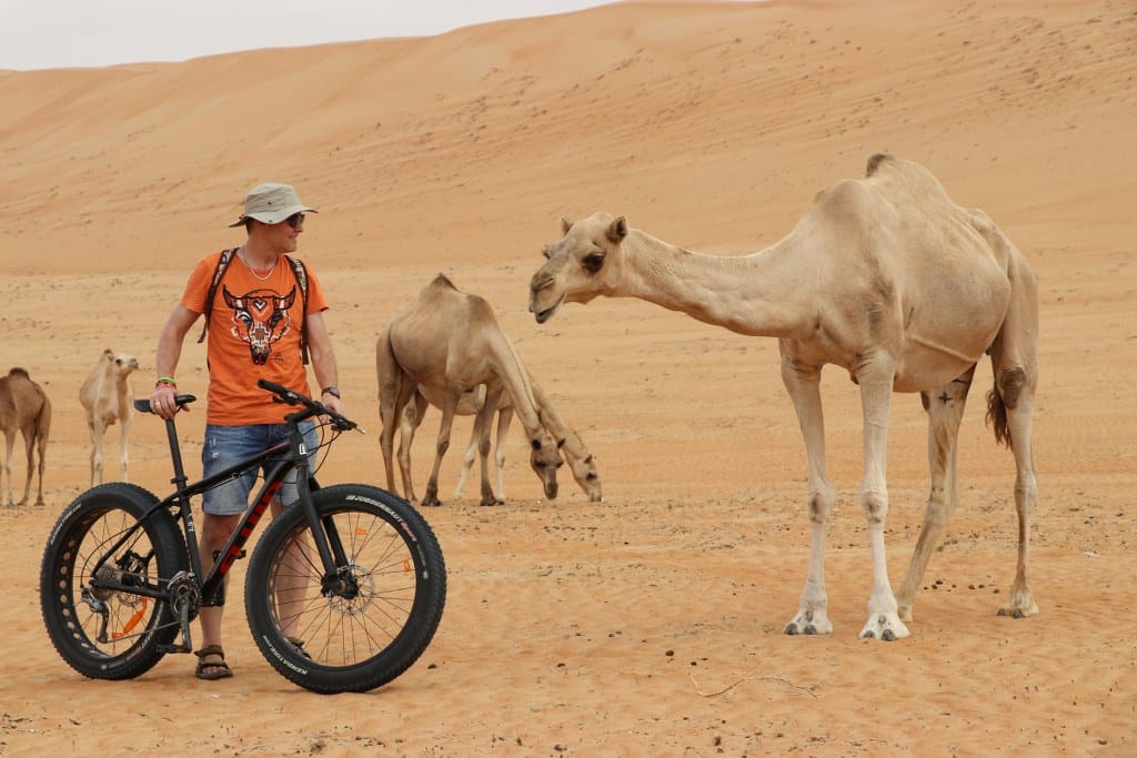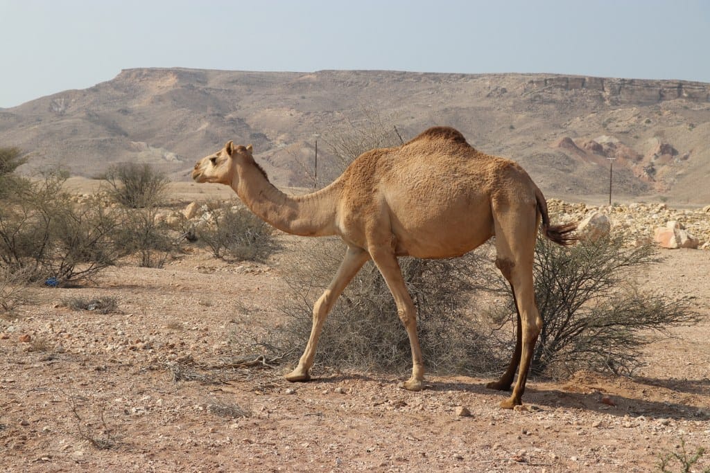 Rond 15.15 uur zijn we bij het aangegeven Shell tankstation, hier moeten we onze banden qua druk laten zakken om betere grip te herkrijgen in het losse zand van de woestijn. Komen we hier de eerste Omaanse laaienlichter tegen? Hij geeft zich uit als medewerker van 1000 nights camp, waar wij moeten zijn. Voor 25 Riaal kan hij ons begeleiden door de steile stukken in de woestijn. Hij verzekerd ons dat het moeilijk rijden is en te gevaarlijk om alleen te doen. Oke, we twijfelen aan zijn verhaal maar we doen het. Veiligheid immers boven alles, van 25 maken we nog wel 20. Onderweg schieten we wat foto’s en tijdens het maken daarvan probeert hij ons nog een sunset trip aan te bieden. We houden de boot af, dit klopt niet! 10 km voor het bereiken van het kamp draait hij om, “de rest is eenvoudig te berijden, dus kunnen jullie zelf doen”, zegt hij. Hij zijn centjes en wij met veilig gevoel de woestijn ingereden, redelijke deal en prima voor ons. Eerlijk is eerlijk, een kameel in de woestijn geeft toch echt wel het gaafste beeld. Kamelen kunnen de leeftijd van 70 jaar bereiken, daarbij kunnen deze beesten ruim een maand zonder water.