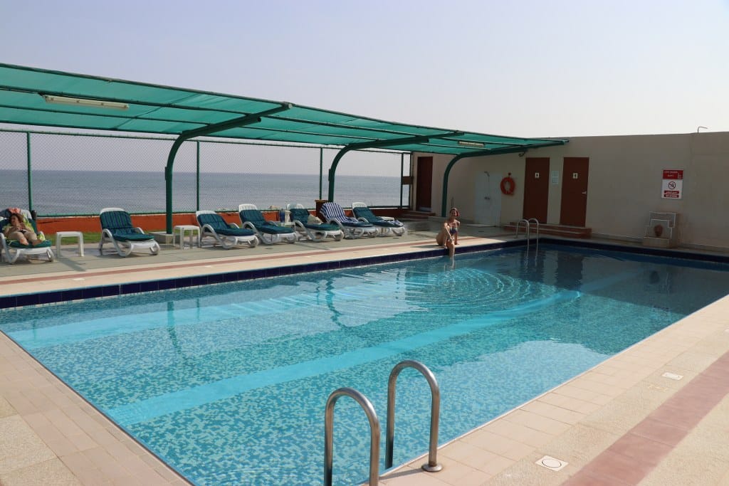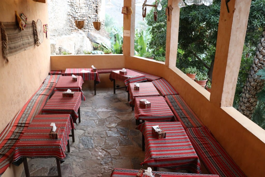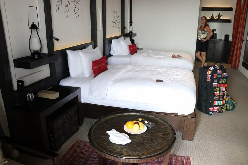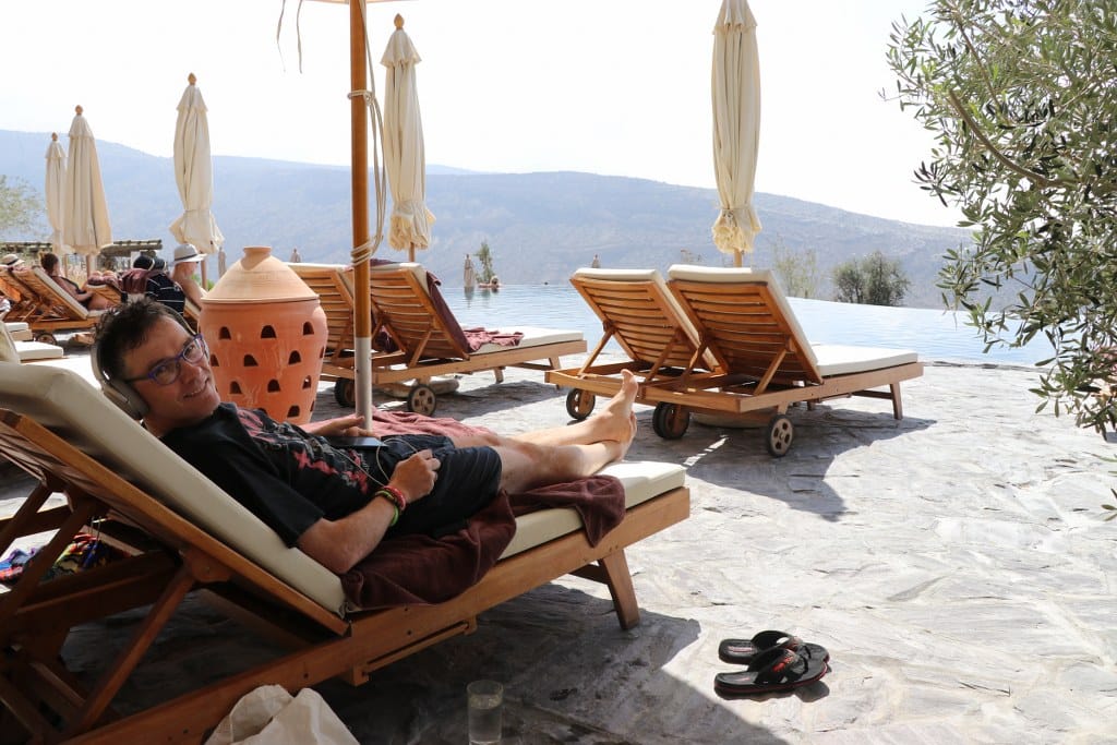 Het is vanavond Spaanse avond, of wij daaraan mee willen doen voor 20 Riaal p.p. inclusief verschillende Spaanse wijntjes? We weten niet wat we horen, na 10 dagen rondtrekken toch nog een wijntje! Yep, wij doen mee! Op deze locatie is voor alle leeftijden en levensstijlen van alles aanwezig. Van klimmen en klauteren, wandelen, fietsen, mountainyoga, fitness tot van alles voor de kleintjes. Een goed programma! Daarbij kun je hier genieten van TOP eten, Spa, Zwemmen, Bubbelbadjes enz enz. Een super resort waar we zeker van gaan genieten na twee nachten op de grond slapen in Misfah. Wij houden van afwisseling, deze kamer is zeker vijf keer groter als die van afgelopen nacht. We genieten van een verlaten lunch, want het is inmiddels 15.00 uur geworden.