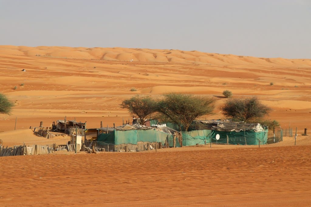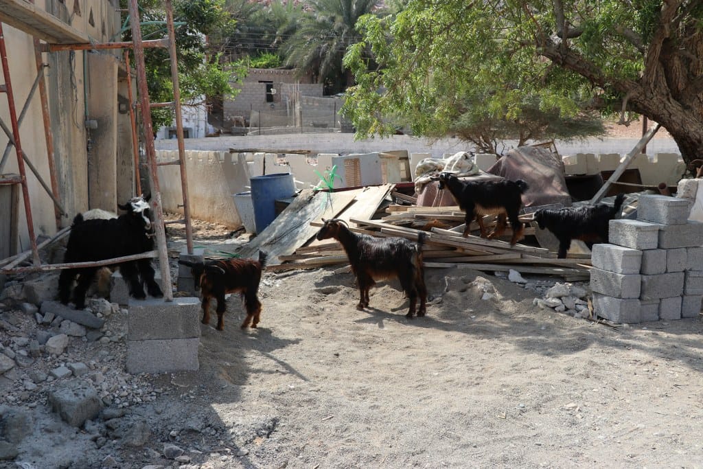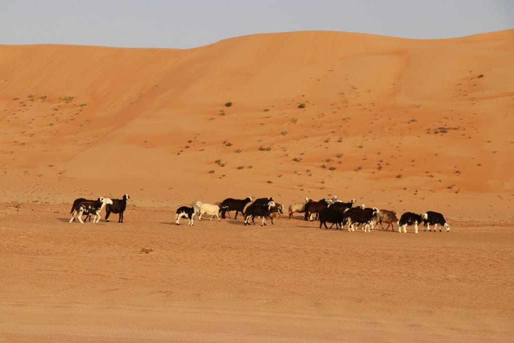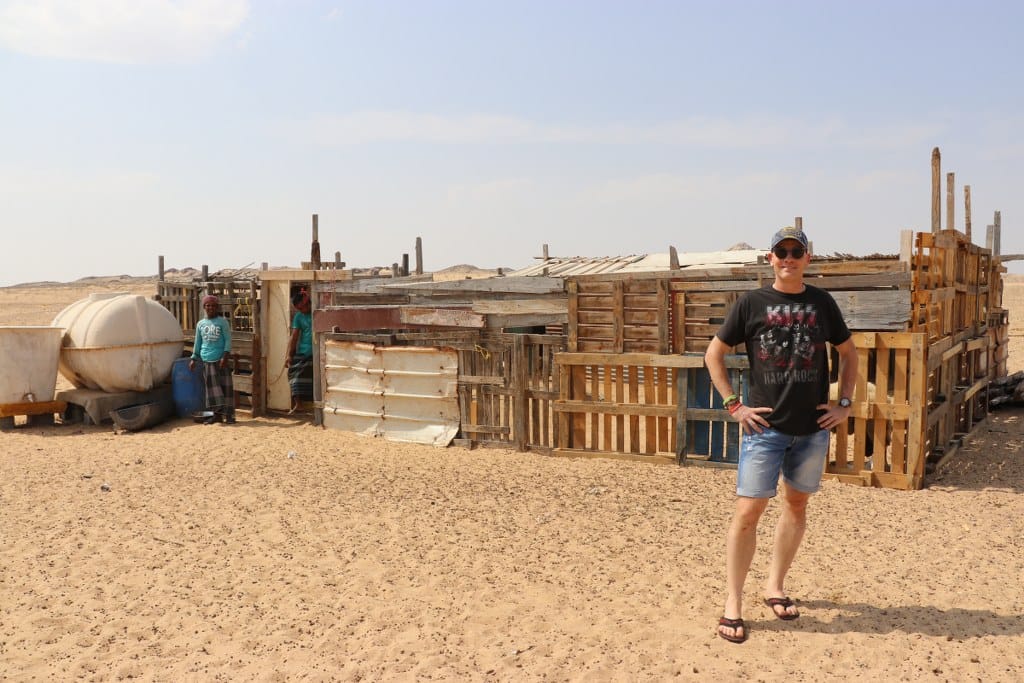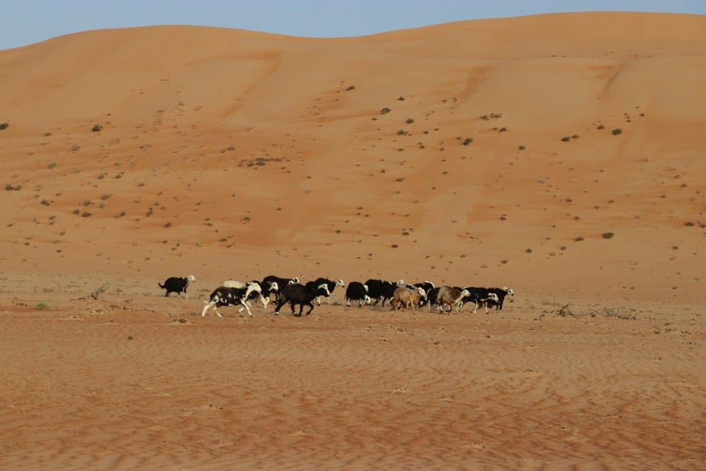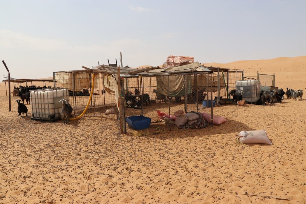 Onderweg zien we op diverse plaatsen een soort van krotjes met hekwerkjes staan in het zand, we denken in eerste instantie aan krottenwijkjes. Er op af dus om nader te onderzoeken, wat is dit? Helder! Dit zijn geitenherders die daar hun geiten laten jongen. Gelukkig treffen we en tweetal herders aan en we vragen of we hun “geitenverblijf” eens mogen bekijken. Omani zijn super vriendelijk dus het antwoord is: JA Helaas is hun Engels erg beperkt maar we krijgen een goed beeld van deze verblijfjes, cq dorpjes waar meerdere herders hun kampen op hebben geslagen. De jonkies worden netjes aan ons getoond en foto’s zijn geen probleem.