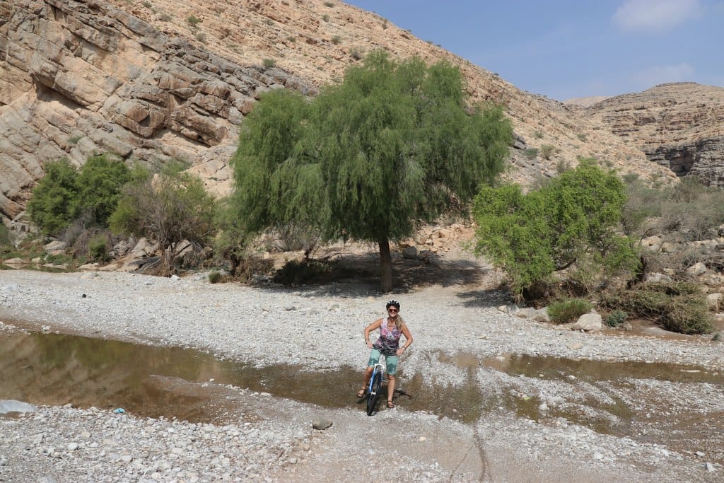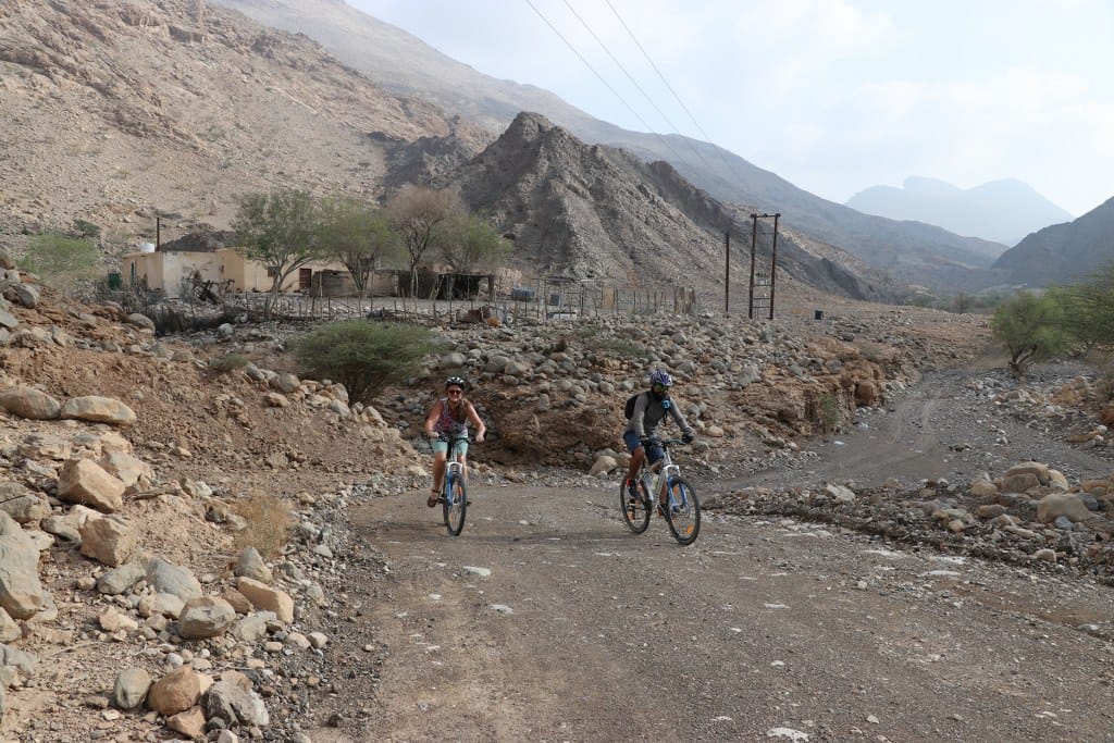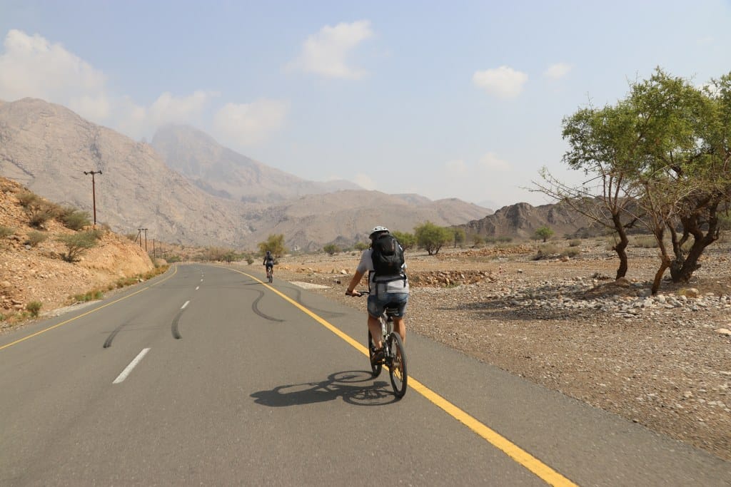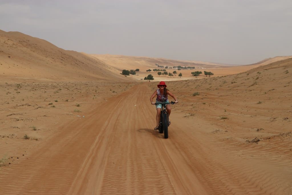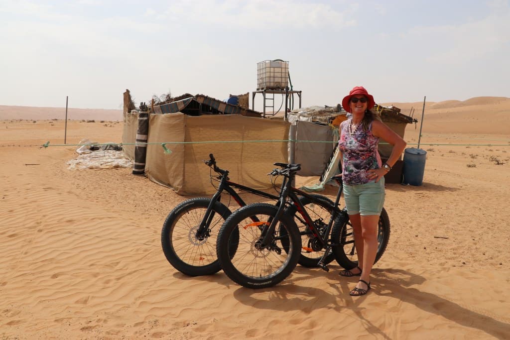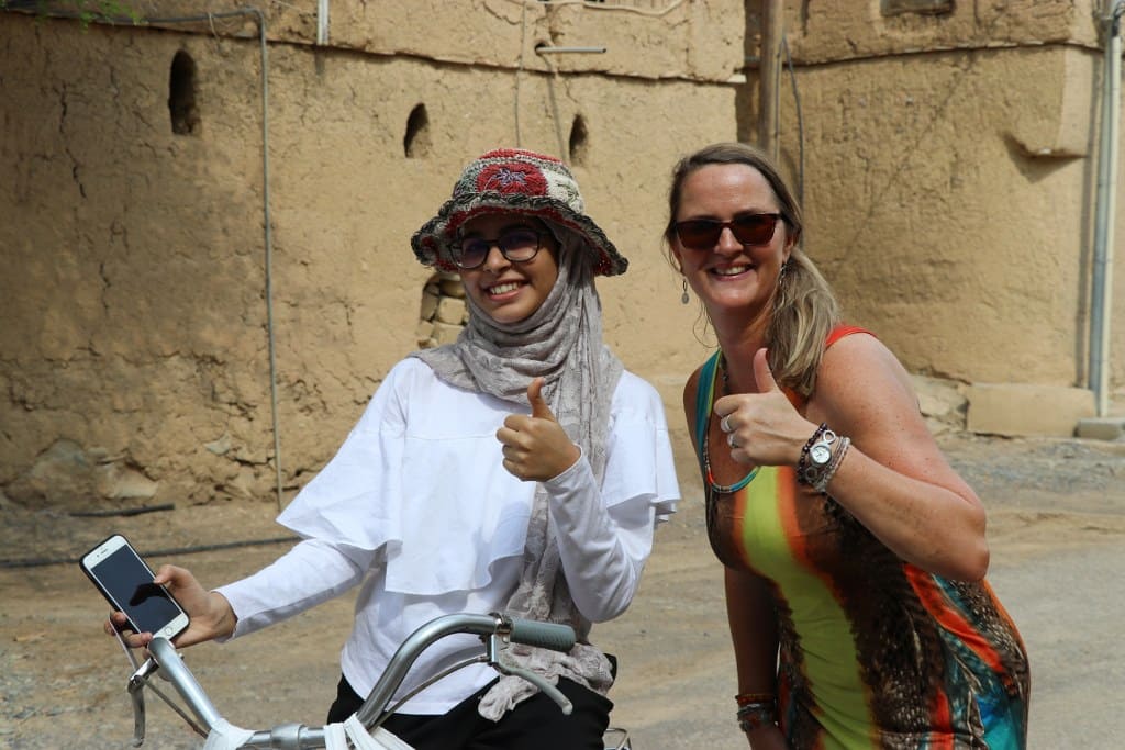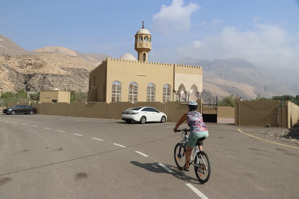 man die toevallig voorbij komt, op zijn fiets, wordt door een van dames aangehouden zien we op een afstand. Zij willen ook een stukje fietsen, kennelijk toch iets wat voor ons heel normaal is maar hier zeer zeker niet. Fietsen zit niet in het Oman DNA. Ze vindt het hoedje van Jolanda helemaal geweldig en vraagt of ze dat een keer op mag, voor foto op haar mobiel. Dat mag, uiteraard knippen wij ook.
