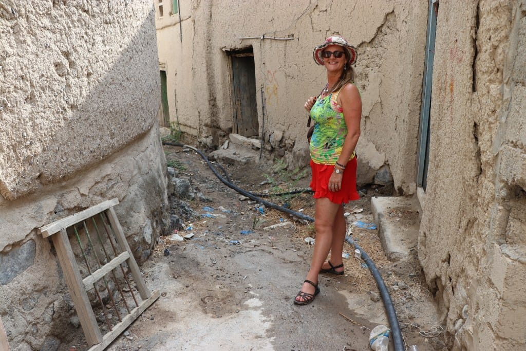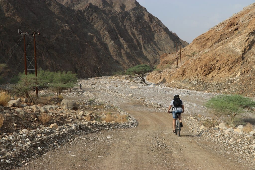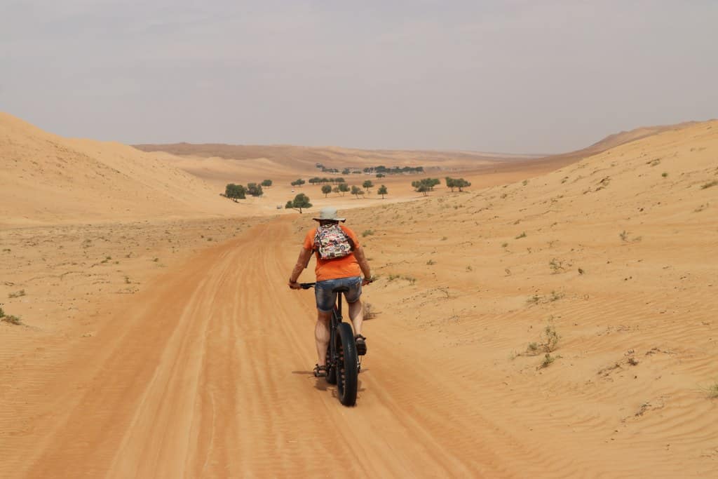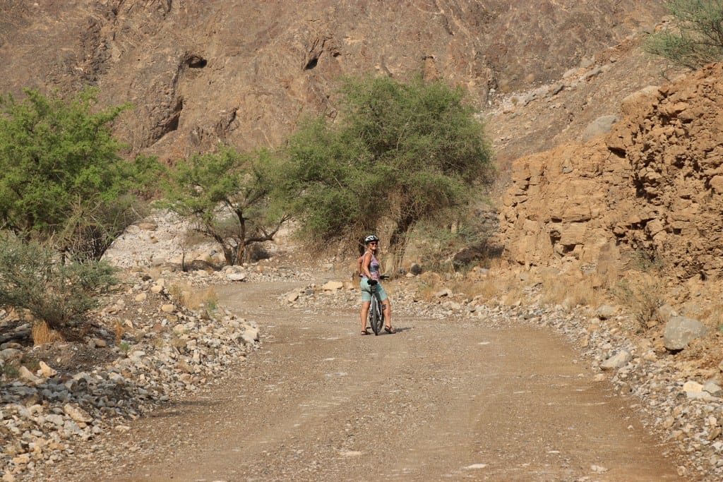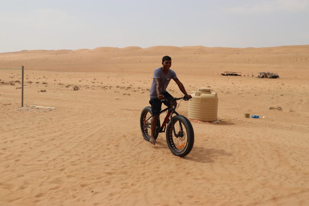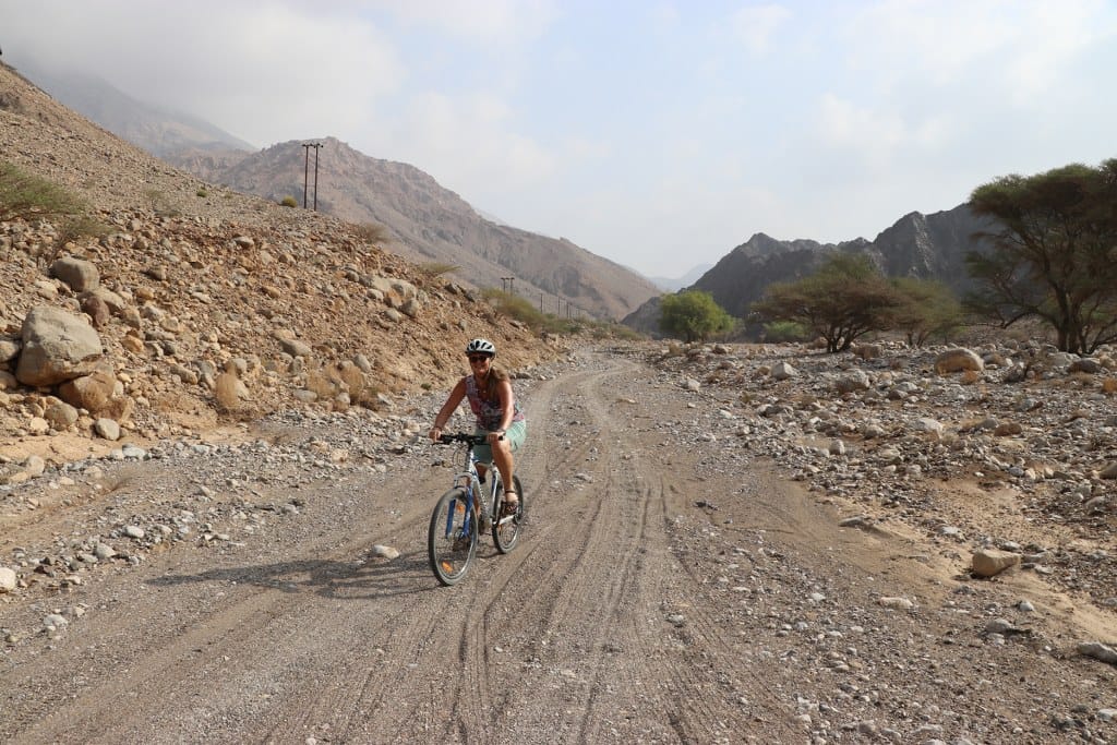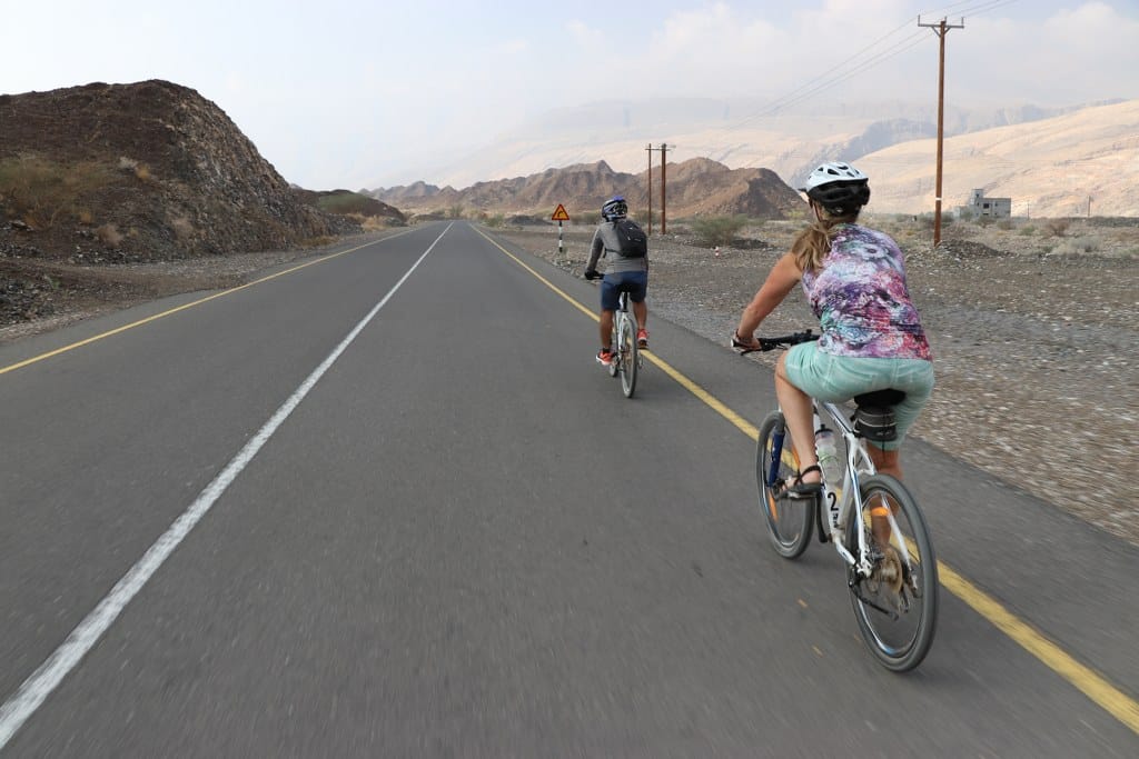 man die toevallig voorbij komt, op zijn fiets, wordt door een van dames aangehouden zien we op een afstand. Zij willen ook een stukje fietsen, kennelijk toch iets wat voor ons heel normaal is maar hier zeer zeker niet. Fietsen zit niet in het Oman DNA. Ze vindt het hoedje van Jolanda helemaal geweldig en vraagt of ze dat een keer op mag, voor foto op haar mobiel. Dat mag, uiteraard knippen wij ook.