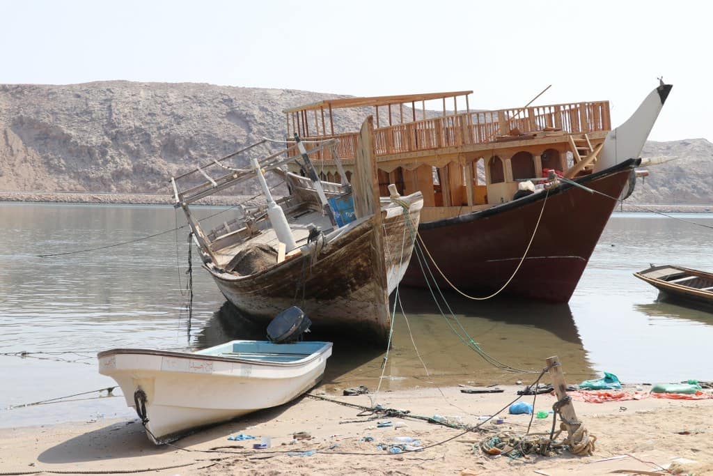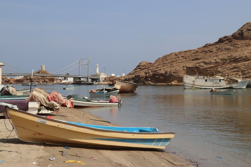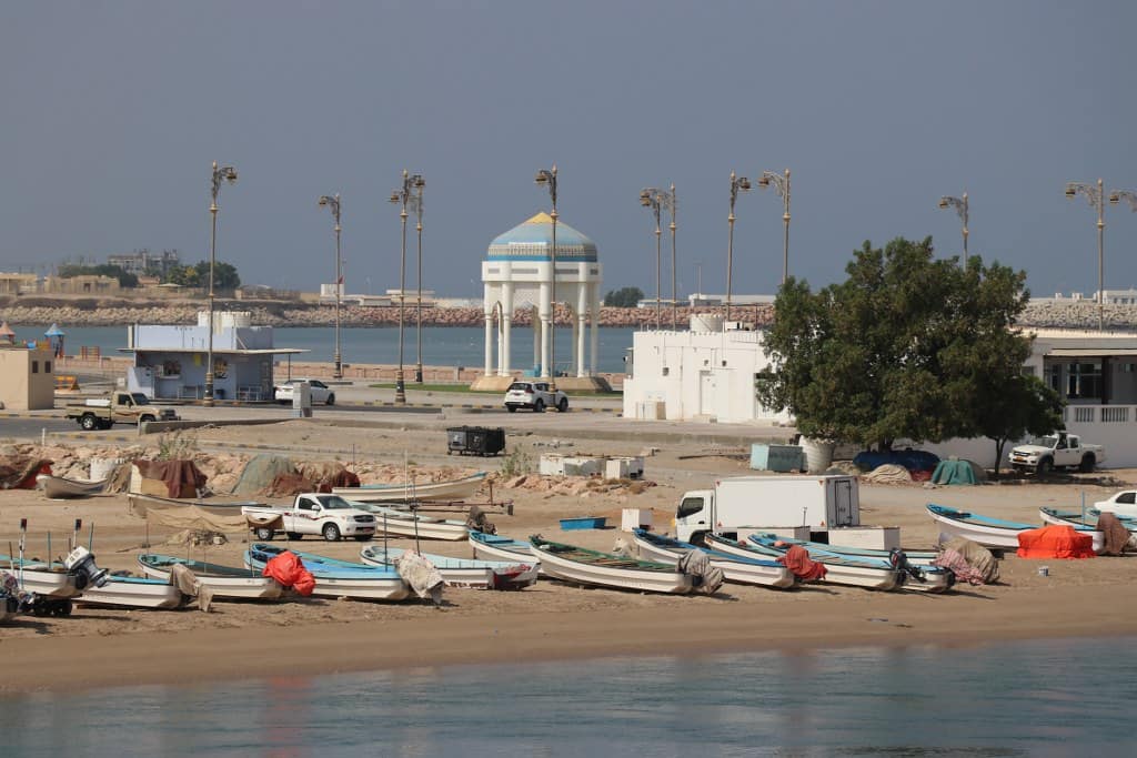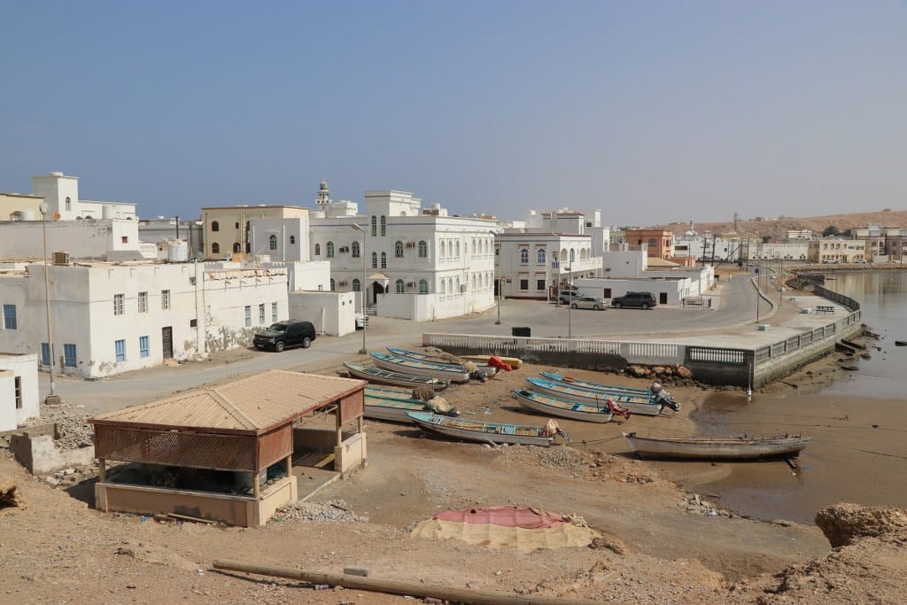 We verlaten de weg richting Sur in Qurayyat, in de mangrovebossen zitten kennelijk regelmatig flamingo’s. Een leuk plaatjes waar we eerst even de lokale supermarkt bezoeken! Water, water, water………. Visserbootjes genoeg in Qurayyat.