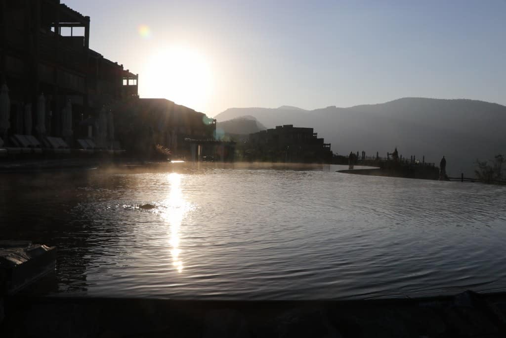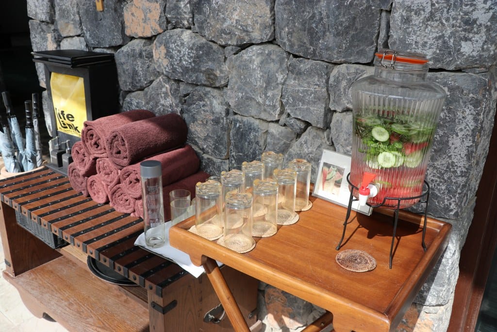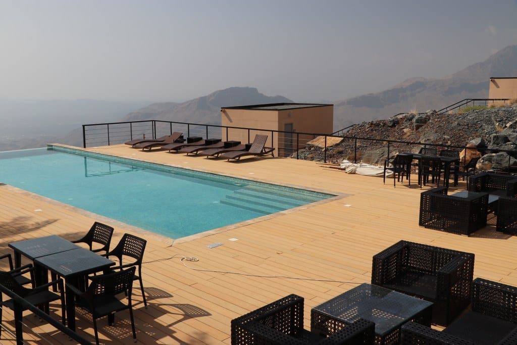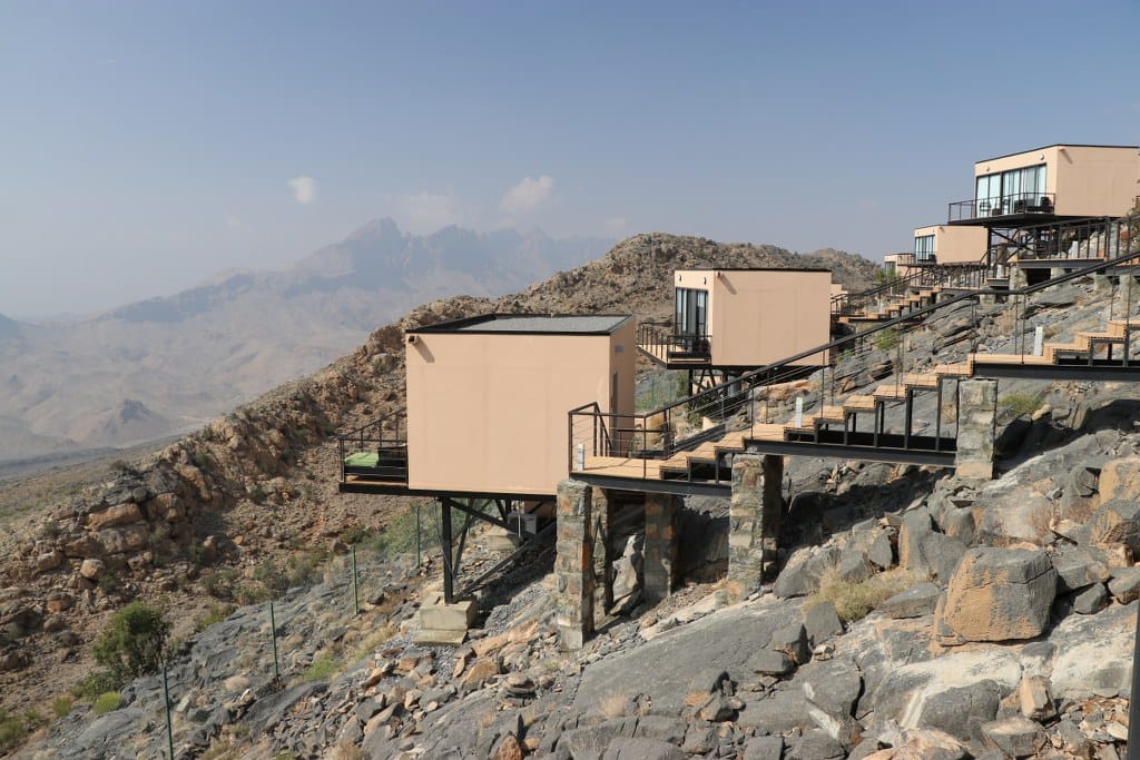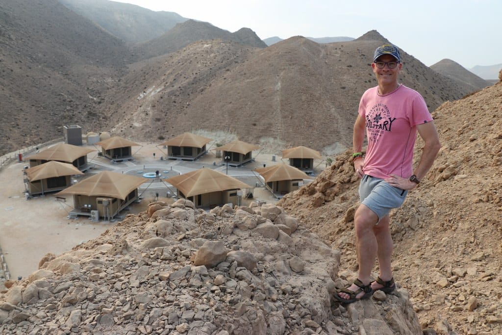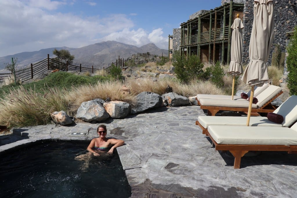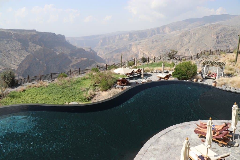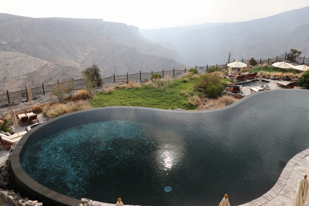 We rijden ruim een prachtige bergpas naar boven om op 2.000 meter te gaan overnachten. Voordeel van het naar boven slingeren is dat ook de temperatuur zakt van 35 graden naar 18 graden, heerlijk! Rijden een klein uur omhoog voordat we onze bestemming bereiken. Aangekomen bij Alila Jebel Akdar, is een ding duidelijk, zo hebben we nog NOOIT overnacht! Een grandioos gave en uniek locatie, hier hebben ze “top of the bill” te pakken in Oman!