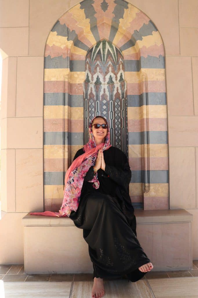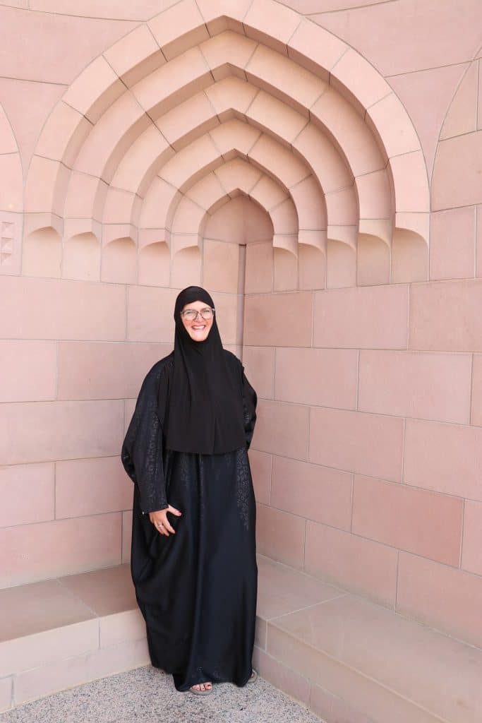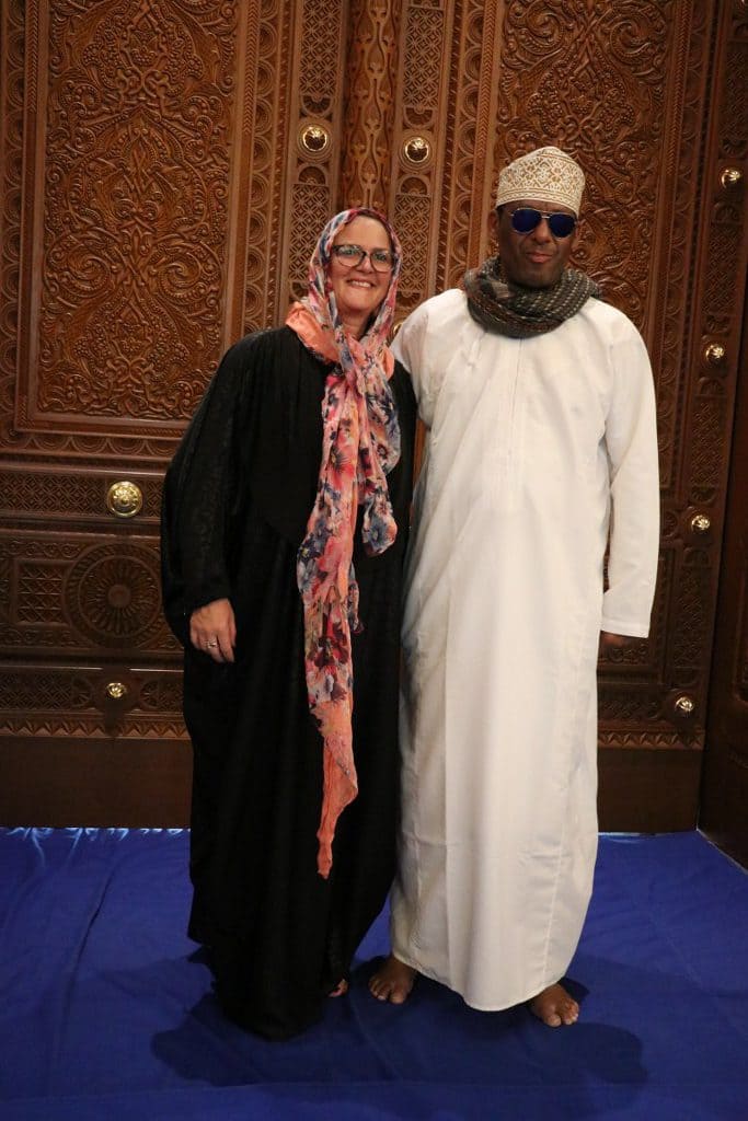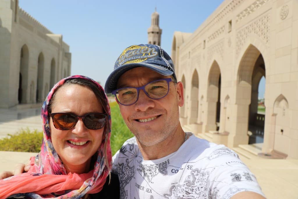 Beetje opschieten want na het afleveren van de auto hebben we ook nog met de dame van Zahara Tours gebabbeld, over onze opties in Oman. Goed gesprek, gedegen en interessante informatie. Wegwezen want The Grand Mosque is maar open voor niet-moslims tot 11.00 uur. We arriveren daar rond 10.00 uur, aangezien Jolanda een spleet in haar rok heeft mag ze niet binnen. We moeten dus een sluitend gewaad huren, yep islamitische landen kennen haar regels! Gelukkig ziet het er met een eigen sjaal beter uit.