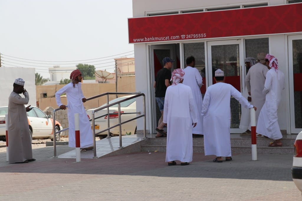 Weer door: Het is druk bij de Oman bank, dus wachten in het rijtje met de Omani, gezelligheid kent geen tijd maar de hitte kent wel tijd. Dus snel terug naar de airco van de auto.