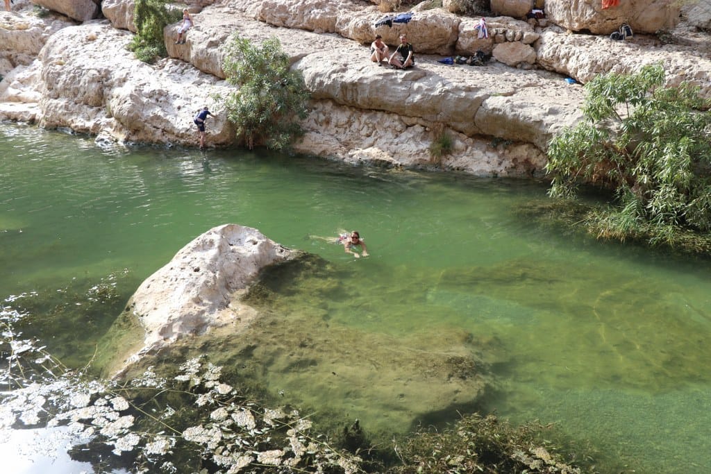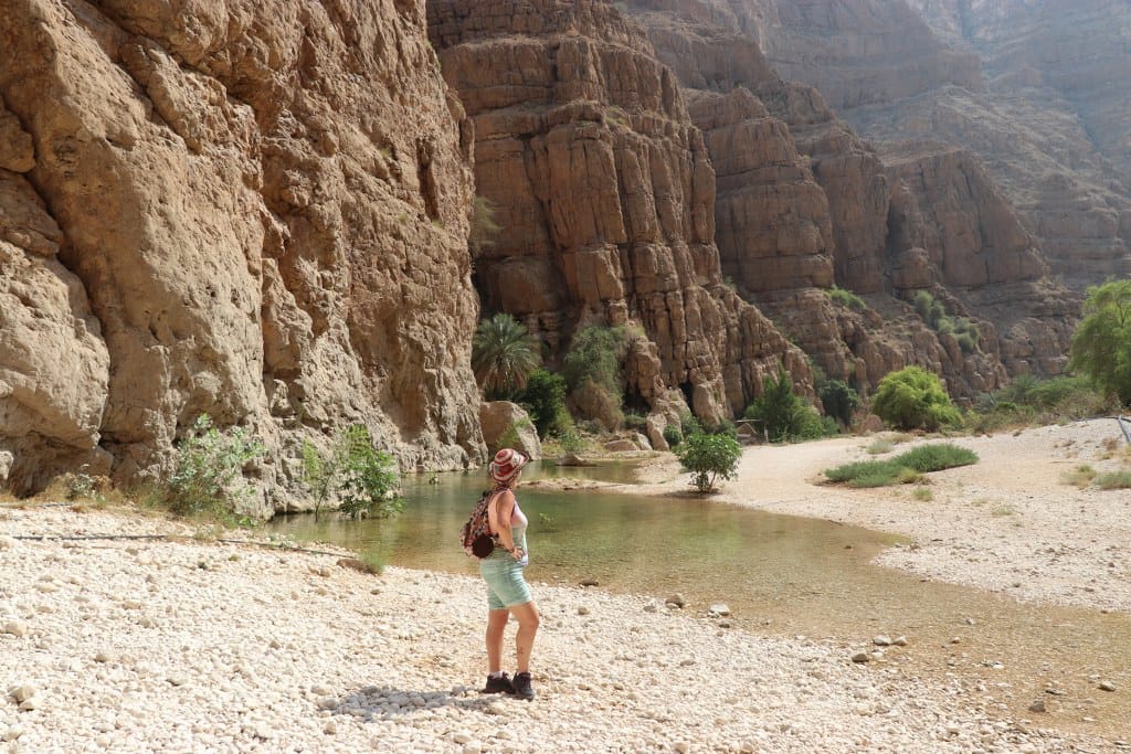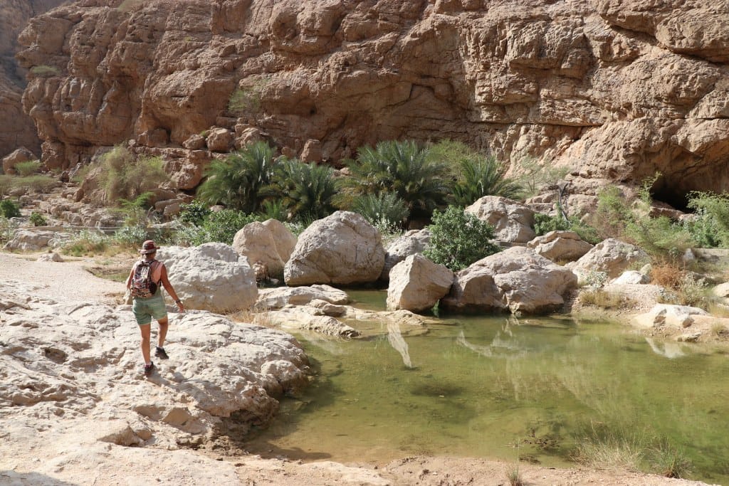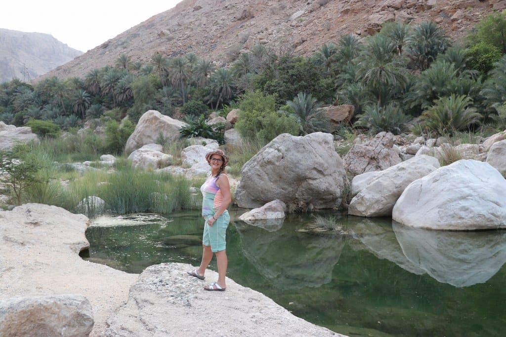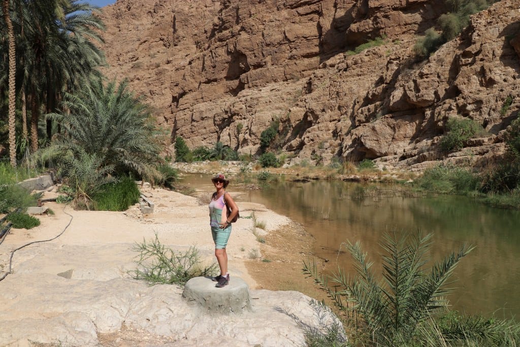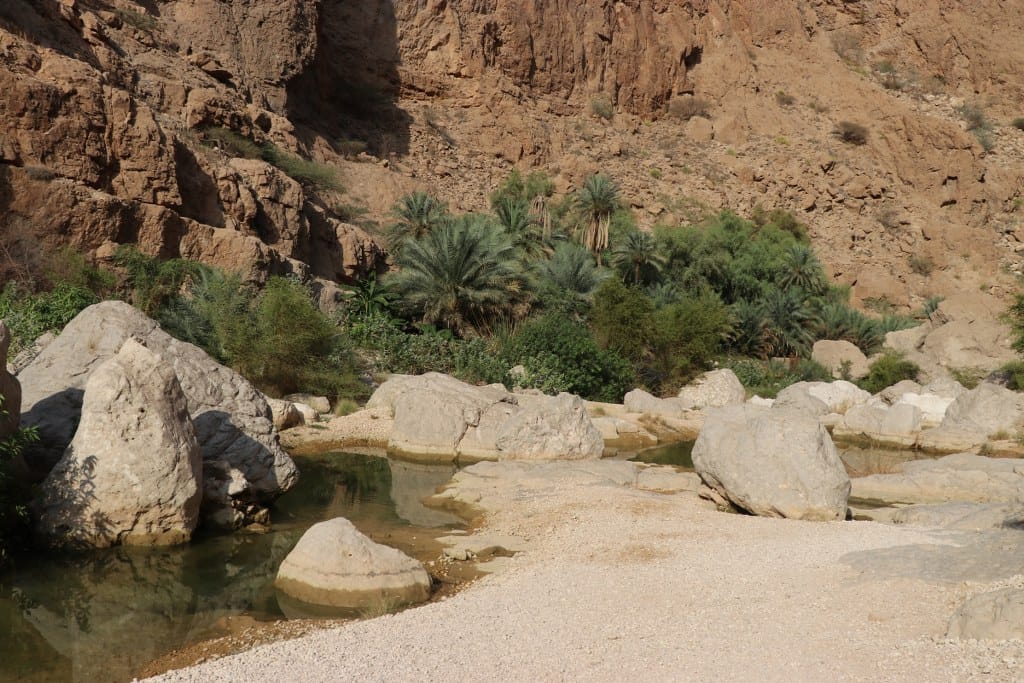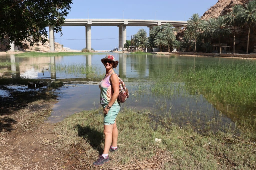 Wadi Tiwi ligt een paar kilometer verder op, hier kun je met de auto in dus we knorren nog een stukje deze Wadi in. Water in de woestijn, heerlijk!