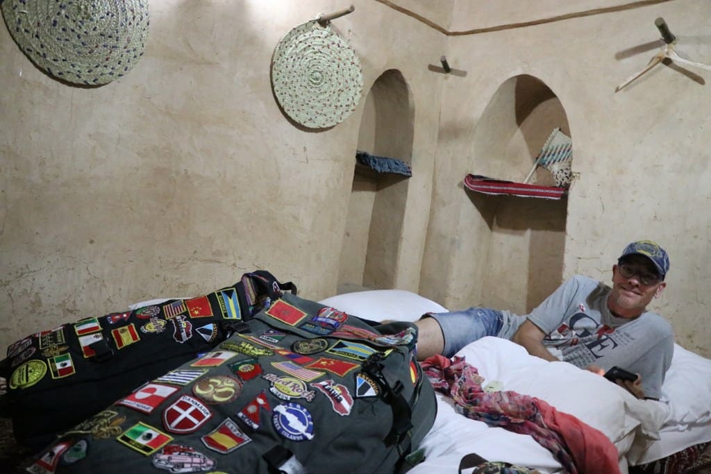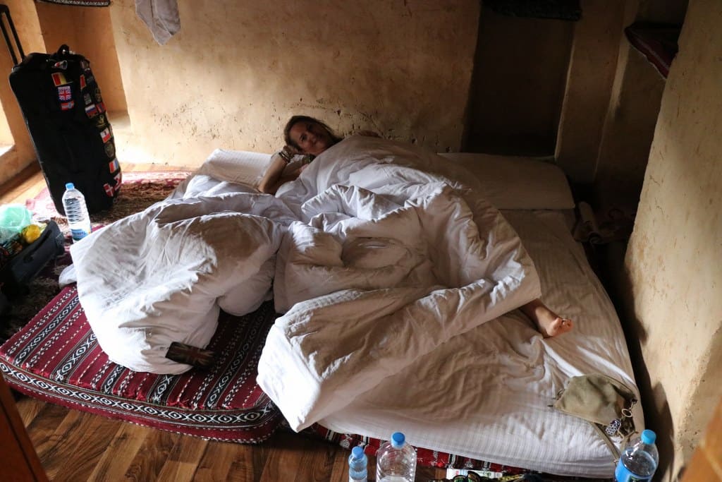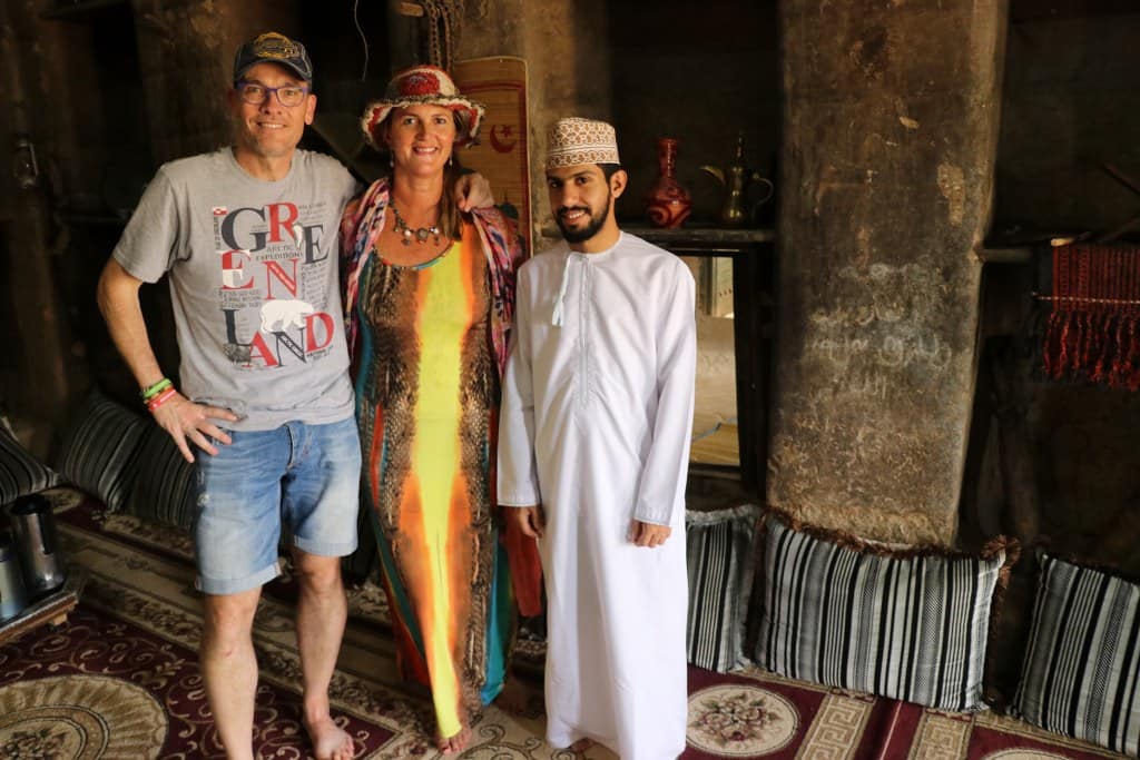 Yep, op de juiste locatie! Koffie met dadels…….. (een voorspelbare warme welkom). The Misfah Old House! een 150 jaar oud huis, wat altijd bewoont is geweest maar sinds 2009 dienst doet als guesthouse. Het eerste Guesthouse van Oman! Beetje opgeknapt maar verder nog erg authentiek, we slapen op de grond.