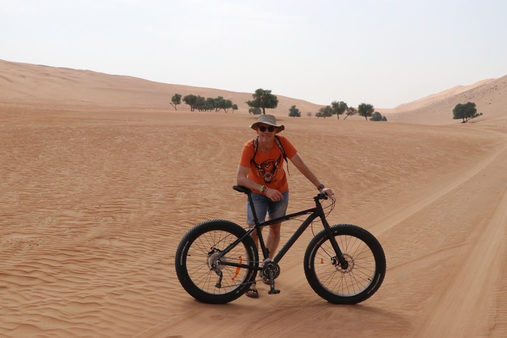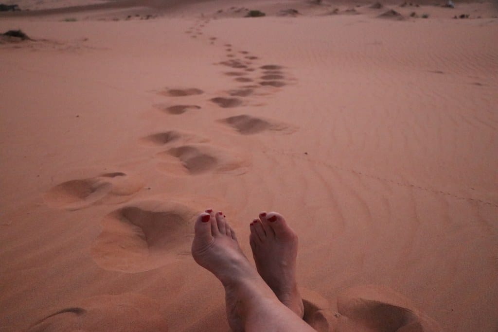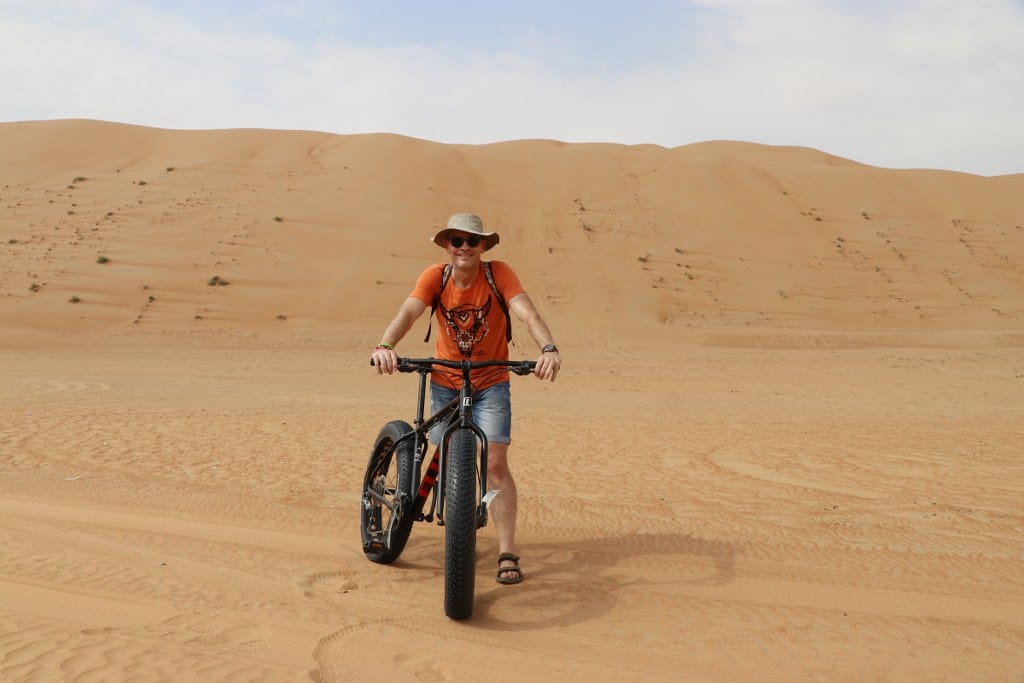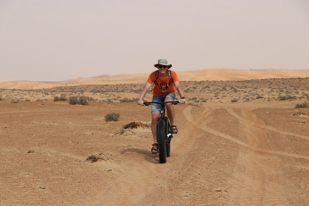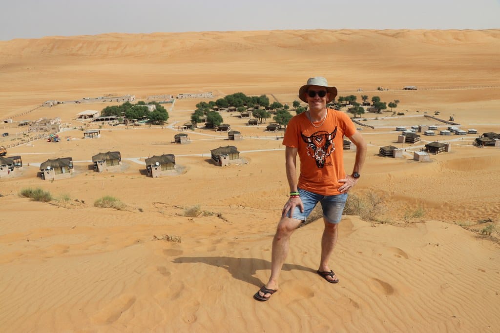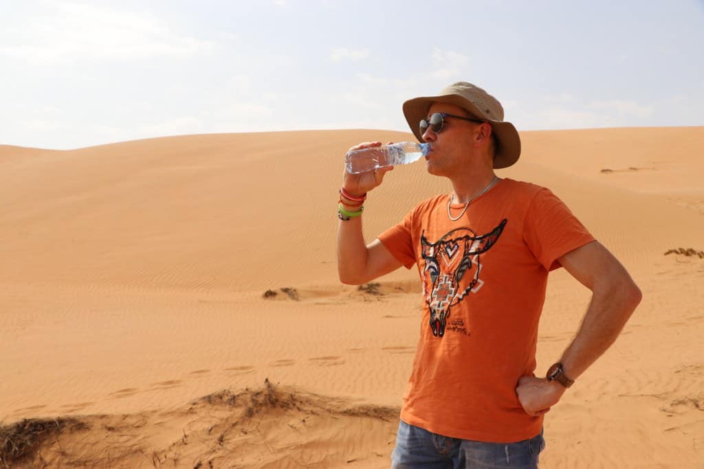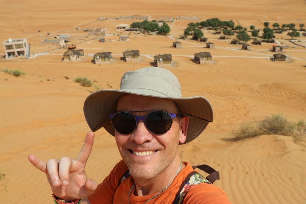 Goed bezweet weer terug op ons kamp, is toch pittig sand-bikibg in de woestijn! We zouden de sand-bikes een uurtje huren maar komen uiteindelijk, goed bezweet, pas na een dikke twee uur terug. Weer een gave beleving rijker! Wij sparen ervaringen…….. Kleine aanpassing van de kleding want op ons “prive-programma” staat nog de zandduin beklimmen bij ons Camp, leuk voor enkele overzichtsbeelden. Yep, op het heetst van de dag rond 12.00 uur vertrekken we richting, de achter ons Camp gelegen duinen. We wilde op blote voeten, nee dat is echt niet te doen. Dit zand is niet warm maar bloedheet. We hebben een gave fotoshoot vanuit de zandduinen. Geweldig gebied en de moeite waard om onze voeten te laten verbranden. Veel drinken dus……..