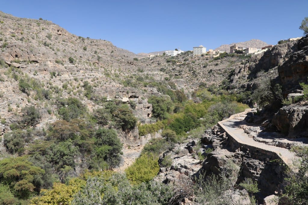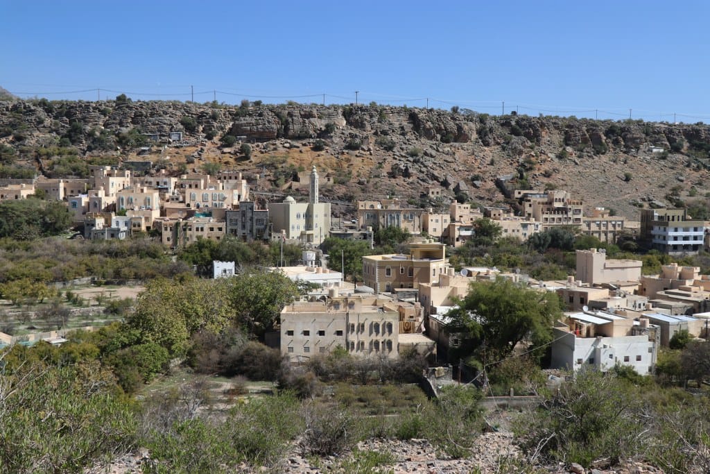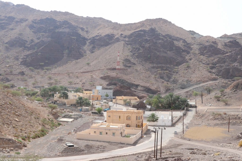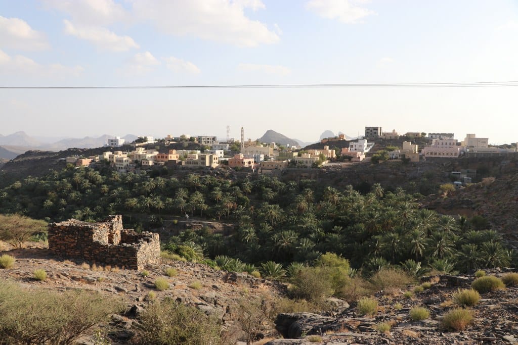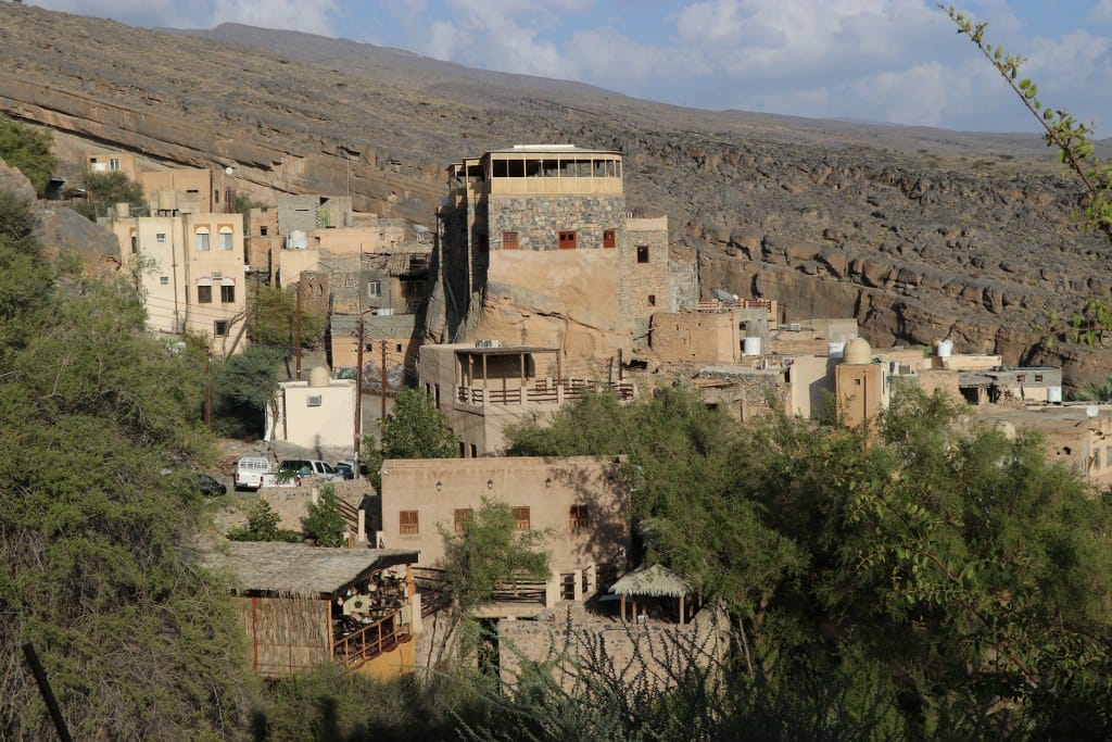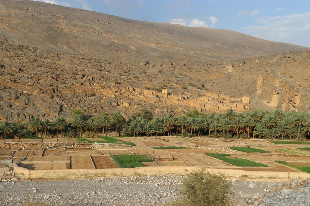 We komen onderweg nog enkele huisjes tegen, na een 75 minuten gaat de weg weer over op asfalt, een verademing en ff de beentjes weer wat lostrappen. Onze gids heeft het moeilijk want die kan ons nauwelijks bijhouden als we ff goed doortrekken, we moeten soms op hem wachten. We arriveren in een prachtig dorpje aan een wadi waar volop verbouwd wordt. Leuk om te zien, echter de mensen hier gaan niet zo graag op de foto. De Omani hebben nog lang niet allemaal in de gaten wat toerisme voor hun land kan gaan doen, begrijpelijk ook. Vooralsnog is olie altijd de belangrijkste inkomstenbron geweest. Te weten dat iedereen hier nog geen 50 jaar geleden op een ezel rond knorde, heeft de huidige Sultan voor een ommekeer in dit land gezorgd. Auto’s waren hier nauwelijks tot 50 jaar terug. Daarbij is, zoals we al eerder vermeld hebben, het toerisme nog maar enkele jaren op gang aan het komen. Dit zal zeker gaan toenemen de komende jaren.