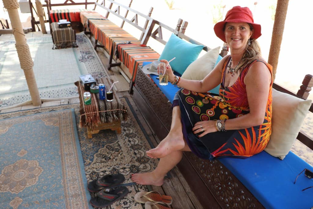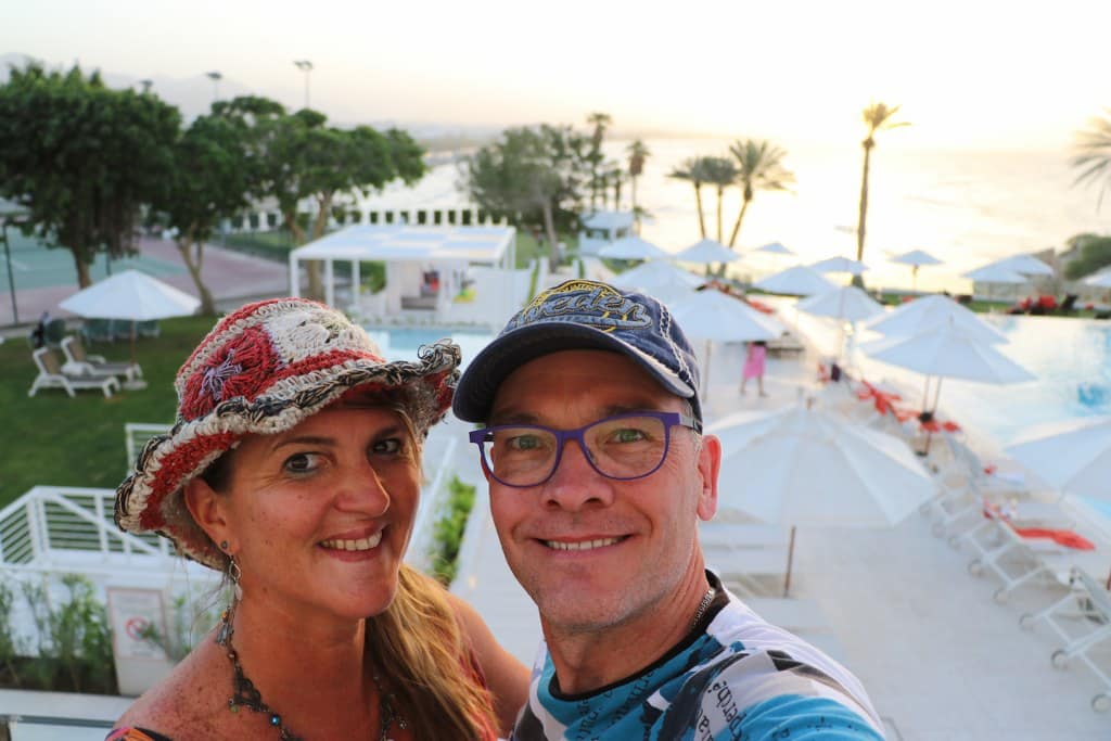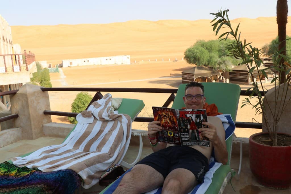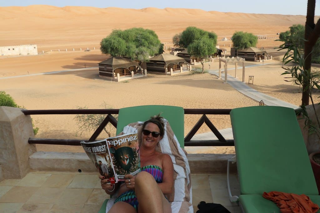 Het zou koud worden in de woestijn, erg blij dat we onze handschoenen en muts meegenomen hebben……. Waar is dan die kou? In plaats van kou, zwetend wakker! Na de lunch relaxtijd (dik verdiend!) aan het zwembad in de woestijn! Heerlijk! Voor de oplettende lezer, Ruud met d’n Aardschok en Jolanda met de Happinez.