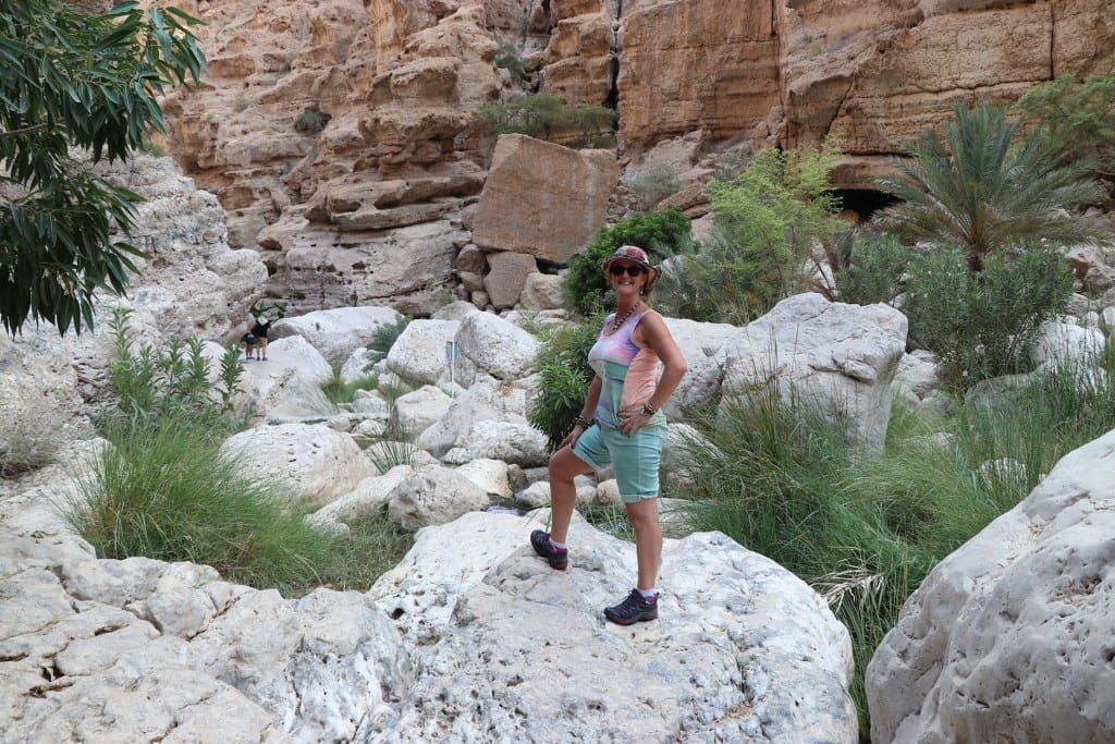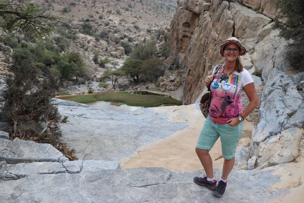Onze “pad”, niet gek dat Jolanda nog een slipper maakte en behoorlijk hard op de rotsen viel. Gelukkig niks gebroken, bebloed e.d. dus ff zitten, water en door. Bidden doen de moslims overal, zo ook hier in het water van Wadi al Shab.