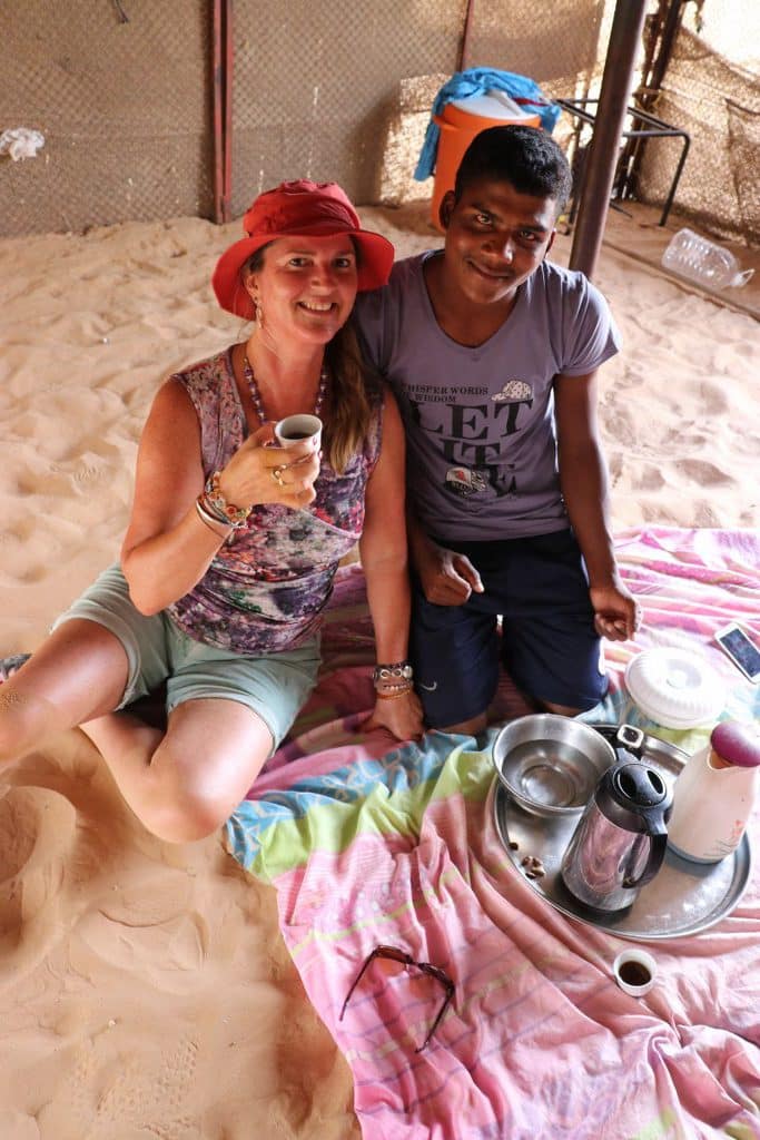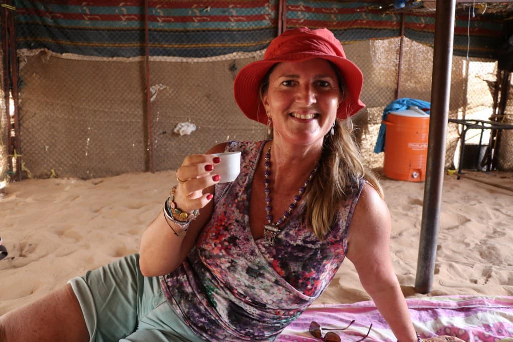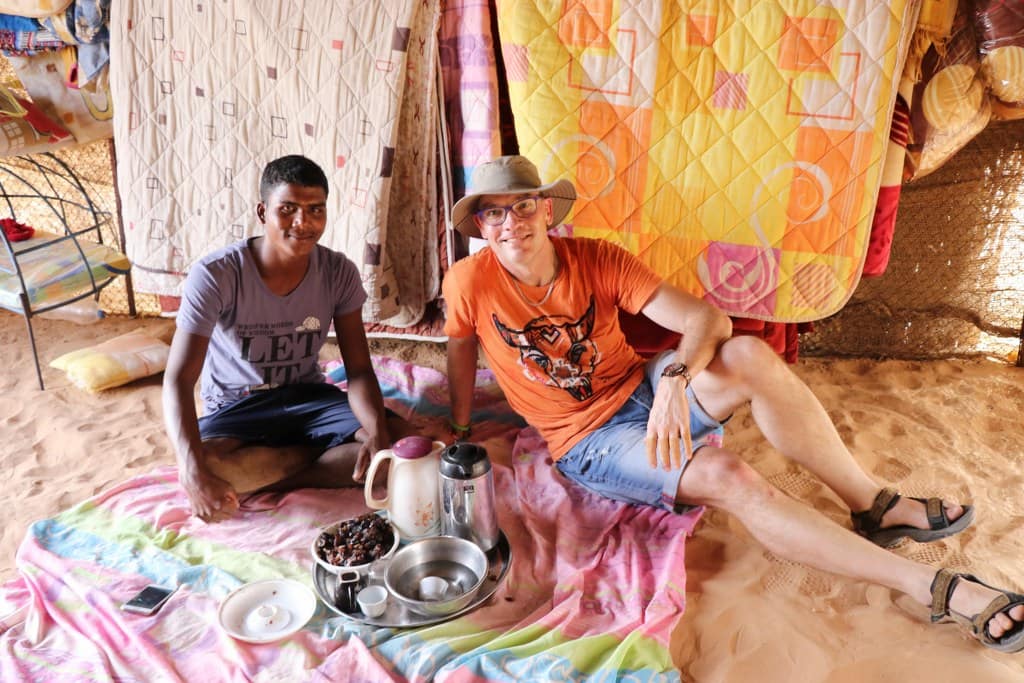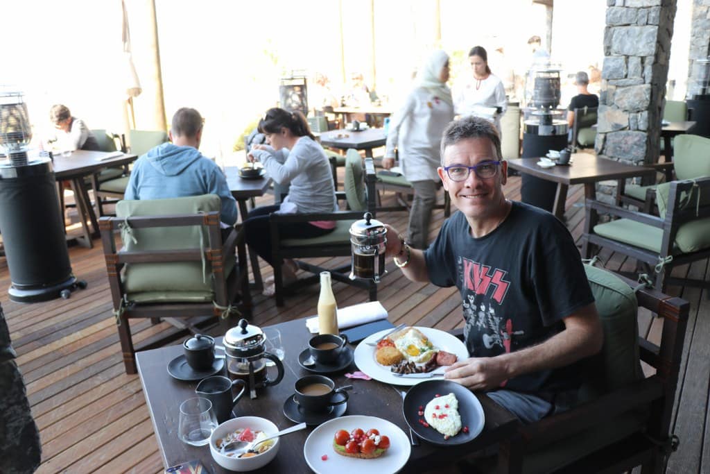 Rond 06.30 uur zijn we terug en staat het ontbijtbuffet voor ons klaar. Yep, honger zin in koffie. Wij zijn immers alweer 2 uur paraat en actief bezig geweest. Na het ontbijt is het tijd om te douche en onze tent weer leeg te maken, uitchecken en op naar de woestijn.