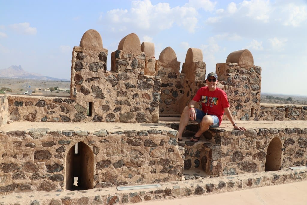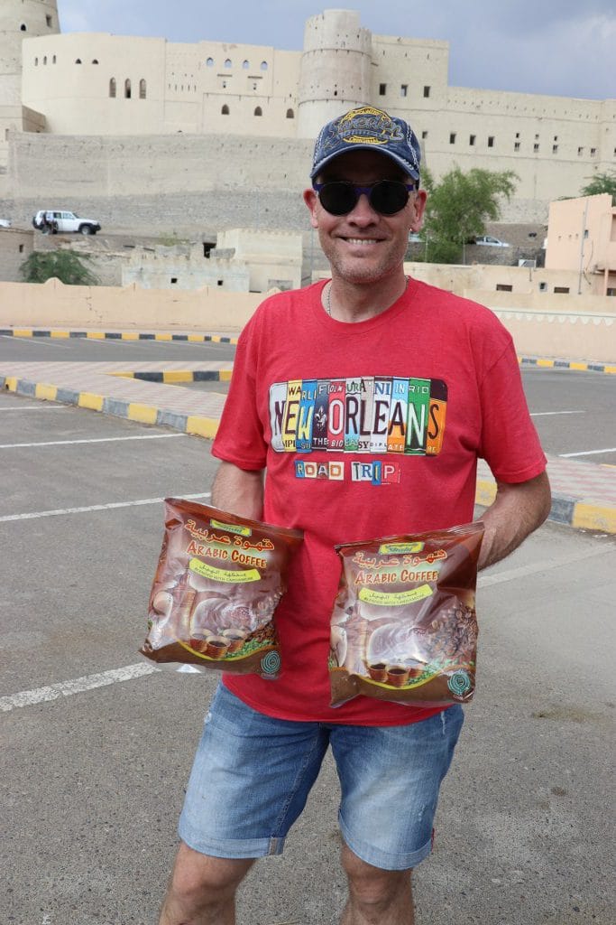 YEAH! Wij hebben Oman/Arabic coffee gescoord, deze koffie wordt hier overal geschonken en gaan we zeker thuis ook nog ff van genieten. Ze drinken hier overal ontzettend veel melk en suiker in de koffie en thee, dus opletten want voordat je het weet heb je een “niet te drinken” bakkie in handen. De Arabic koffie wordt puur gedronken in een klein kopje en om het zoetige wat bij te staan worden er altijd dadels bij geserveerd. Foto stop bij het imposante Fort Bahla wat omgeven wordt door wat oude- en verlaten klei huizen. Fort Bahla is terug te vinden op de lijst van Unesco, lijst 433. O ja, we voelen regendruppels……… Enkele druppels vallen naar beneden, maken we dat toch ook nog ff mee, regen in Oman. Diverse gedeelte zijn nog niet opgeknapt en zijn nog in originele staat! Heeft zeker ook zijn charmes.