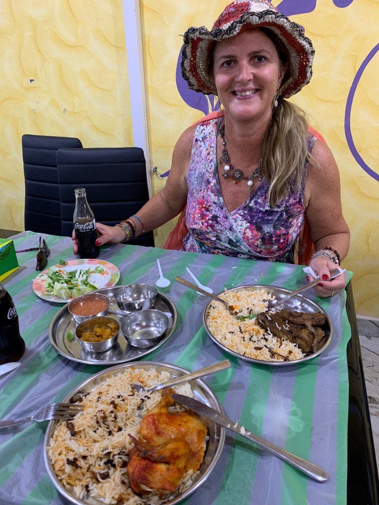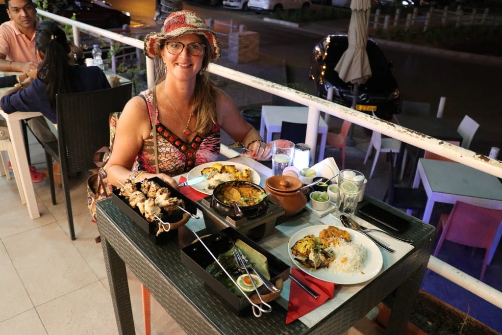 We wilden gaan eten bij een “Oman food” restaurant, hadden we doorgekregen van de dame van Zahara Tours, echter het restaurant zat vol. Pech dus! We doen wel een reservering voor morgenavond, dus we’ll be back! Voor nu dus iets anders, we krijgen van een erg vriendelijke taxichauffeur een ander adresje door wat we uiteindelijk niet konden vinden. We belanden aan bij Spice Bahar, geen foutieve keuze! We laten ons verrassen deze avond met vis, kip, garnalen, rijst en groente. Resultaat: overheerlijk gegeten.