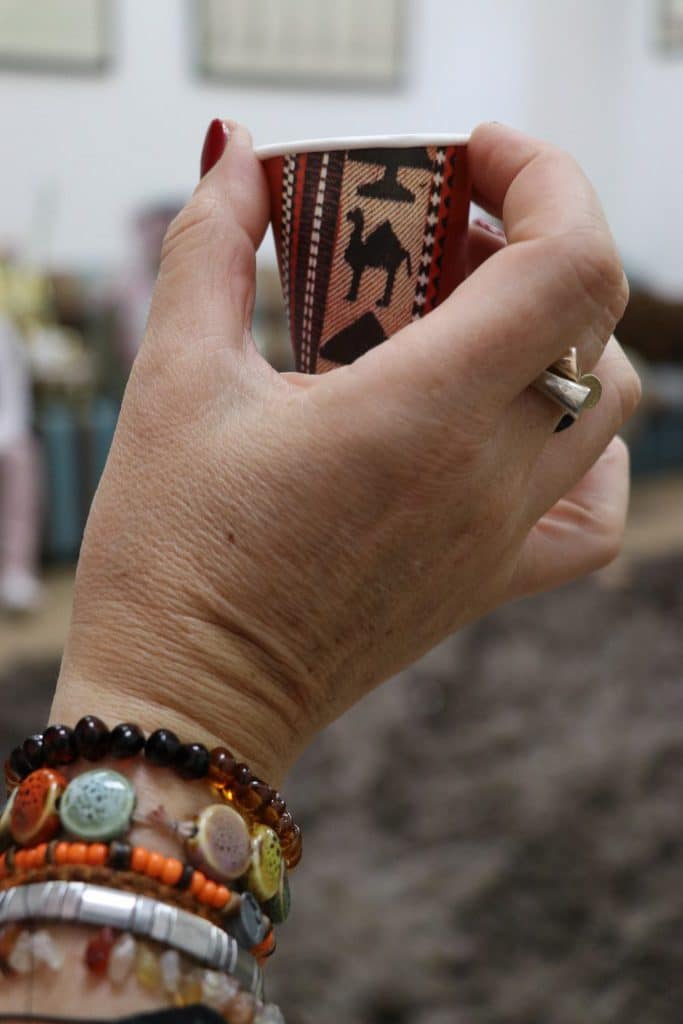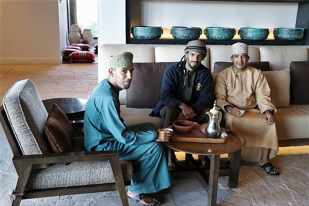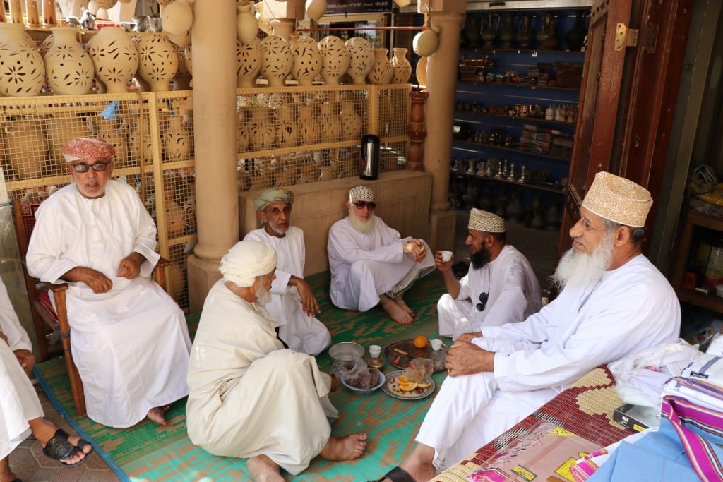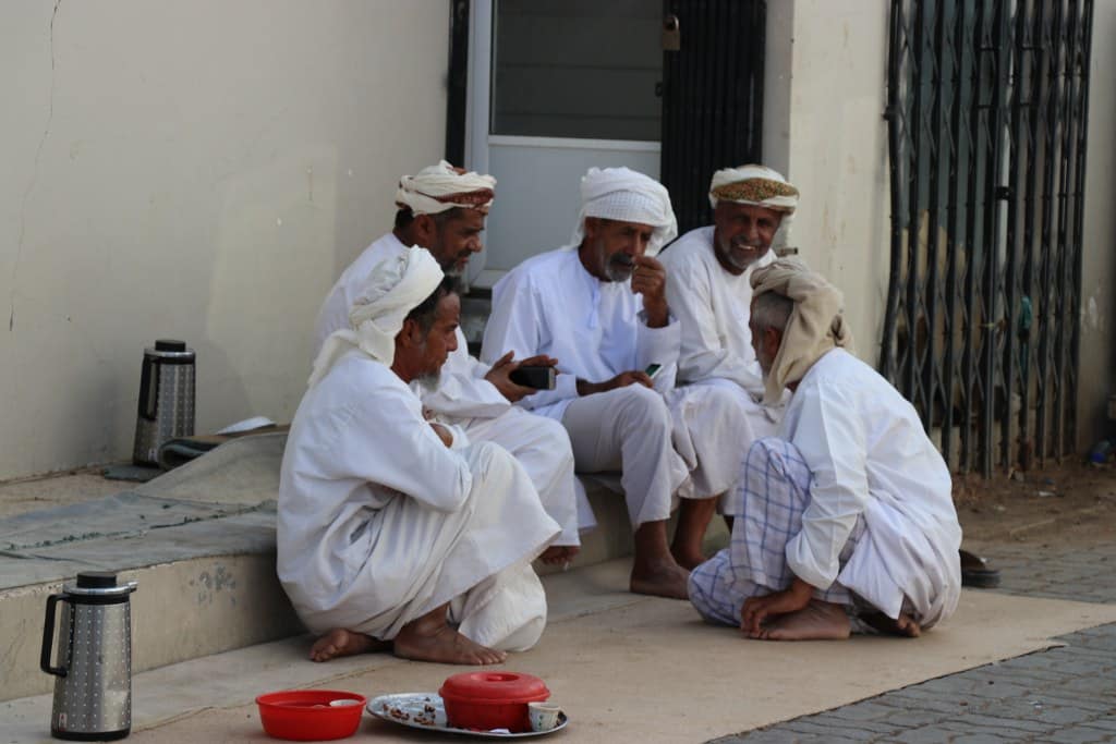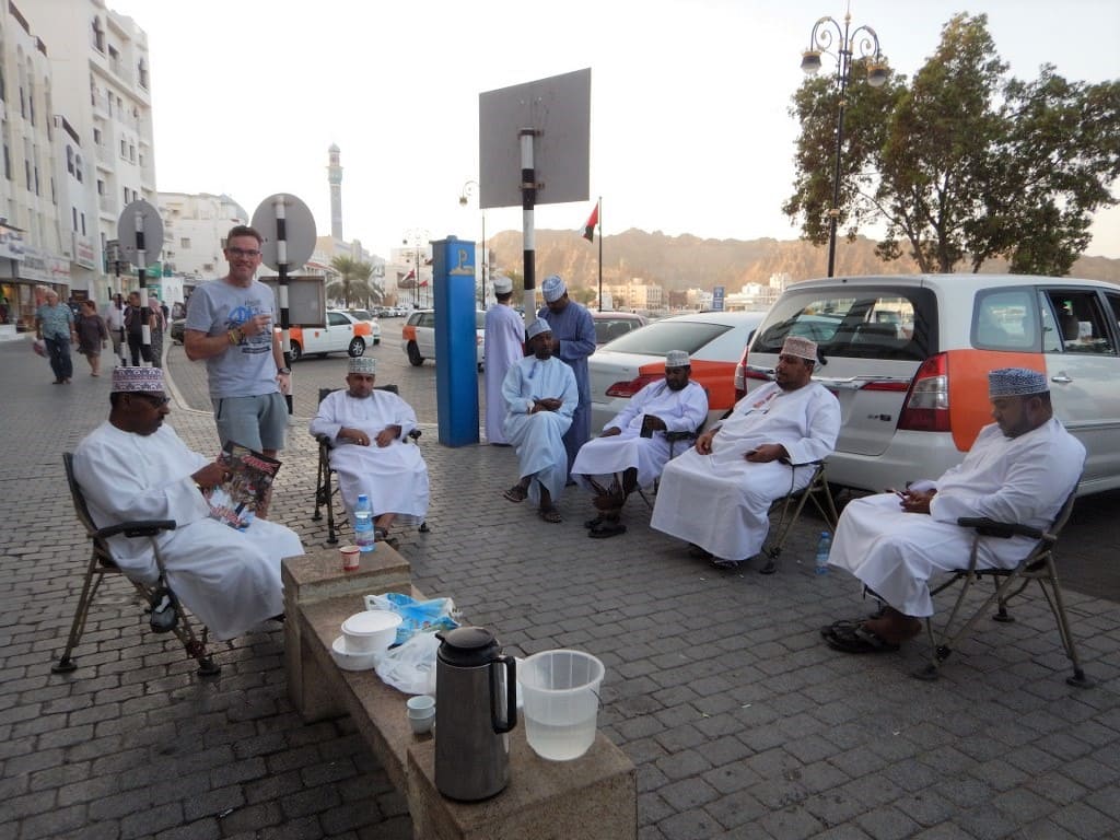 Koffietijd! We zien een groep Omani aan de koffie op straat, we weten inmiddels hoe gastvrij ze zijn dus we vragen of de koffie klaar is? Yep, wij mogen een bakkie meedoen op straat.