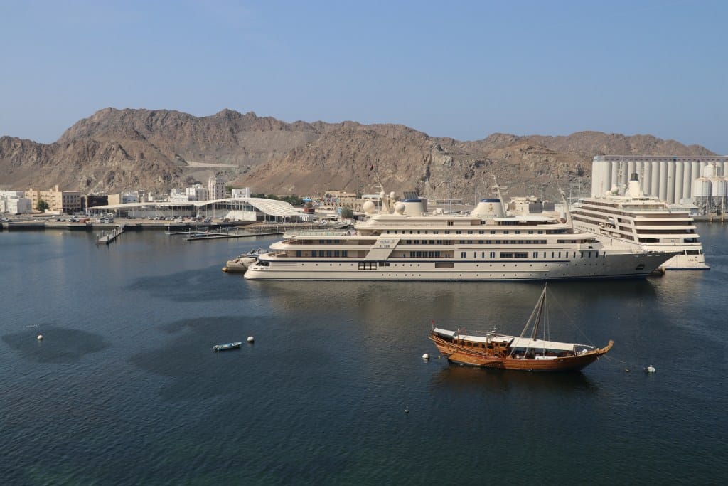 ff naar huis bellen…….. Na de koffie wandelen we naar het Muttrah fort wat uitkijkt over Muttrah. Prachtig plaatjes vanaf boven, yep dit is genieten! 38 graden vandaag dus het klimmetje naar boven hakt er ff in. De twee “bootjes” van de Sultan, worden nauwelijks nog gebruikt omdat de leeftijd van de Sultan het niet meer toelaat er veel gebruik van te maken. Ach ja, de bootjes liggen er mooi bij……..