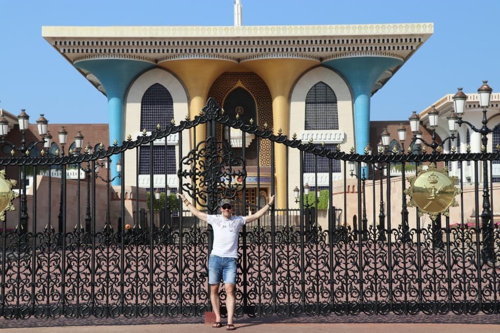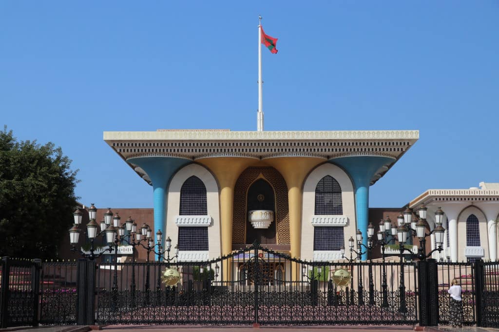 Al Alam palace, gebouwd in 1972 als Royal Residence! In Oman, dan mag je dit gebouw inclusief de prachtige omgeving niet missen. Je mag er niet in maar de omgeving alleen al is erg bijzonder. Het plein is leeg dus de toeristen zijn vandaag beperkt aanwezig. Goud en blauw!