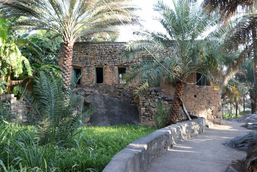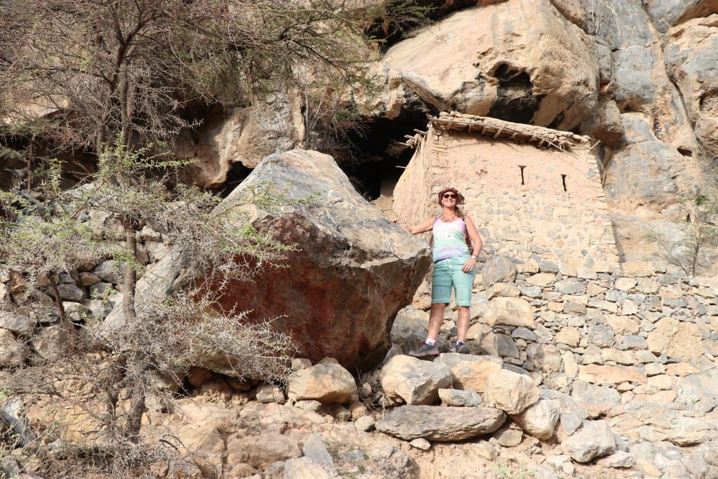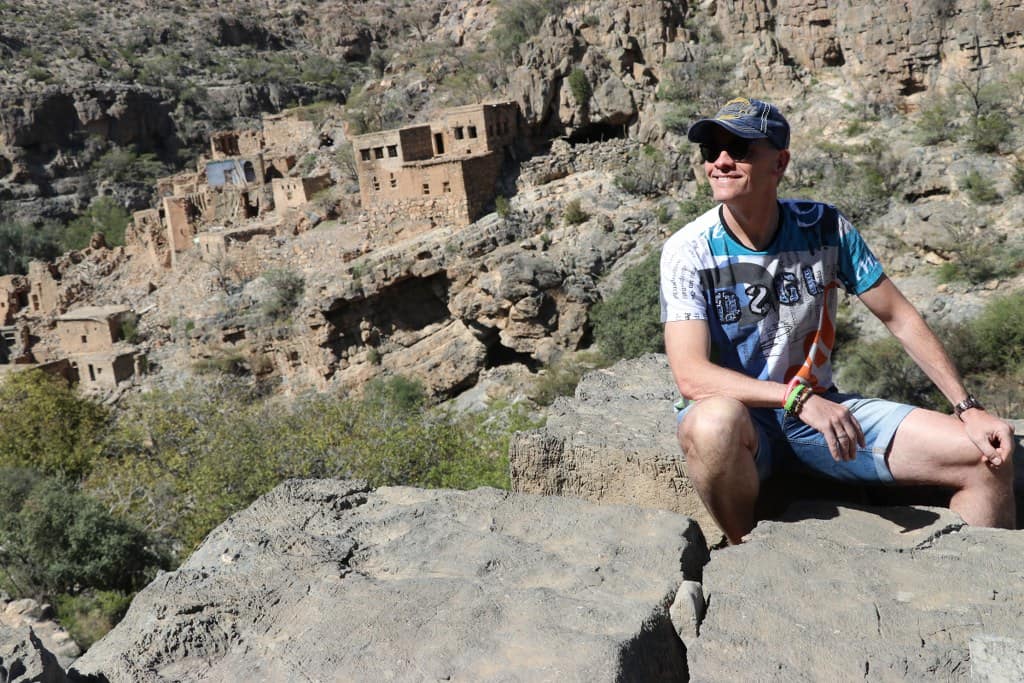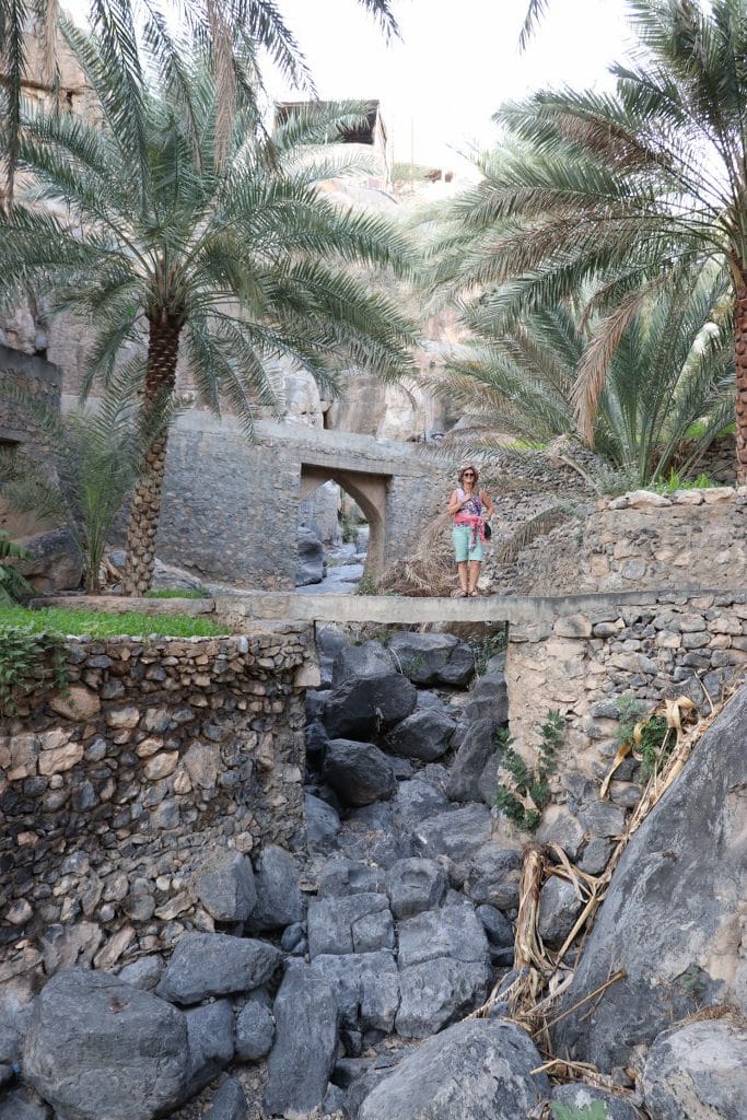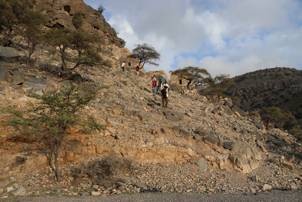 Dag helemaal niks doen, blijkt toch lastig voor deze twee. Ondanks de actieve start van de dag, gaan we toch om 15.00 uur mee met de Mountain Walk. Eerst vijf minuutjes met de auto en vandaar uit vertrekt ons tochtje. We bezoeken het oude gedeelte van Alila, waar de mensen nog maar 25 jaar geleden zijn vertrokken en de oude dorpje al enkele honderden jaren geleden gebouwd is. Aan de andere kant van berg ligt een vergelijkbaar dorpje, daar woonde de mensen in de winter, in de zomer verbleven ze hier. Alles werd per ezel en/of op de rug/hoofd naar de huisjes gebracht. Miljoenen jaren geleden lag dit gedeelte van Oman volledig onder water, zeewater, dat is de reden dat je in de bergen de fossielen van koraal en waterplanten nog steeds aantreft in het gesteente.