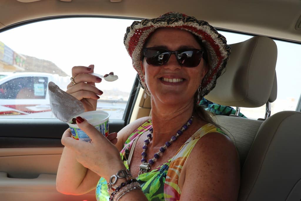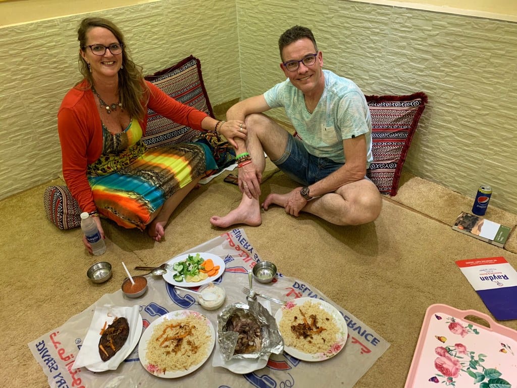 Dit was maximaal genieten! Traditional Oman food, lamsvlees wat een uur of zes gegaard wordt in de grond. Overheerlijk! Wijntje er bij? Nope, er wordt nergens alcohol geschonken, dus uit eten met sparkling water, niks mis mee en net zo gezond! In de bar van ons hotel kunnen we wel een biertje/wijntje krijgen, dus daar maken we bij terugkomst nog ff gebruik van.