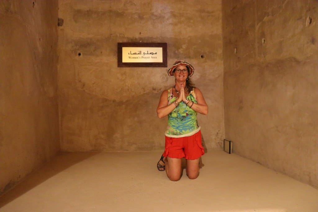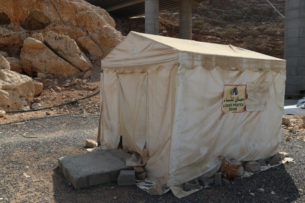Onze volgende stop is Wadi al Shab, een Wadi is een rivierdal. Kennelijk is deze erg bijzonder en dat willen we dus niet missen. De wandelschoentjes want het is vanaf hier zo’n drie kwartier wandelen (enkele reis) alvorens de wandelkleding kan worden omgewisseld voor de zwemkleding, rugzakje mee dus. Vijf keer per dag moet er gebeden worden en aangezien Oman maar zo’n 14.000 Moskeeën telt is het dus ook noodzakelijk om nog enkele mobiele bidplaatsen te realiseren. Deze is speciaal voor de ladies!