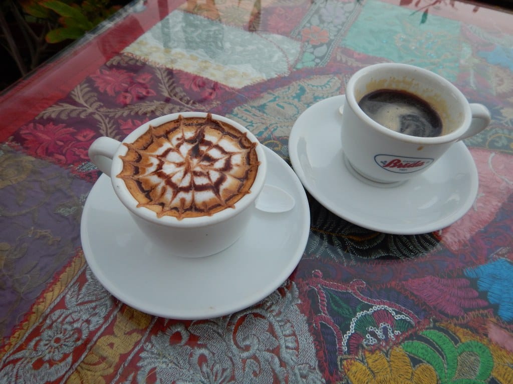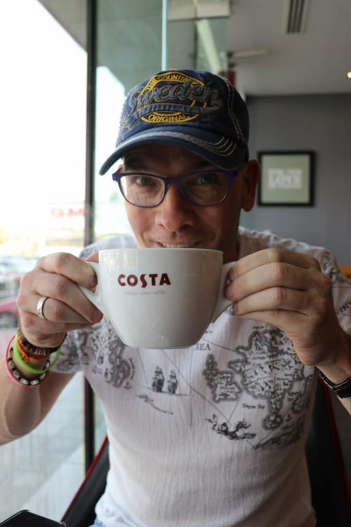 Gesloten, dus we moeten via een andere uitgang naar buiten om van Jolanda’s “gewaad” af te komen. Gelukkig zaten de dames daar nog op ons te wachten. Een bijzonder bouwwerk en een bijzondere ervaring, we zoeken het dan ook wel op en dan wordt het van zelf bijzonder! Koffietijd in de nabij gelegen Costa, die hebben ze hier dus ook! Klein, middel of groot? Doe maar groot, conclusie: een “soepkom” vol koffie!