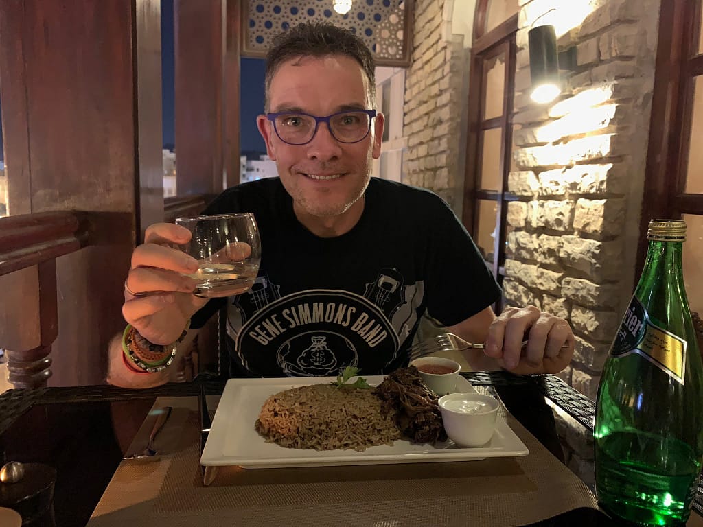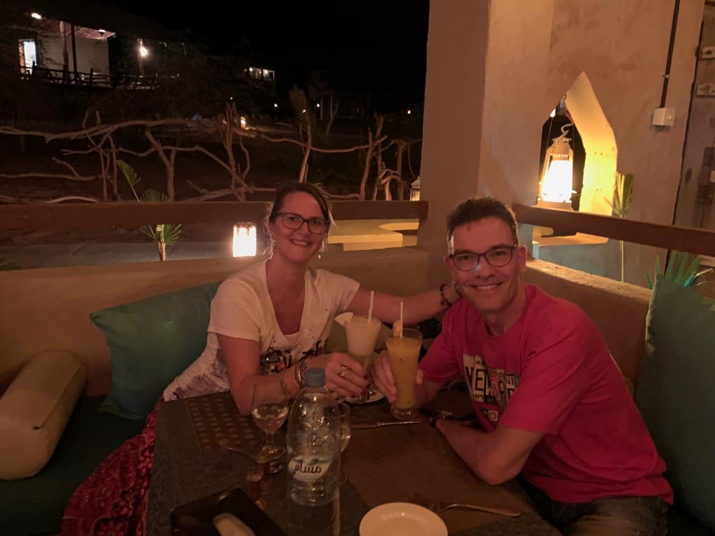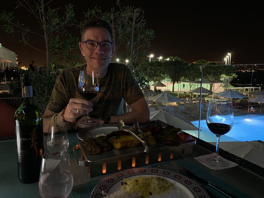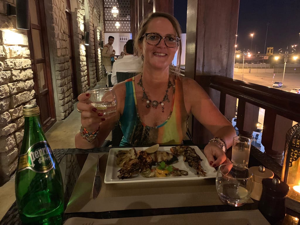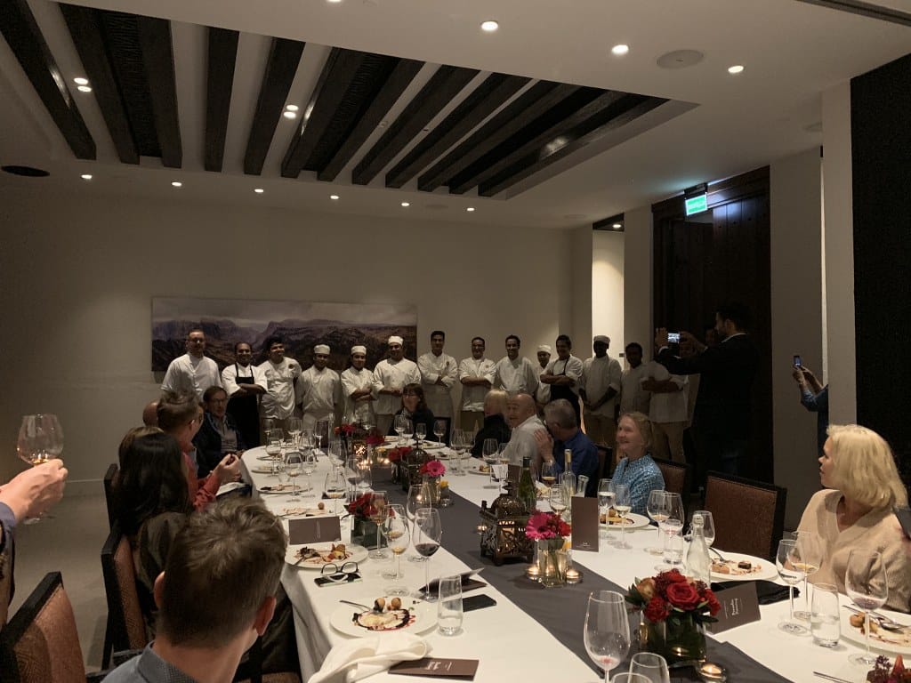 Rond 20.00 uur schuiven we aan voor diner. Wat maken wij hier allemaal weer mee! Een vertegenwoordiger van de Familie Torres uit Spanje komt hier zijn wijnen promoten. Uit het niets zitten we super chique te eten en te genieten met een gezelschap. Niet helemaal ons ding op reis maar we hebben overheerlijk gegeten en genoten. Best raar om zo te dineren midden in Oman! De vertegenwoordiger van de familie Torres ziet toch wel een grote opkomende markt in Oman voor wijnverkoop!